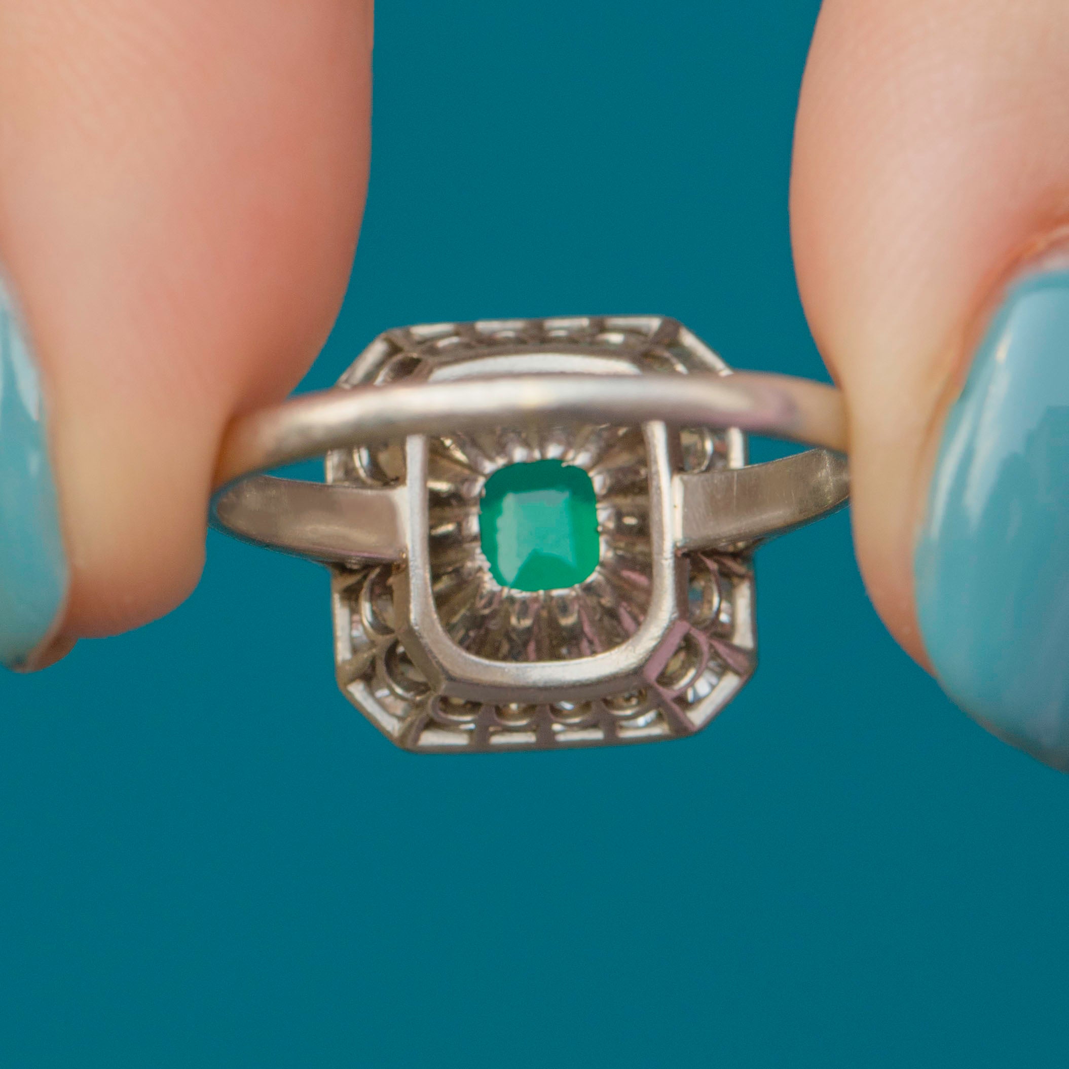 Art Deco Platinum Colombian Emerald Diamond Cluster Ring, 1.17ct Emerald