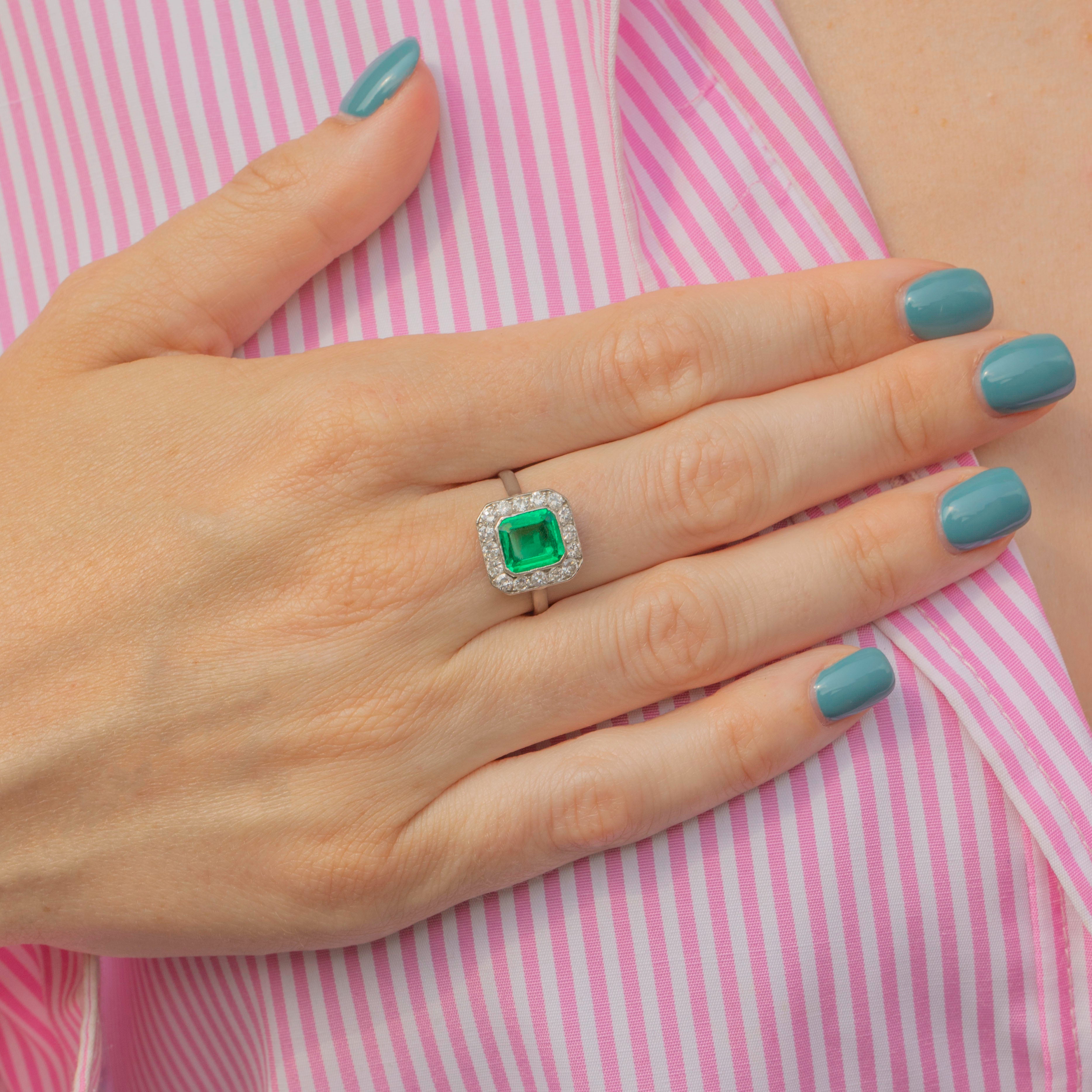 We are in awe of this certified Art Deco Platinum Colombian Emerald Diamond cluster ring! In true Art Deco style, this solid 1920's Platinum ring is sleek, symmetrical and has timeless appeal.