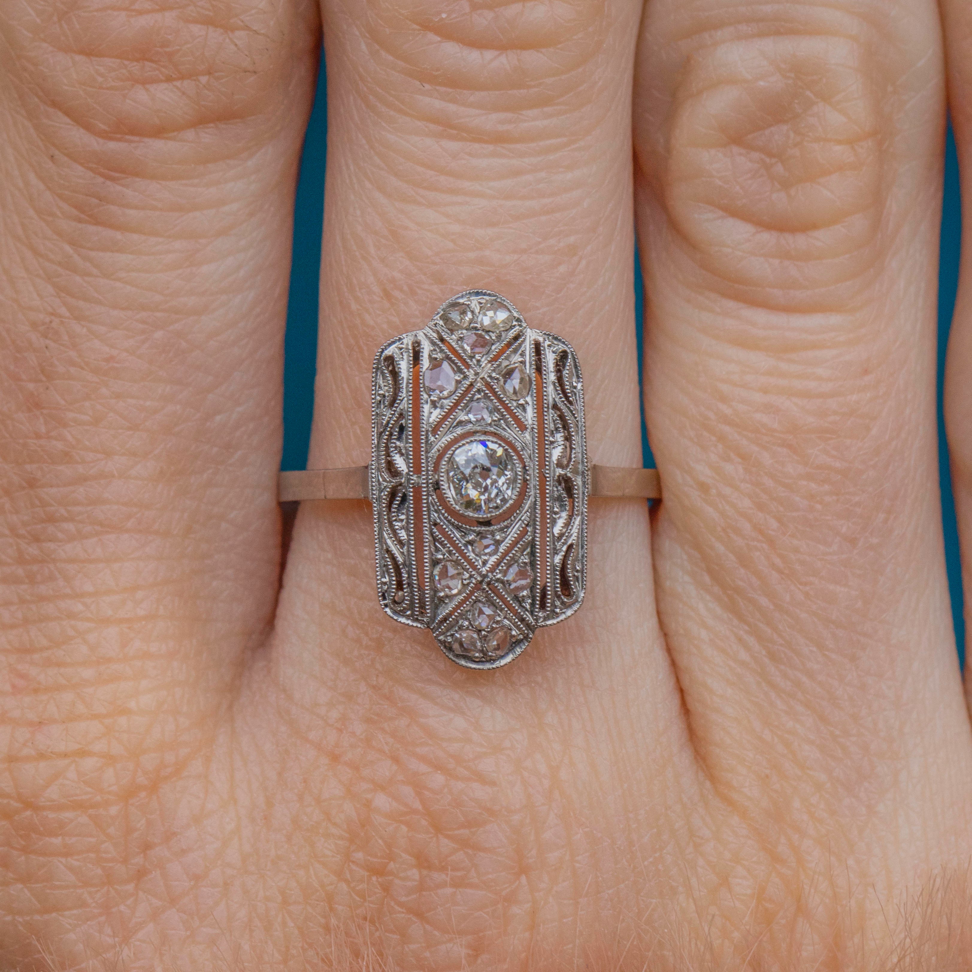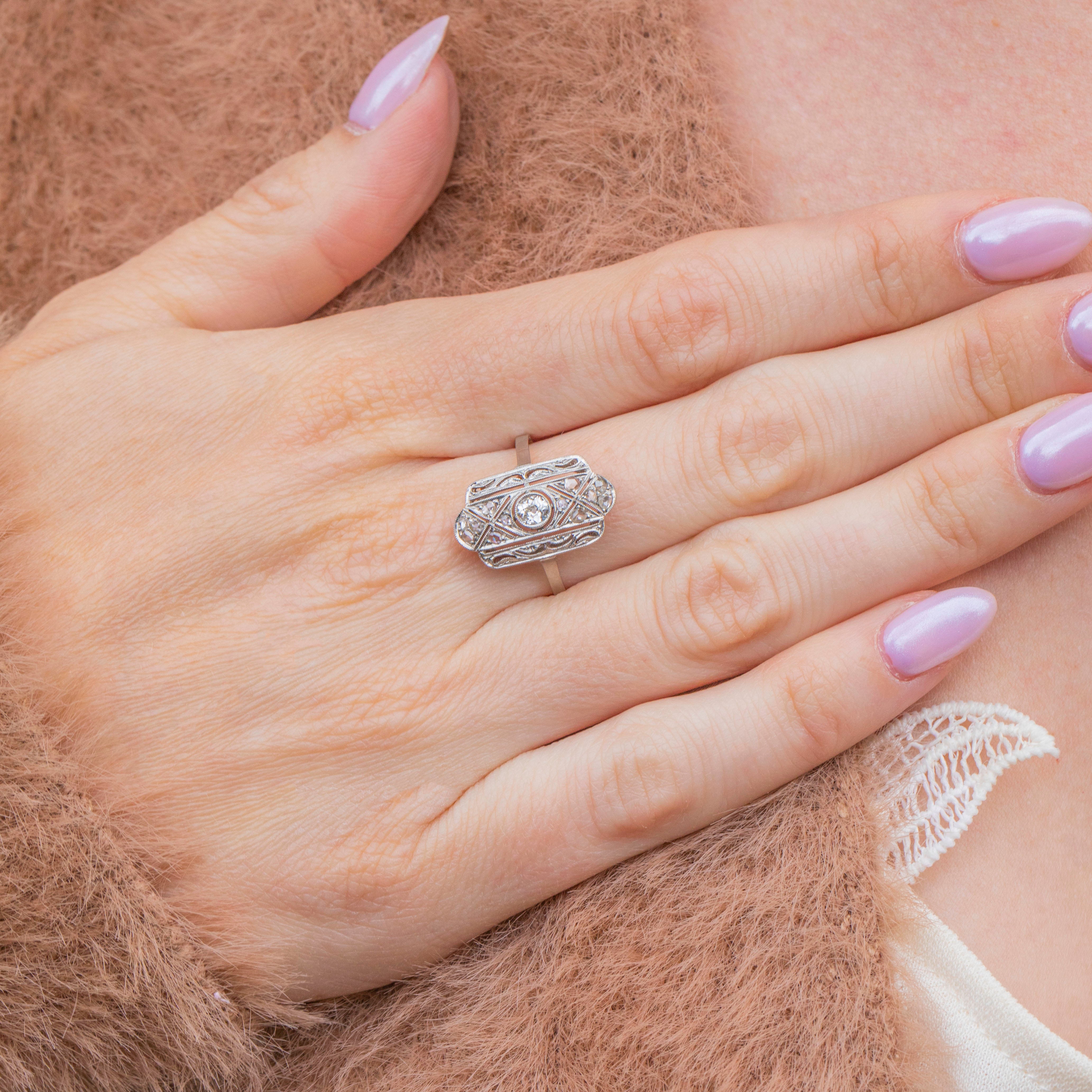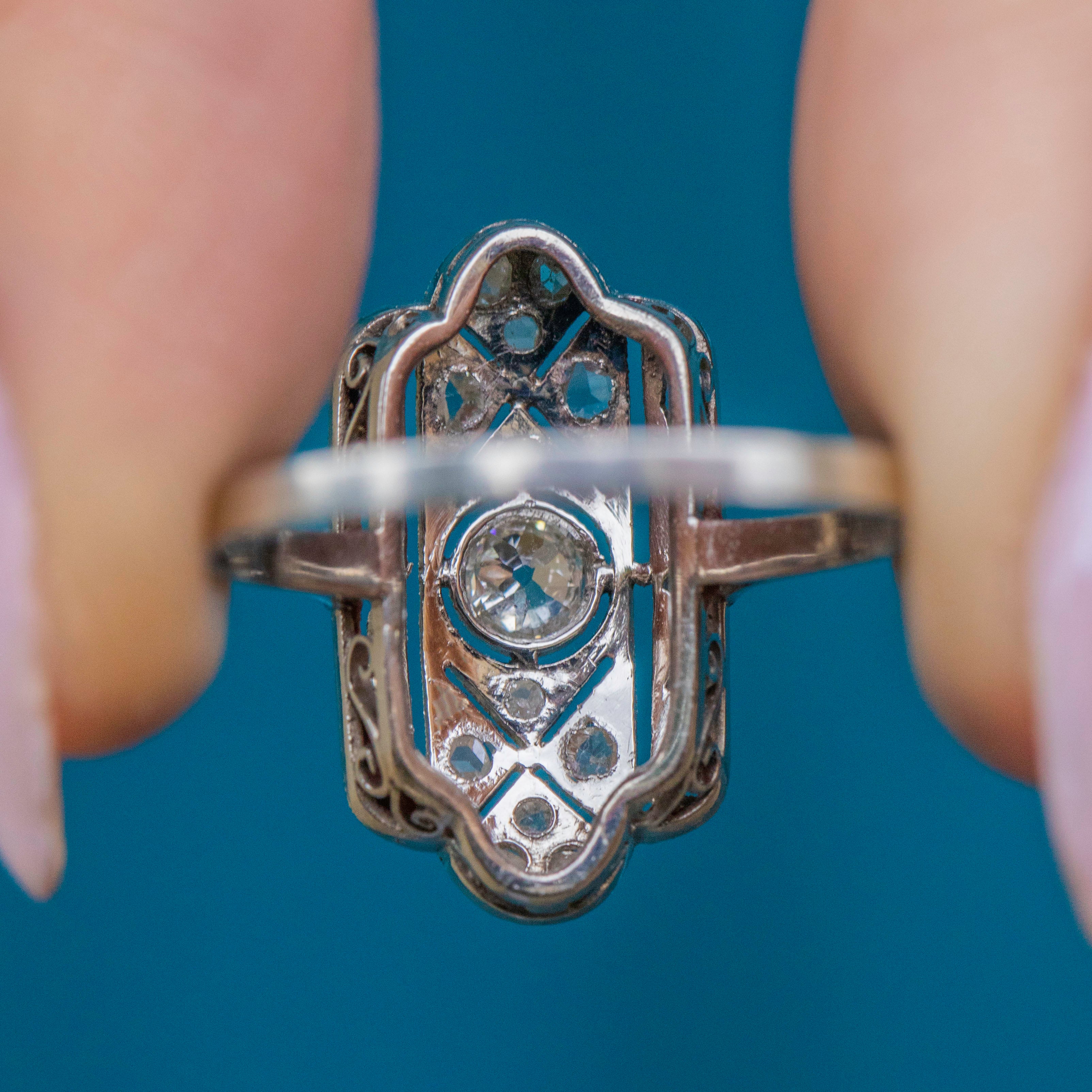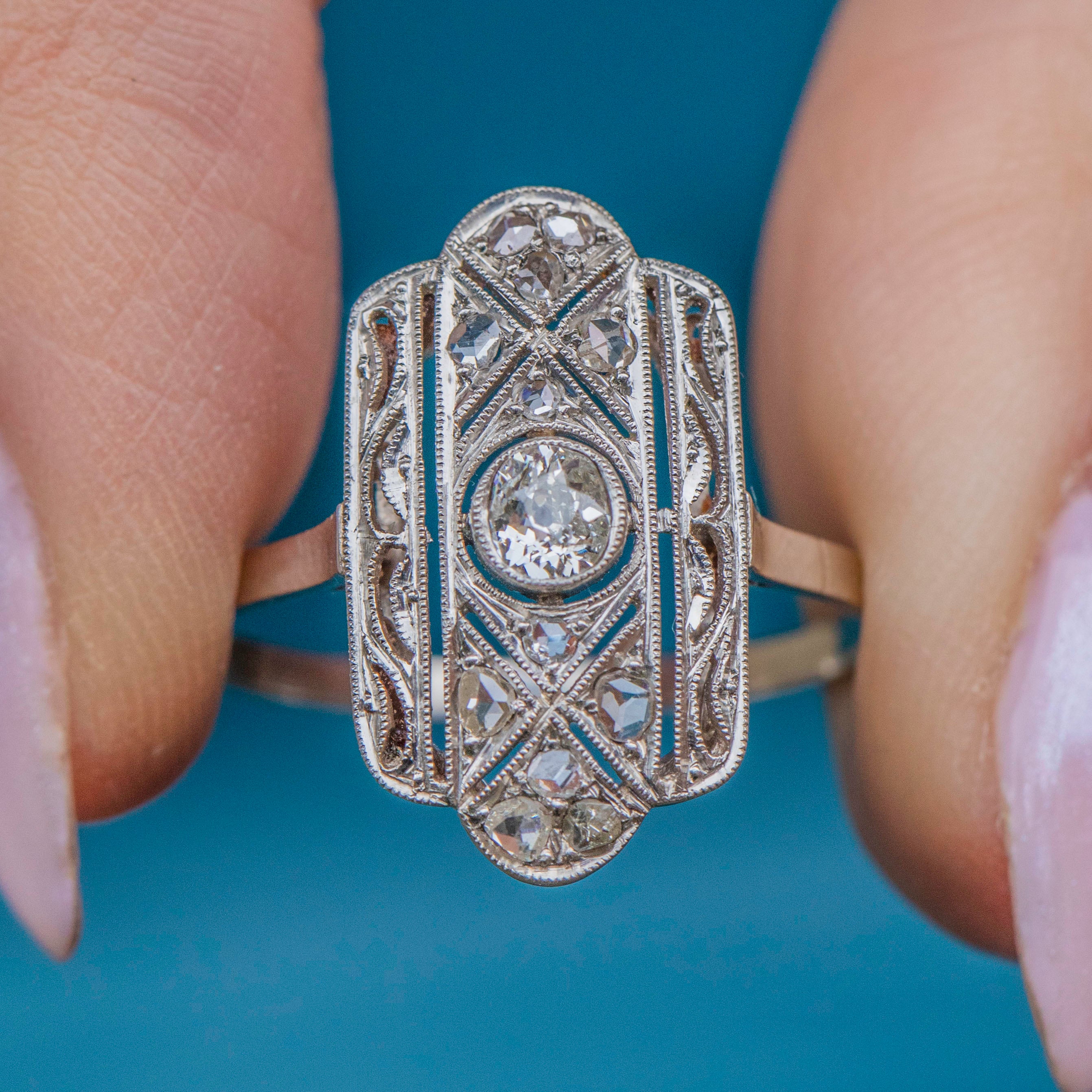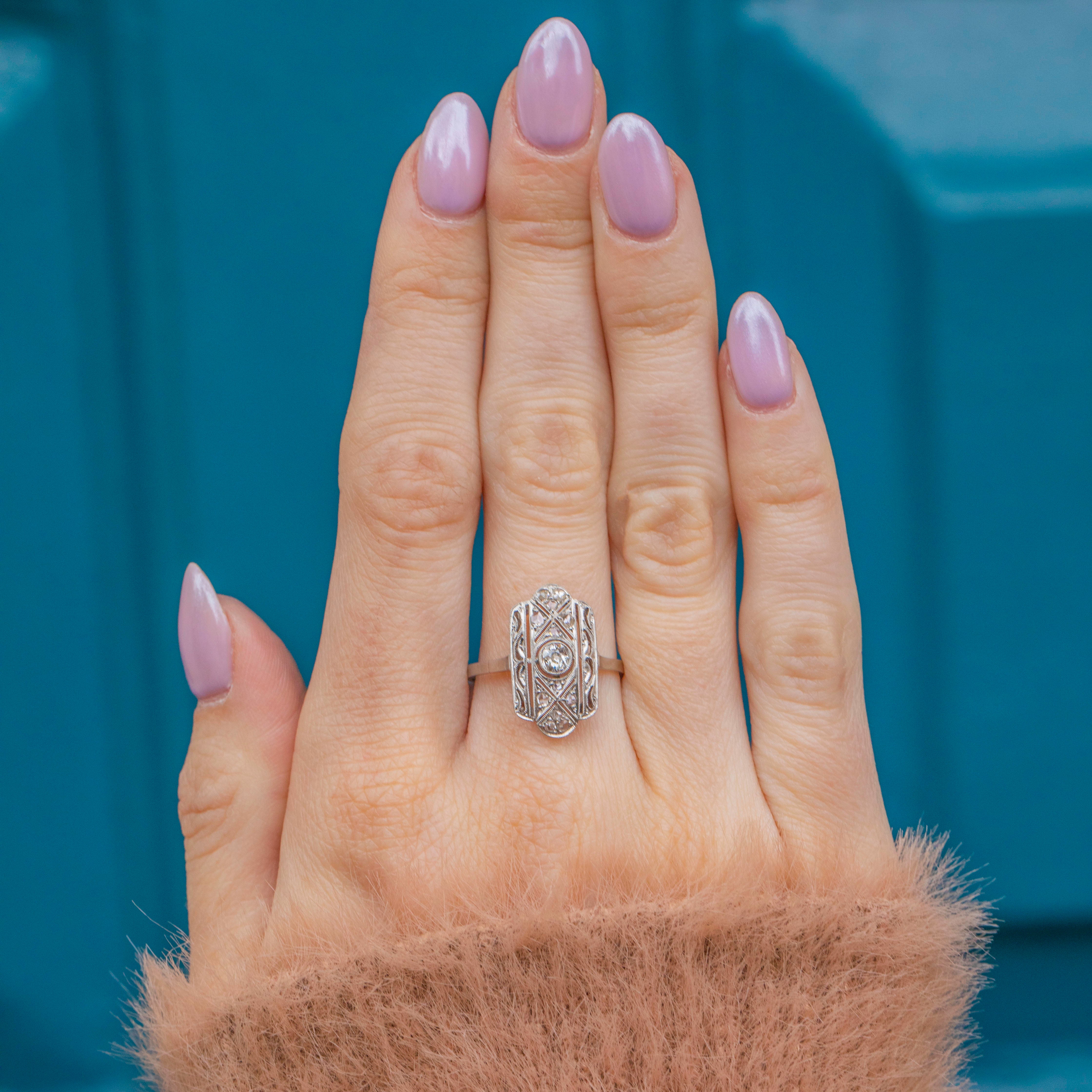 Expand your jewellery collection with this Art Deco Platinum Diamond panel ring! Sprinkled with a generous helping of characterful rose-cut Diamonds surrounding a 0.15ct old-mine-cut Diamond across the geometric panel, this is a true Deco delight that will make a glittering statement whatever the occasion.