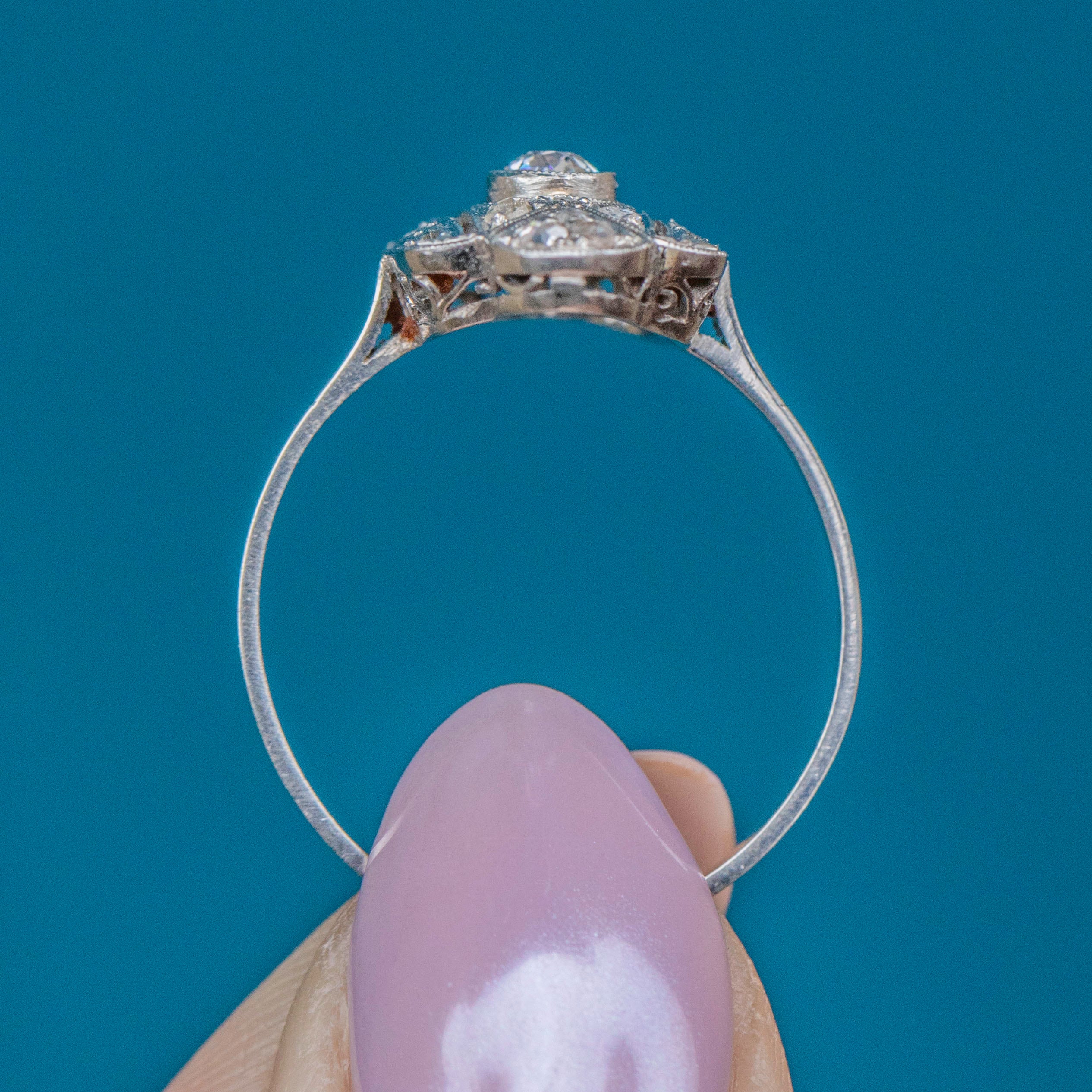 This antique Diamond ring is formed entirely of robust Platinum, making her a great ring to wear everyday, and a spectacular engagement ring choice. True to the Art Deco period, this Platinum Diamond ring embodies sophistication with symmetry and exceptional craftsmanship.