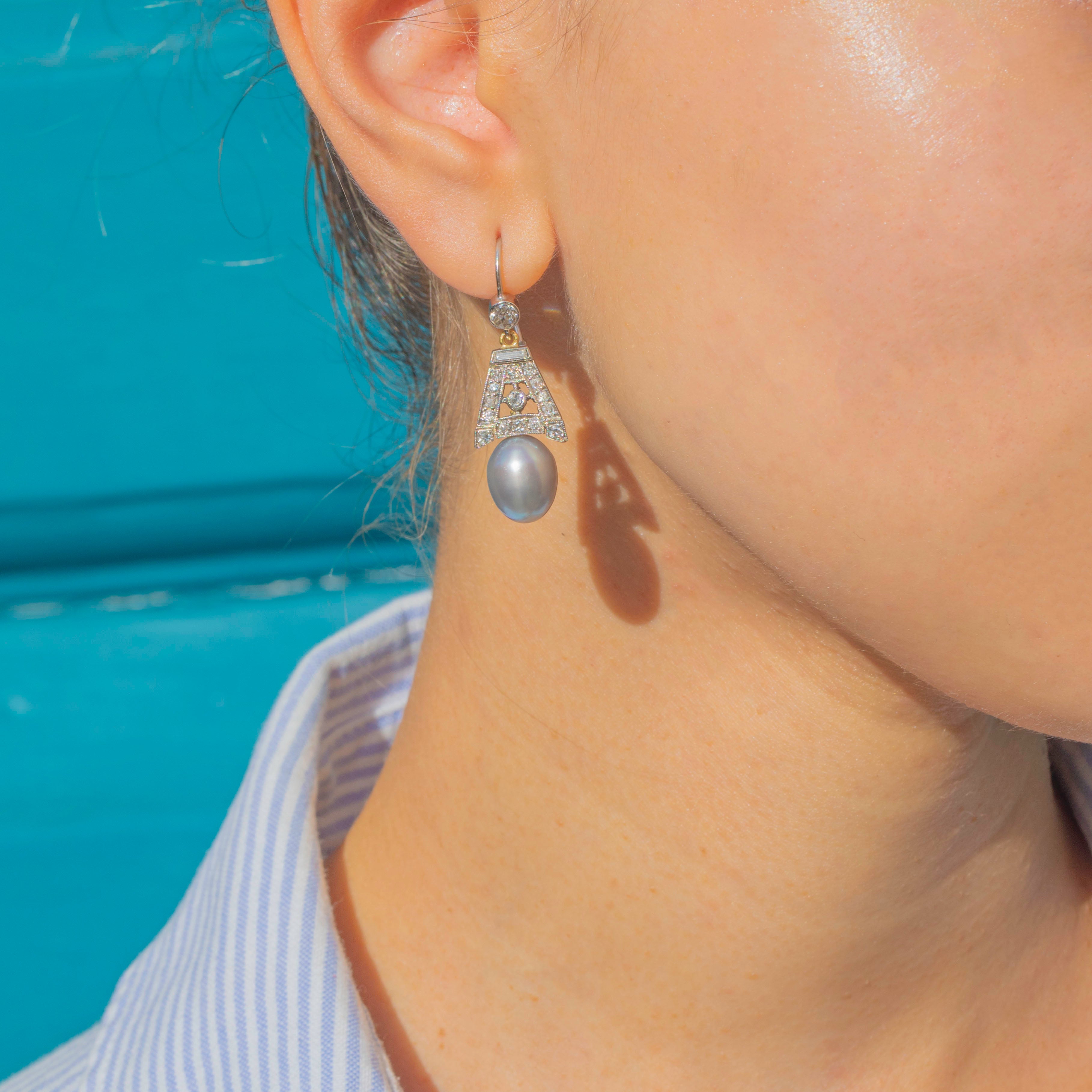 These exquisite Art Deco drop earrings embody the bold glamour of the 1920s. Featuring geometric Platinum tops set with twinkling Diamonds, each earring suspends a softly lustrous Pearl for a beautiful contrast of sparkle and sheen.
