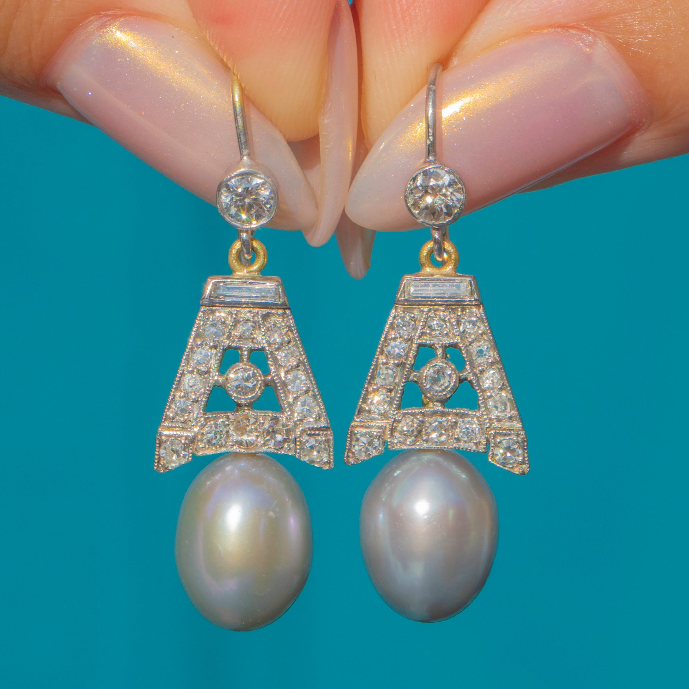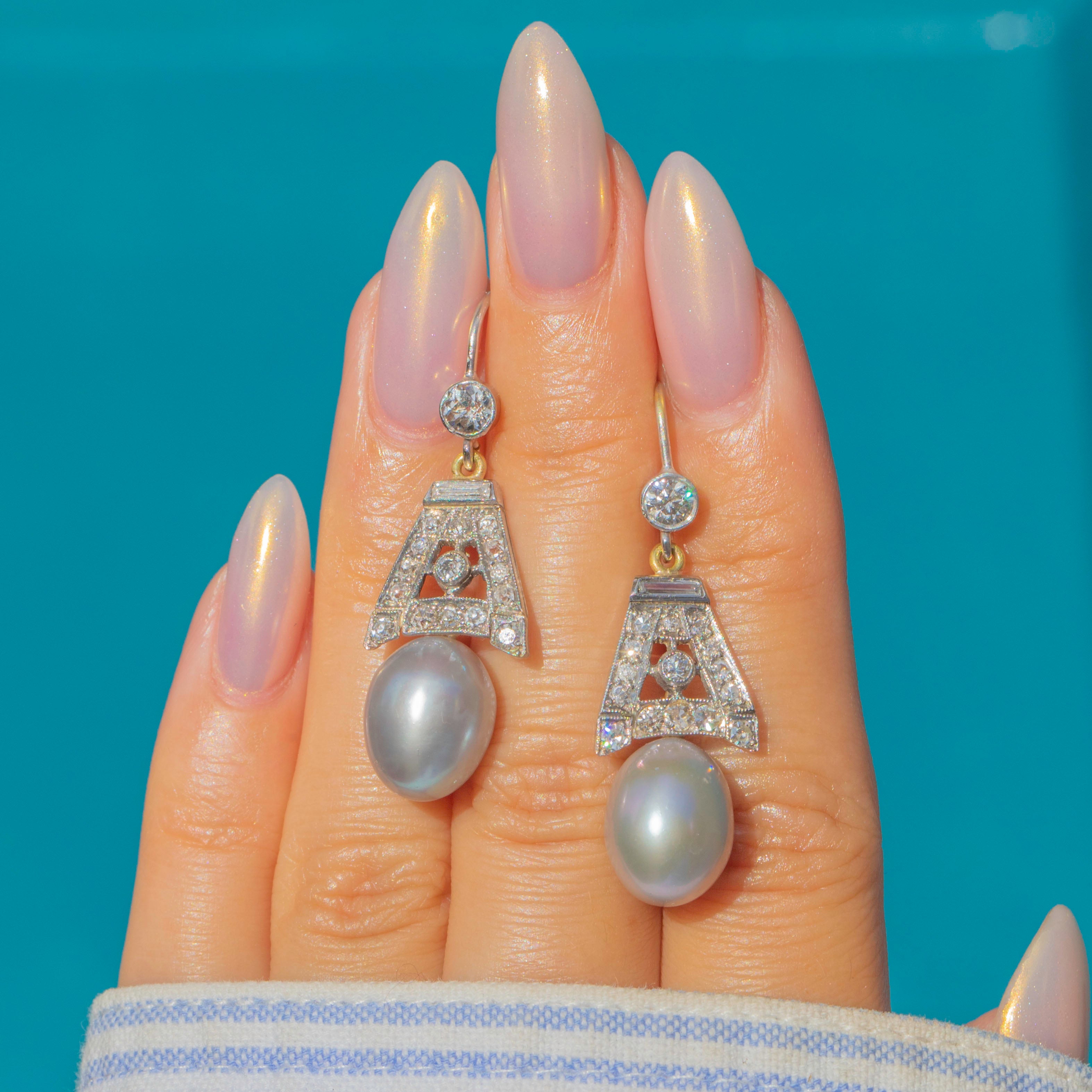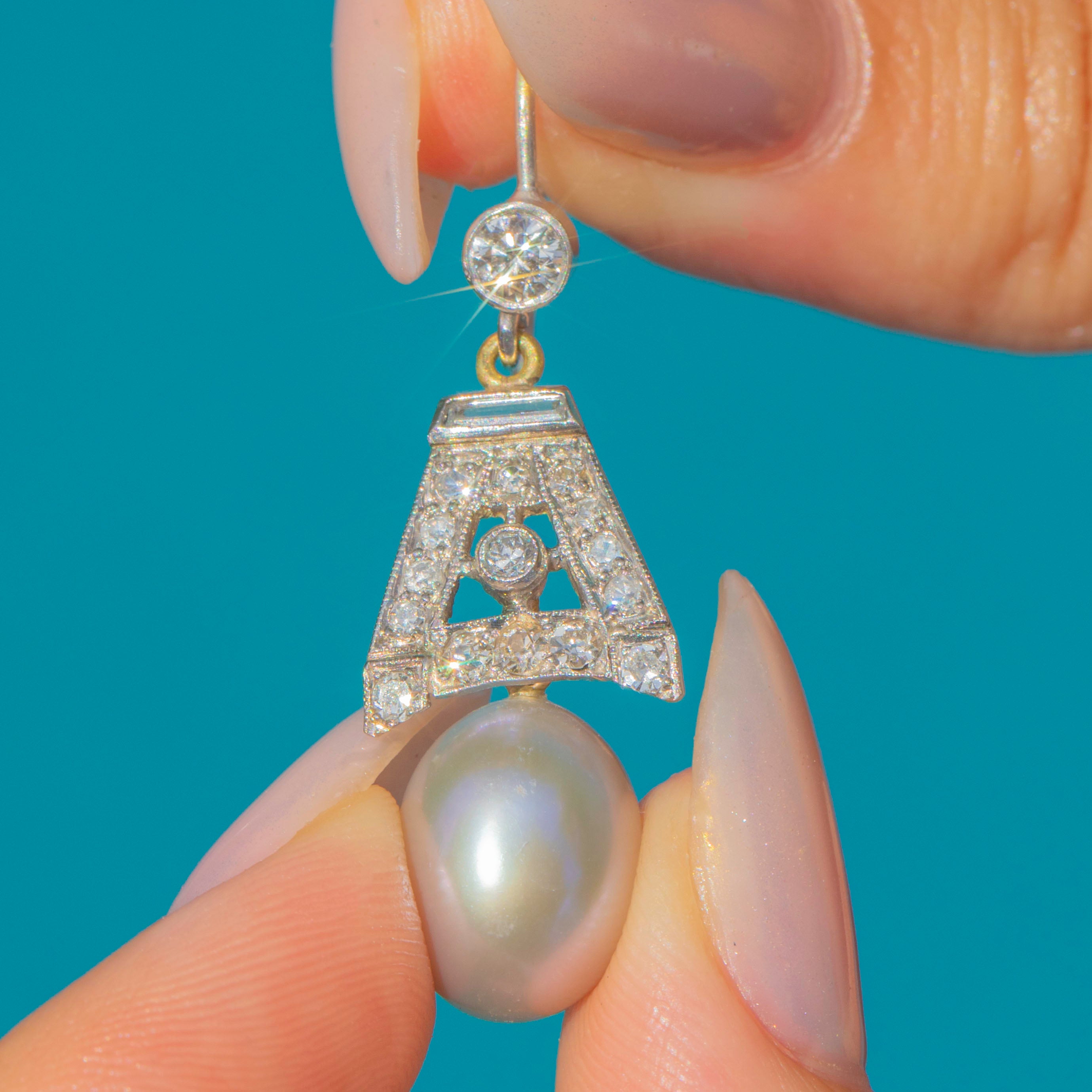 The Diamonds, approx. 0.40ct combined, are arranged in an angular, architectural motif so typical of the Deco era. Below, the natural Pearls sway gently with movement, giving these earrings an elegant presence on the ear.