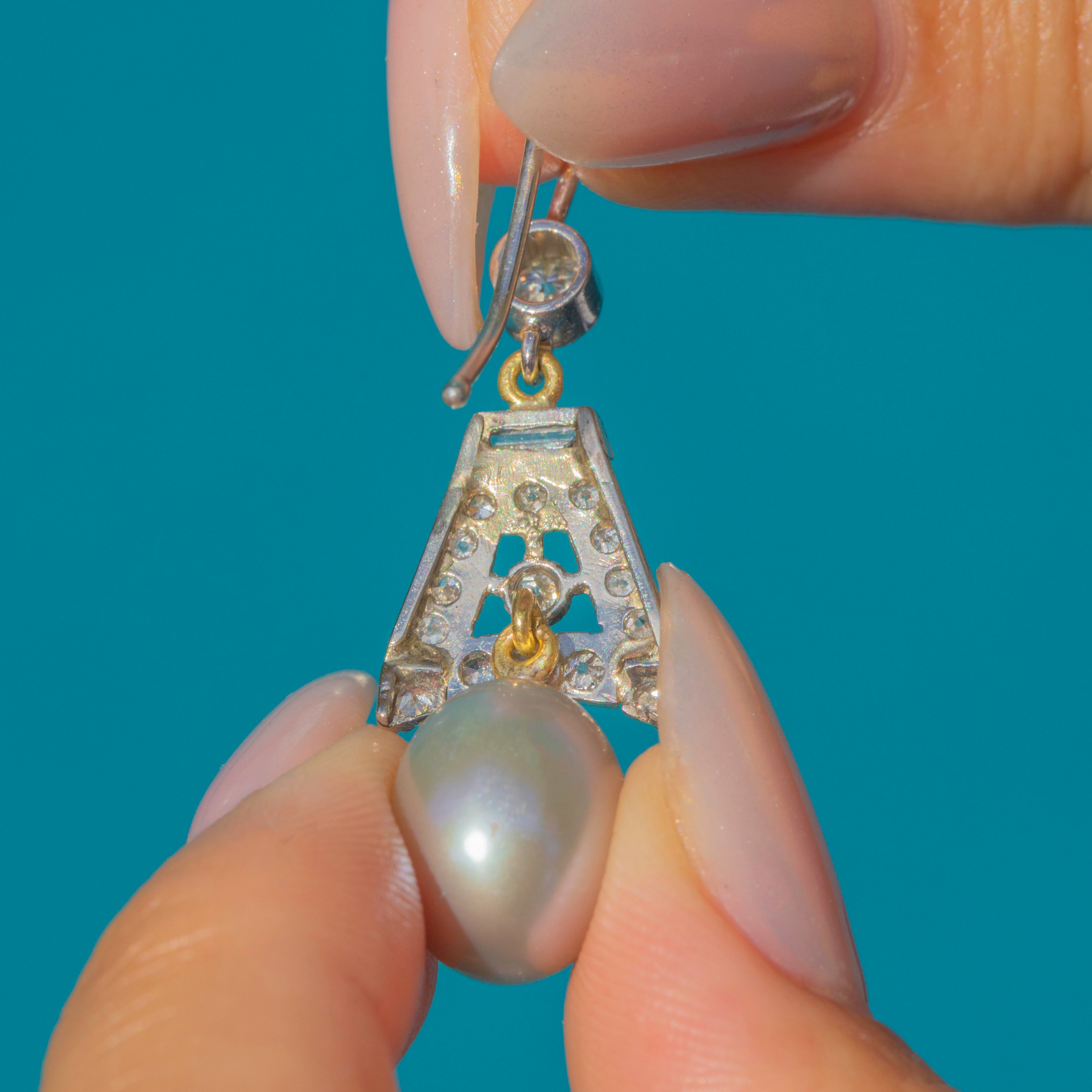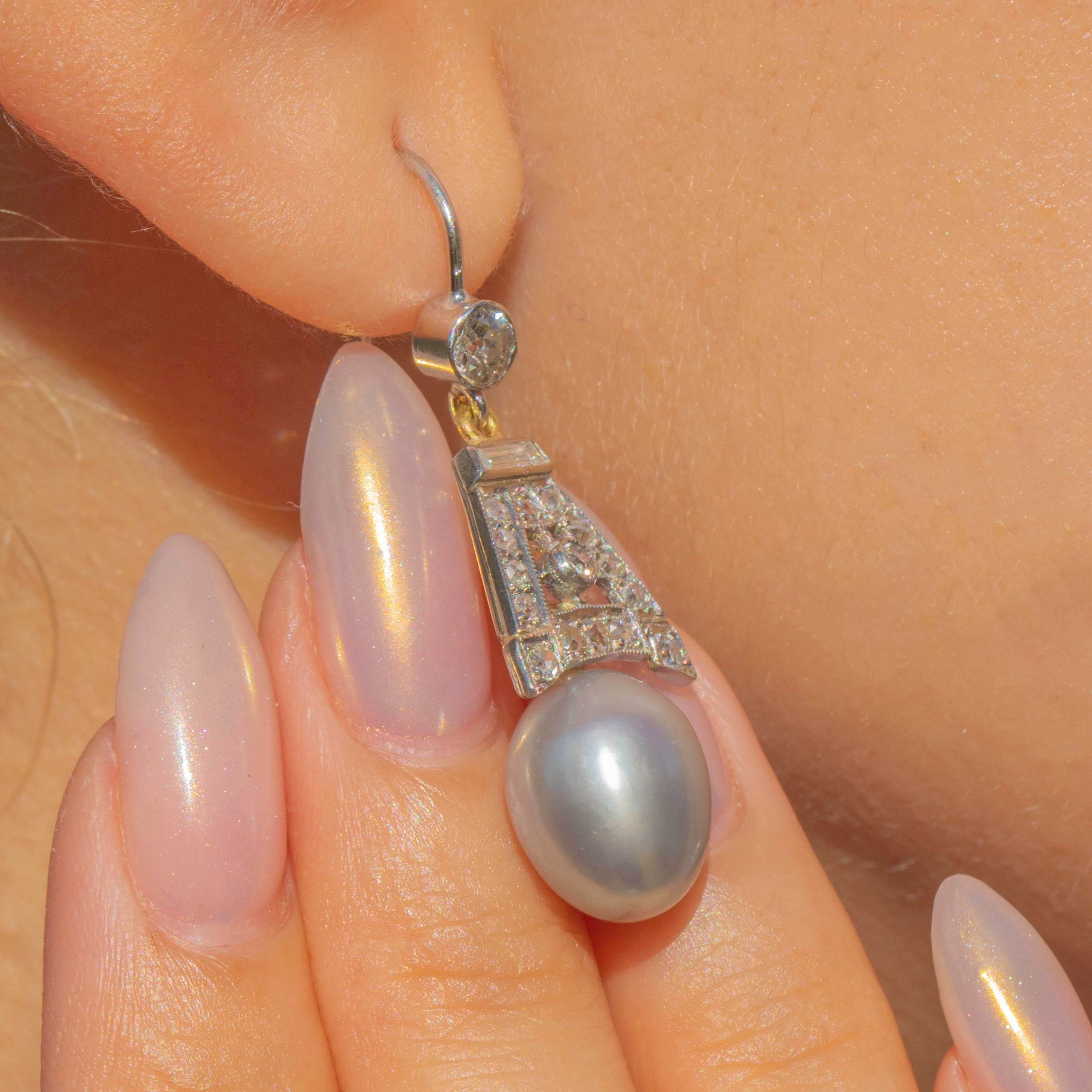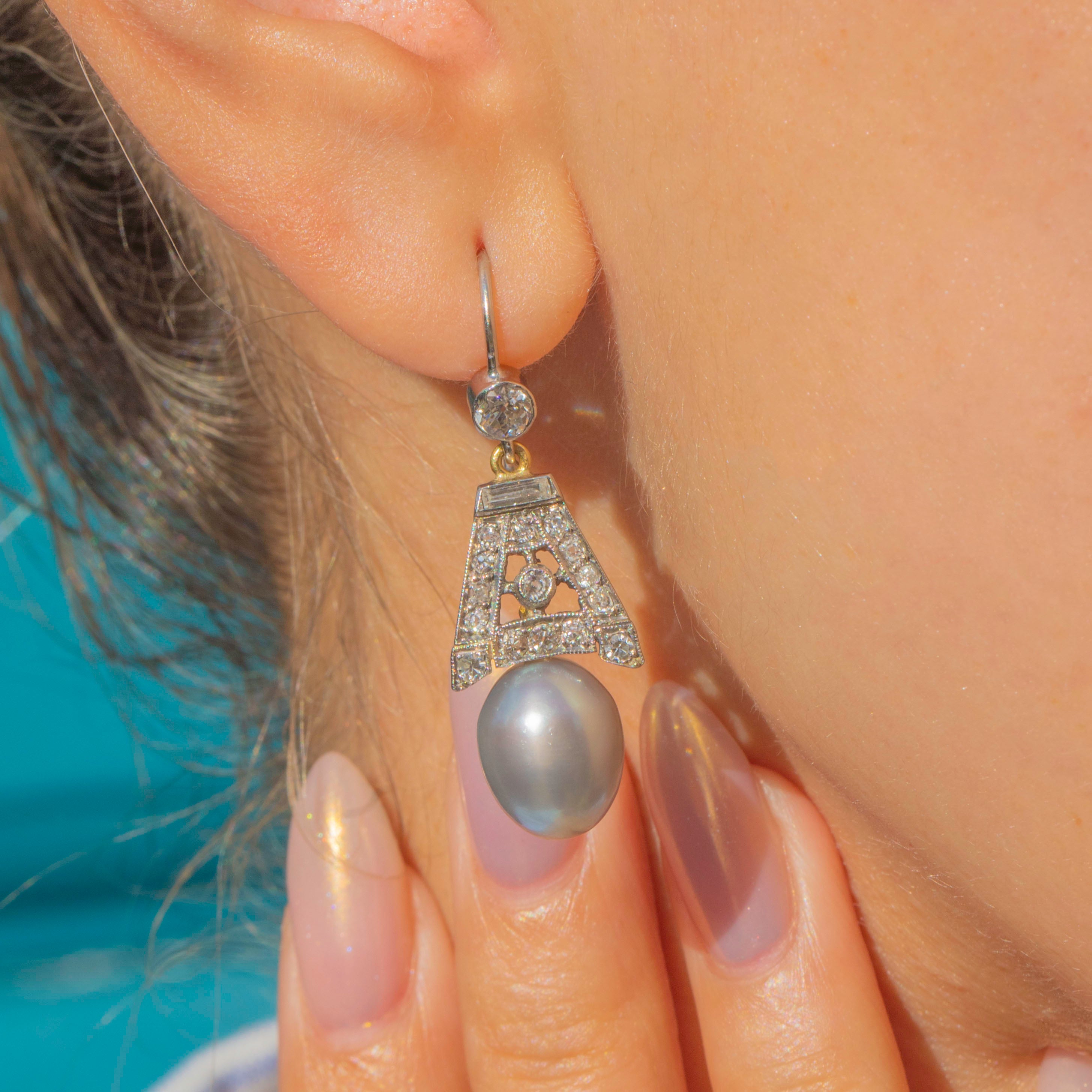 The Diamonds, approx. 0.40ct combined, are arranged in an angular, architectural motif so typical of the Deco era. Below, the natural Pearls sway gently with movement, giving these earrings an elegant presence on the ear.