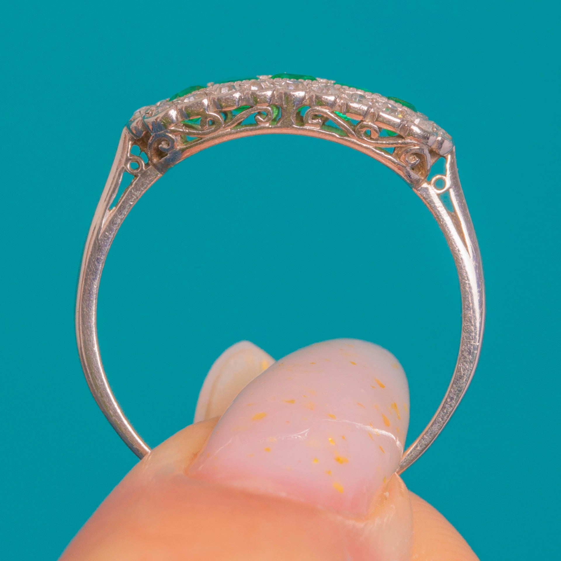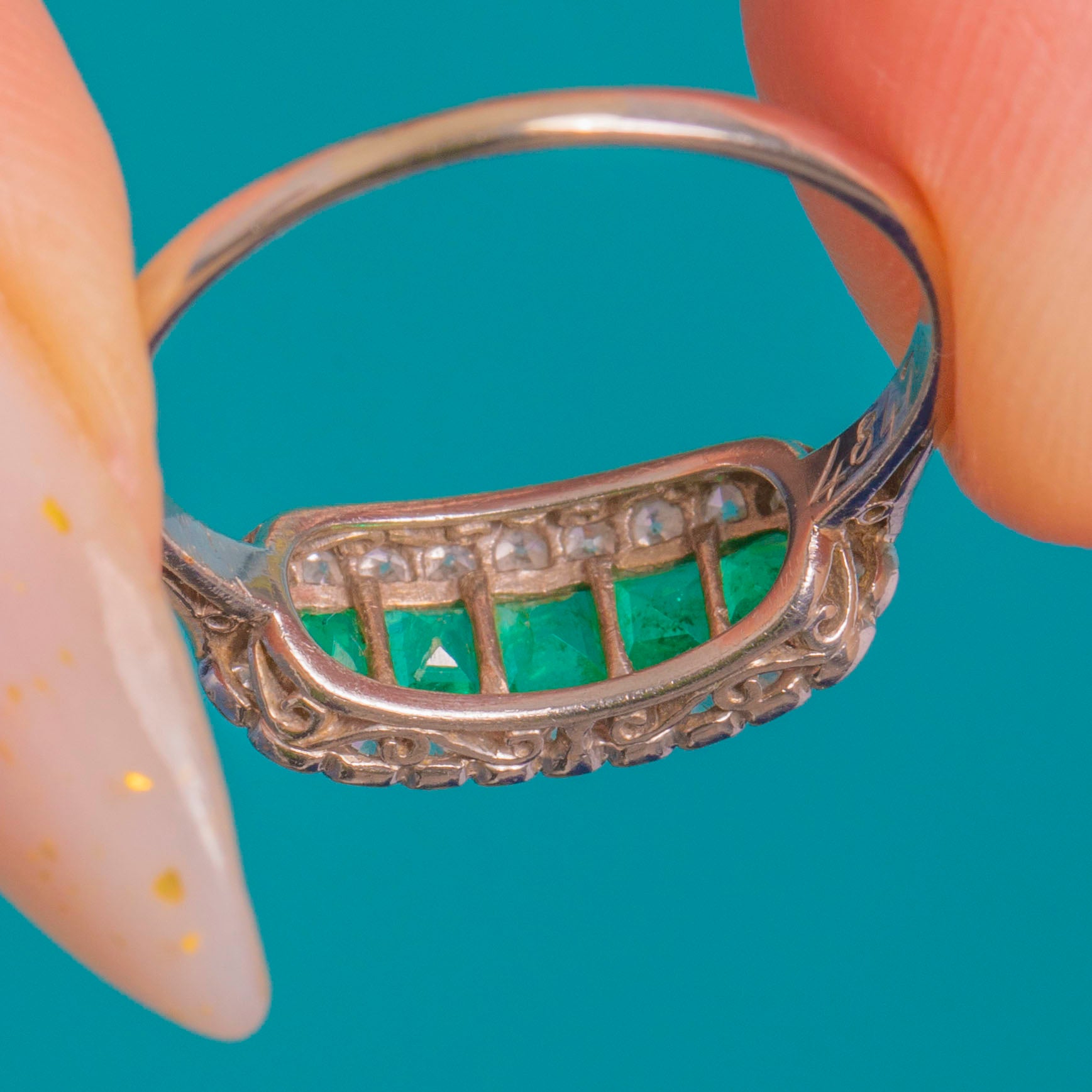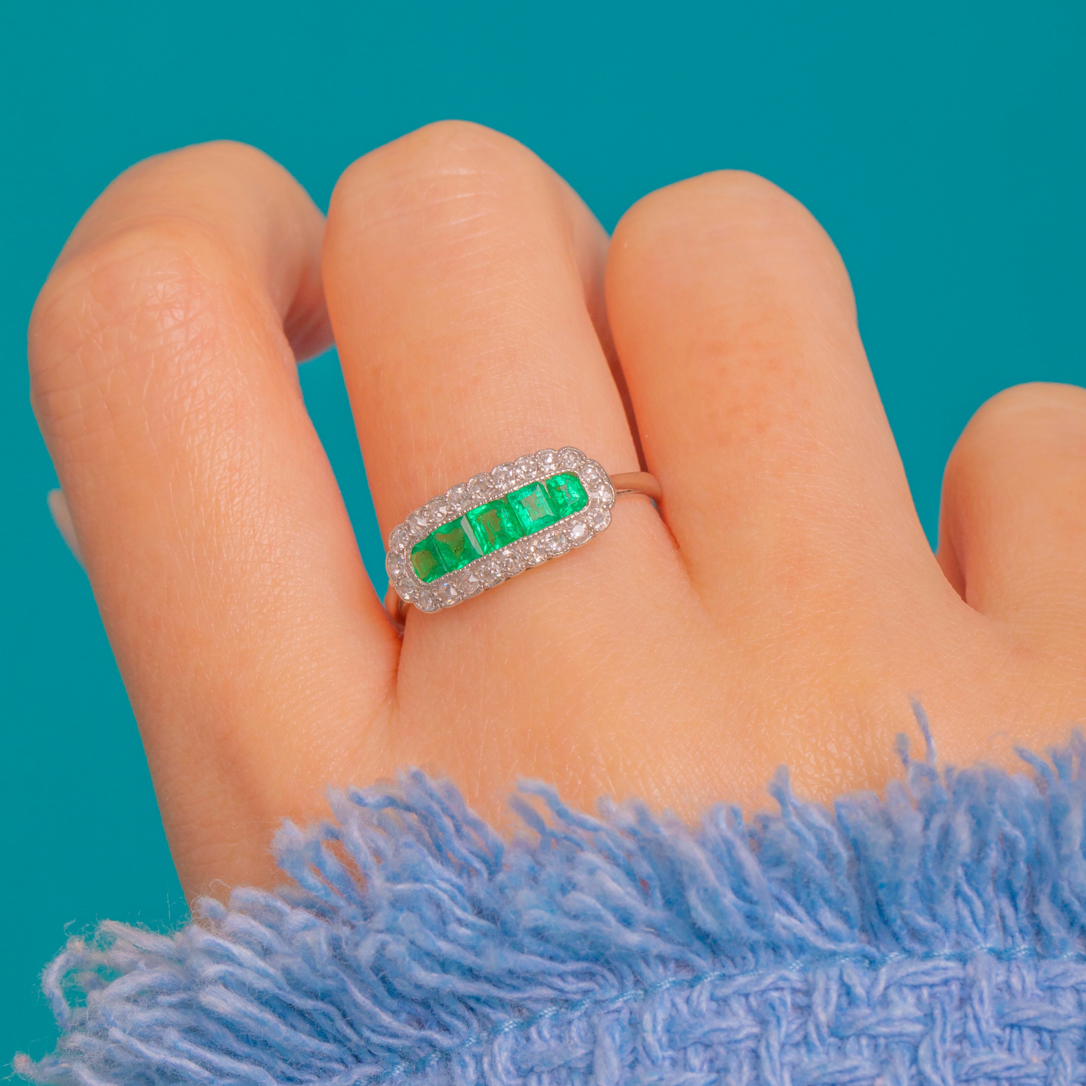 Sleek, sculptural and undeniably Deco, this Platinum plaque ring centres a luminous row of bright green square Emeralds, framed by a halo of sparkling round Diamonds edged in fine milgrain. The elongated, rounded-rectangle silhouette gives elegant finger coverage, while the bead-set border and channel-set centre create a refined play of geometry and light.