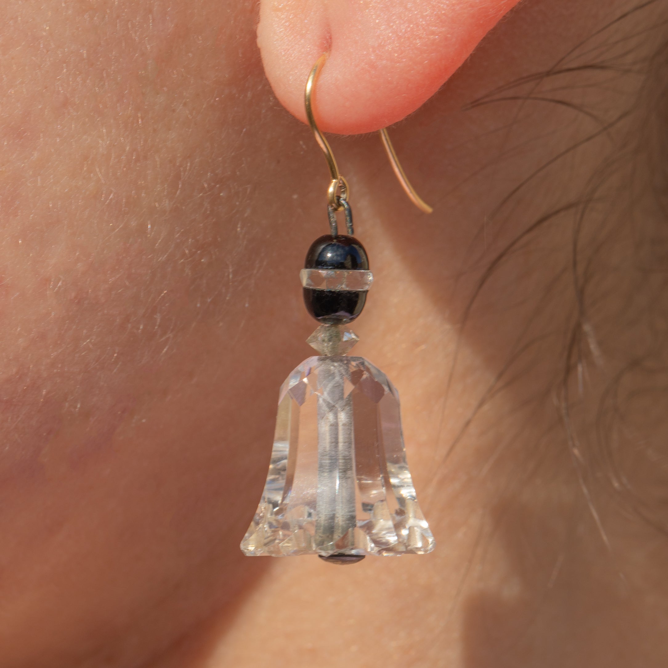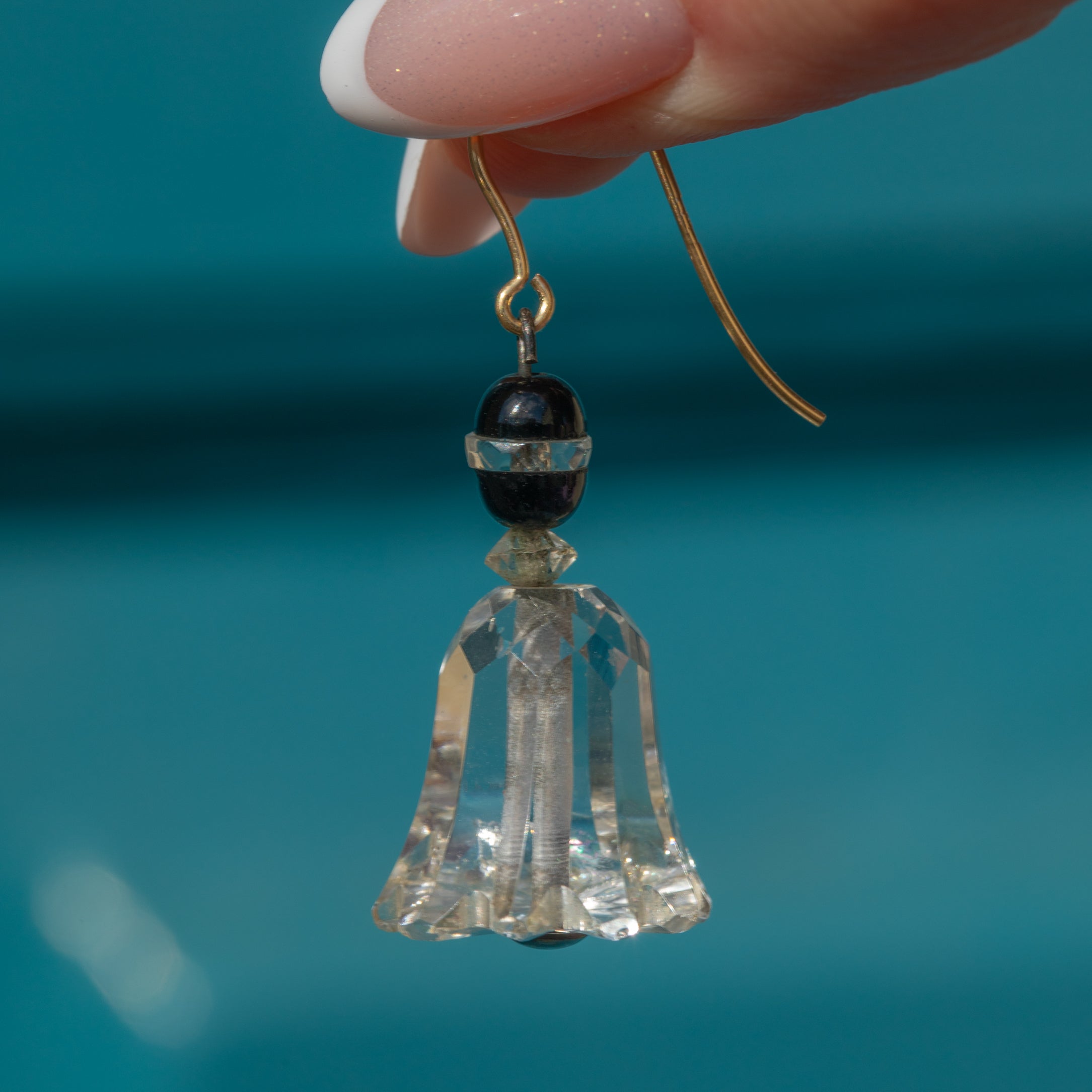 These Art Deco Rock Crystal bell drop earrings will make a statement adorning your lobes! Each earring displays skilfully hand-cut Rock Crystals and contrasting Onyx, uniquely formed into bell shapes making them a standout pair.