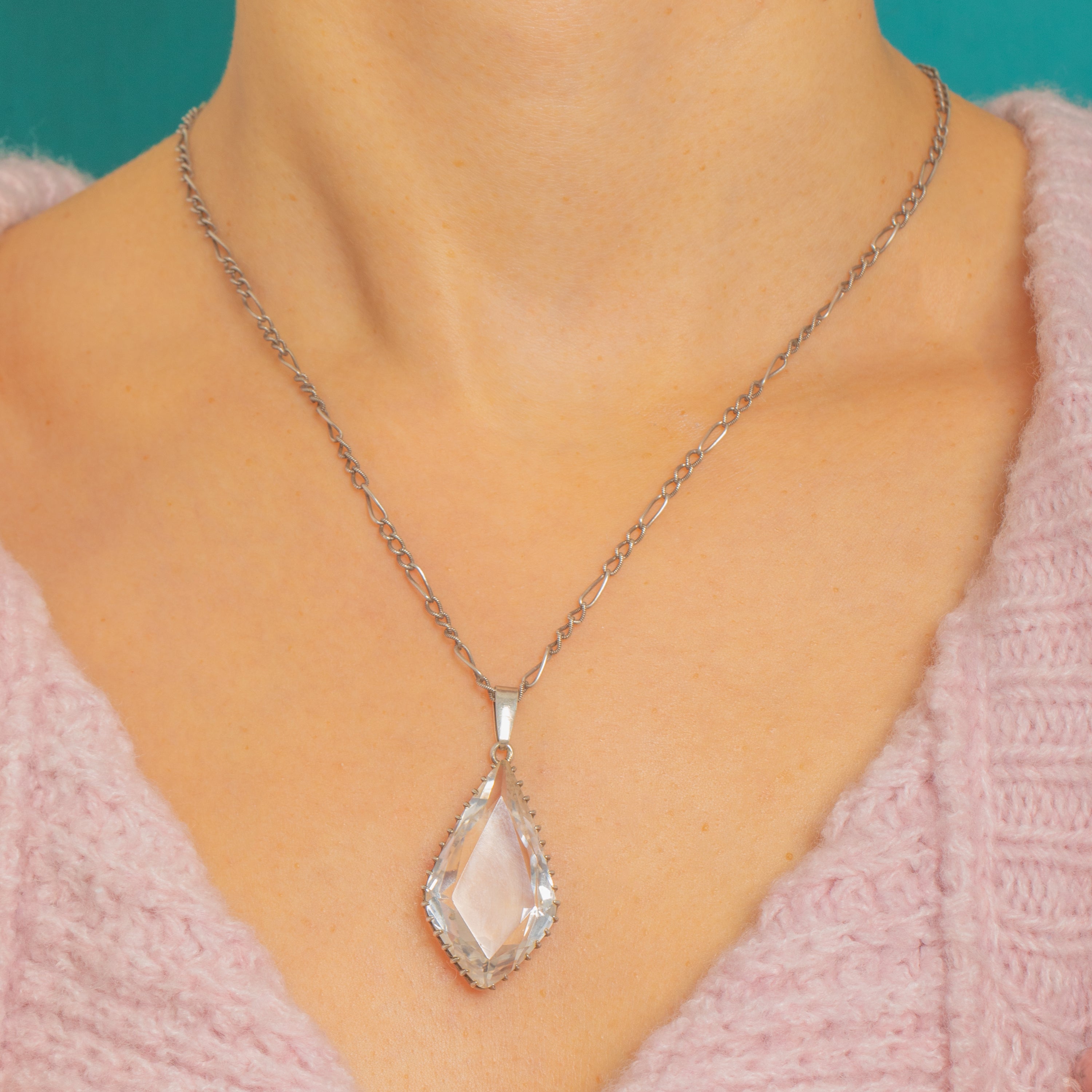 VERY GOOD: The Rock Crystal is bright with minor edge and facet abrasions commensurate with age, presenting lively sparkle. The Sterling Silver setting is secure with even teeth and a gentle antique patina; the chain and clasp are in good order with light surface wear from use. No visible repairs.