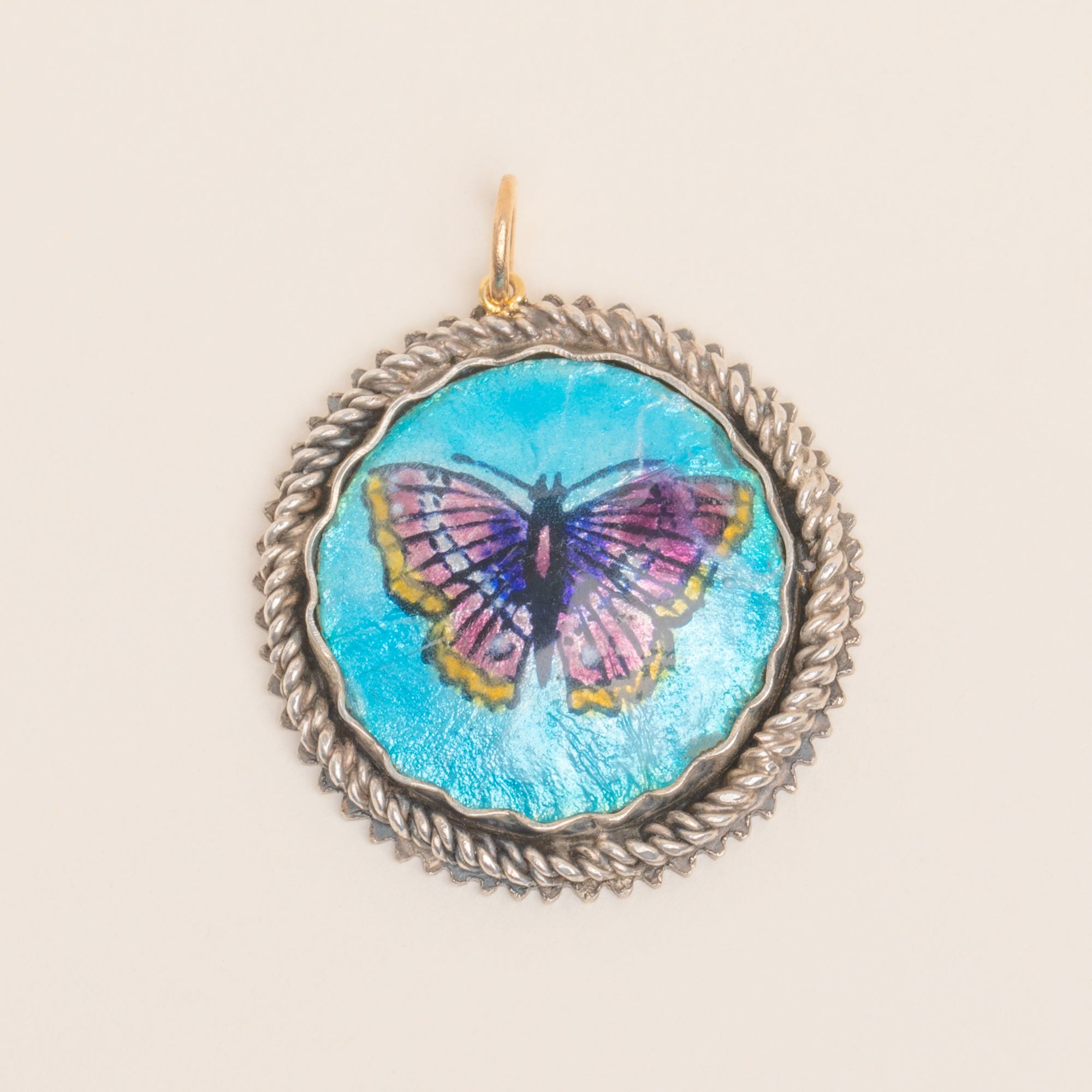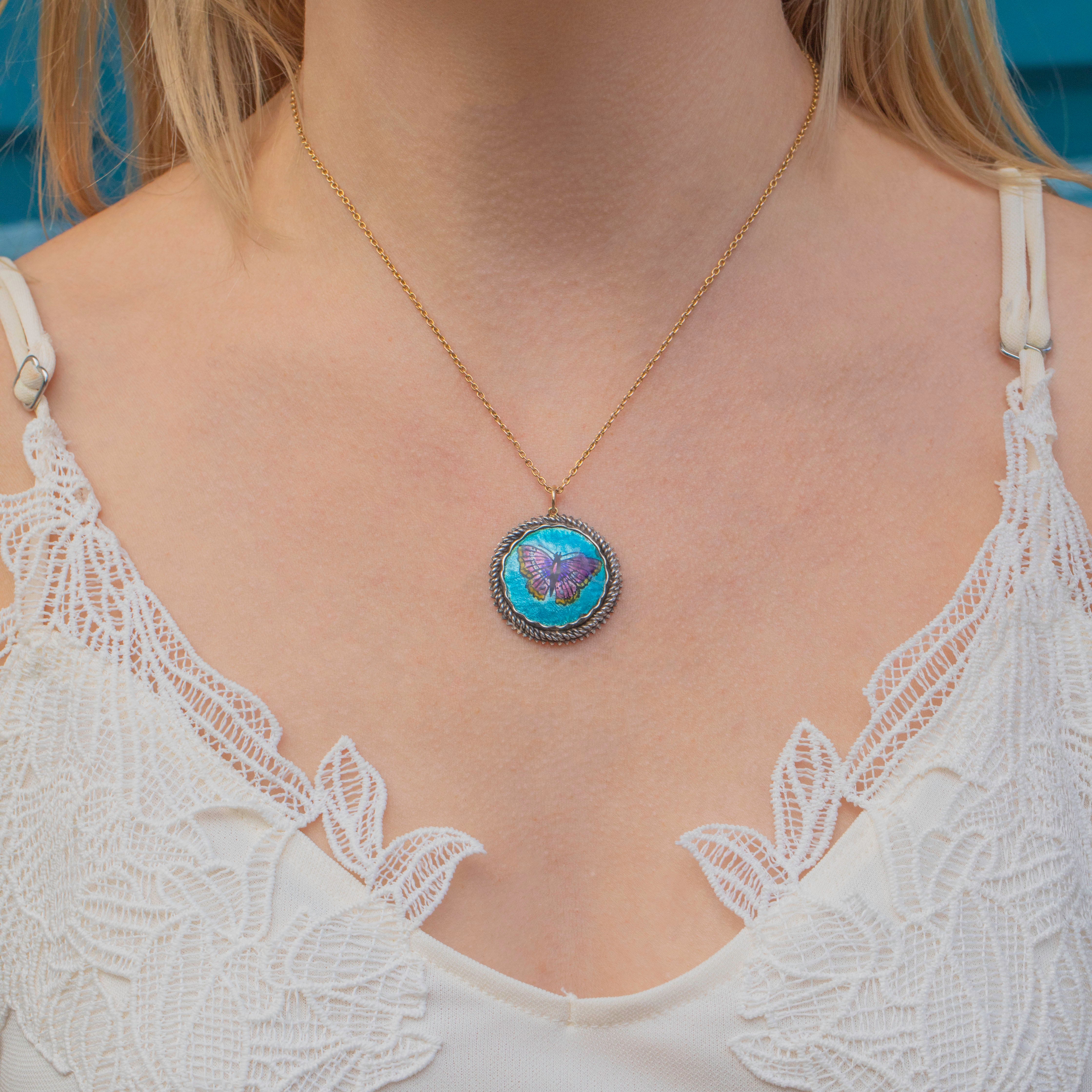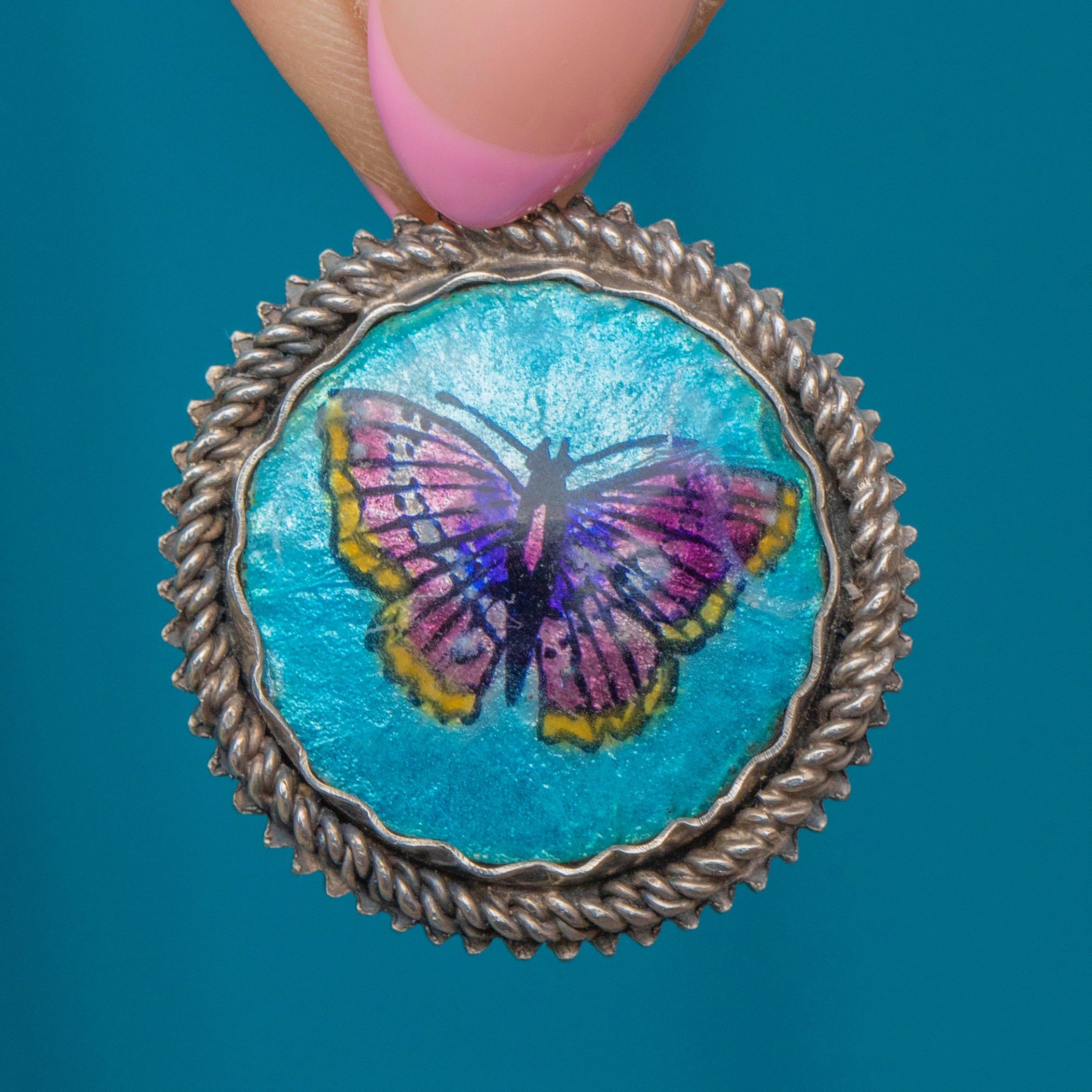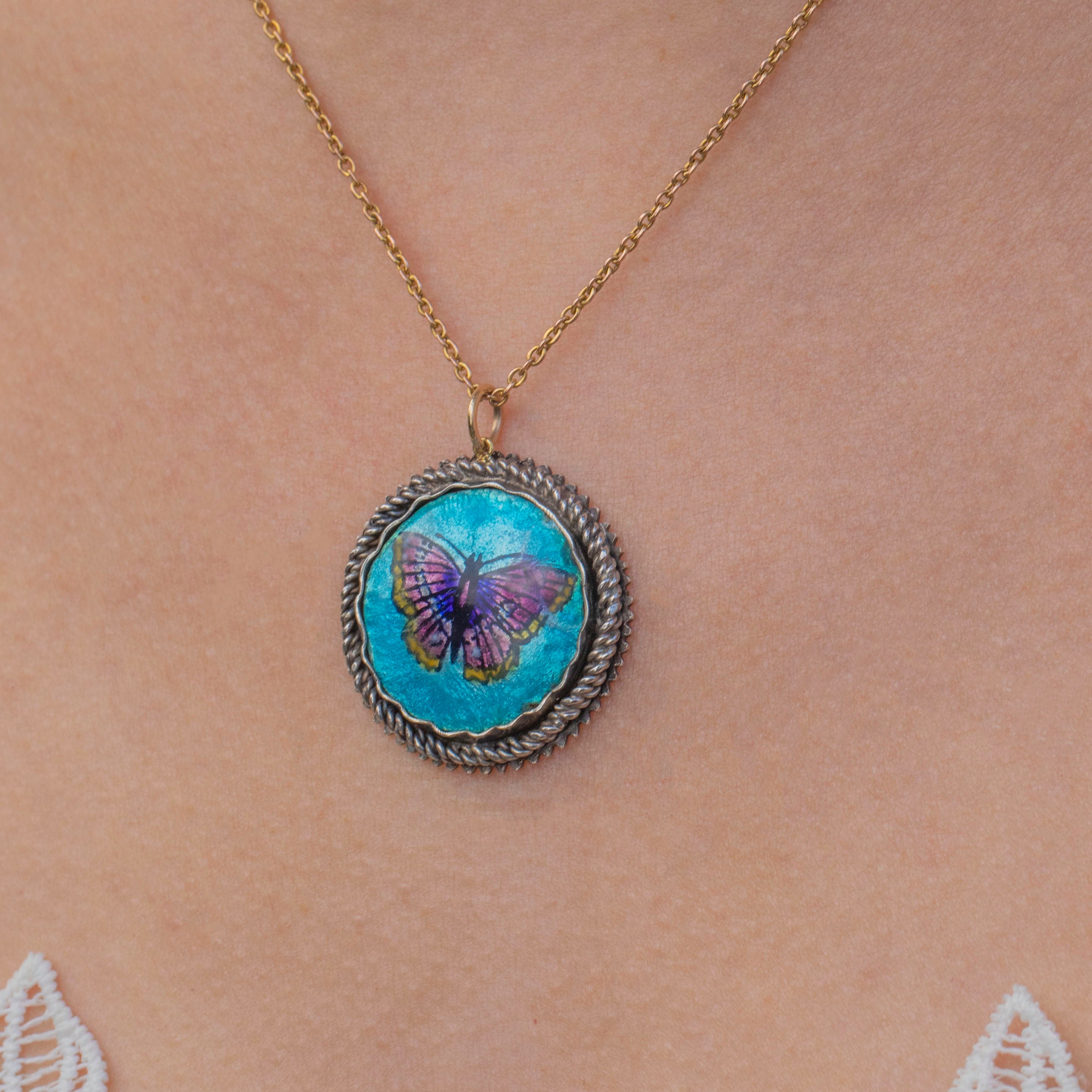 We love the intricate design of this Art Deco Silver blue Enamel butterfly pendant! Inlaid with vibrant blue Enamel framed by a decorative Sterling Silver rope border, this antique pendant will make a gorgeous addition to your wardrobe.