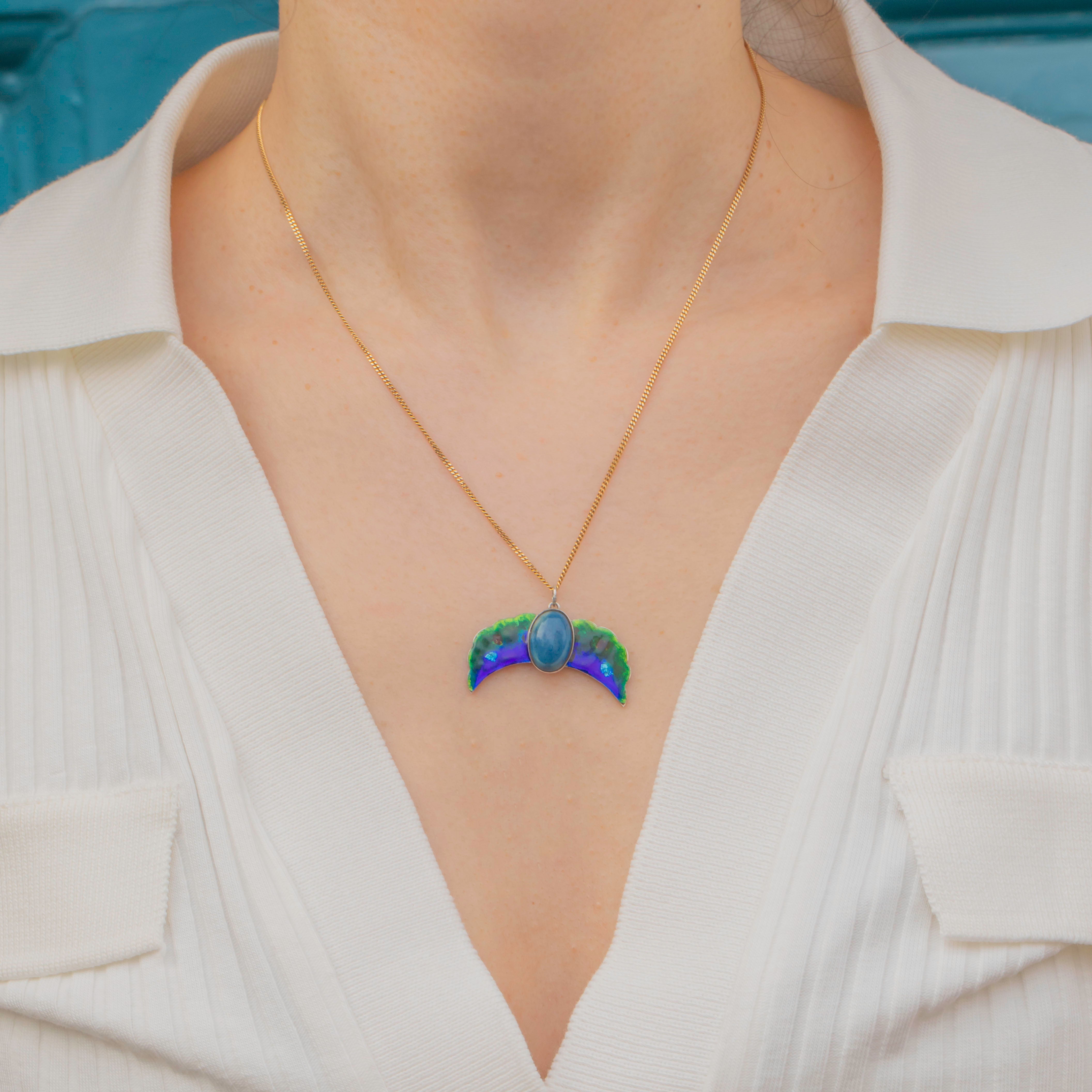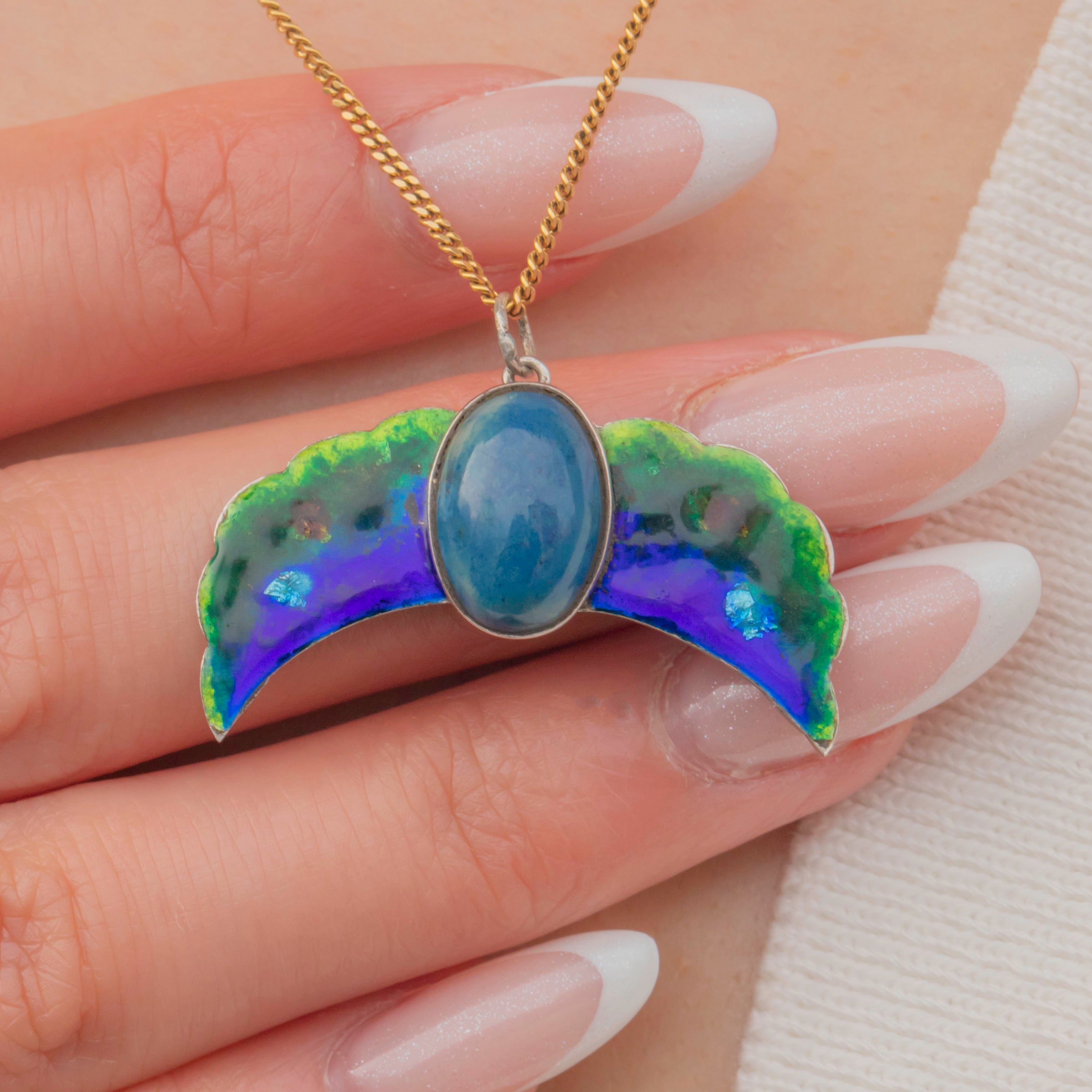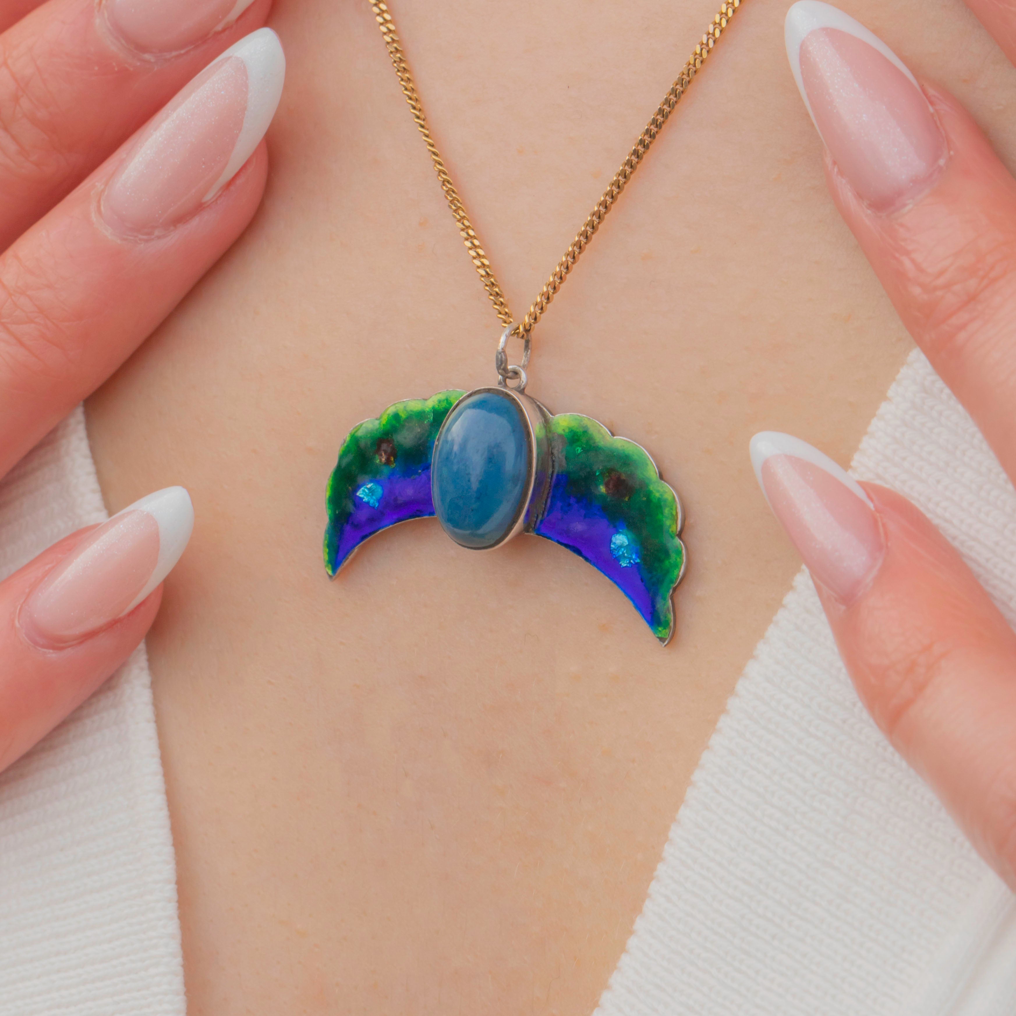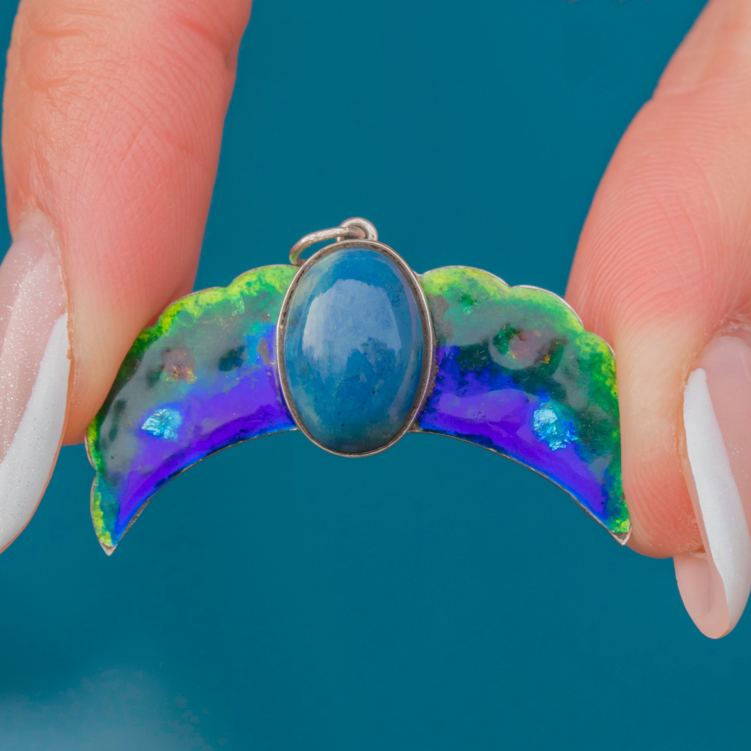 Crafted from Sterling Silver, this Art Deco pendant is richly saturated, with a deep cerulean and green Enamel finish. She is well crafted, with curved wing details and a plump Enamel body.