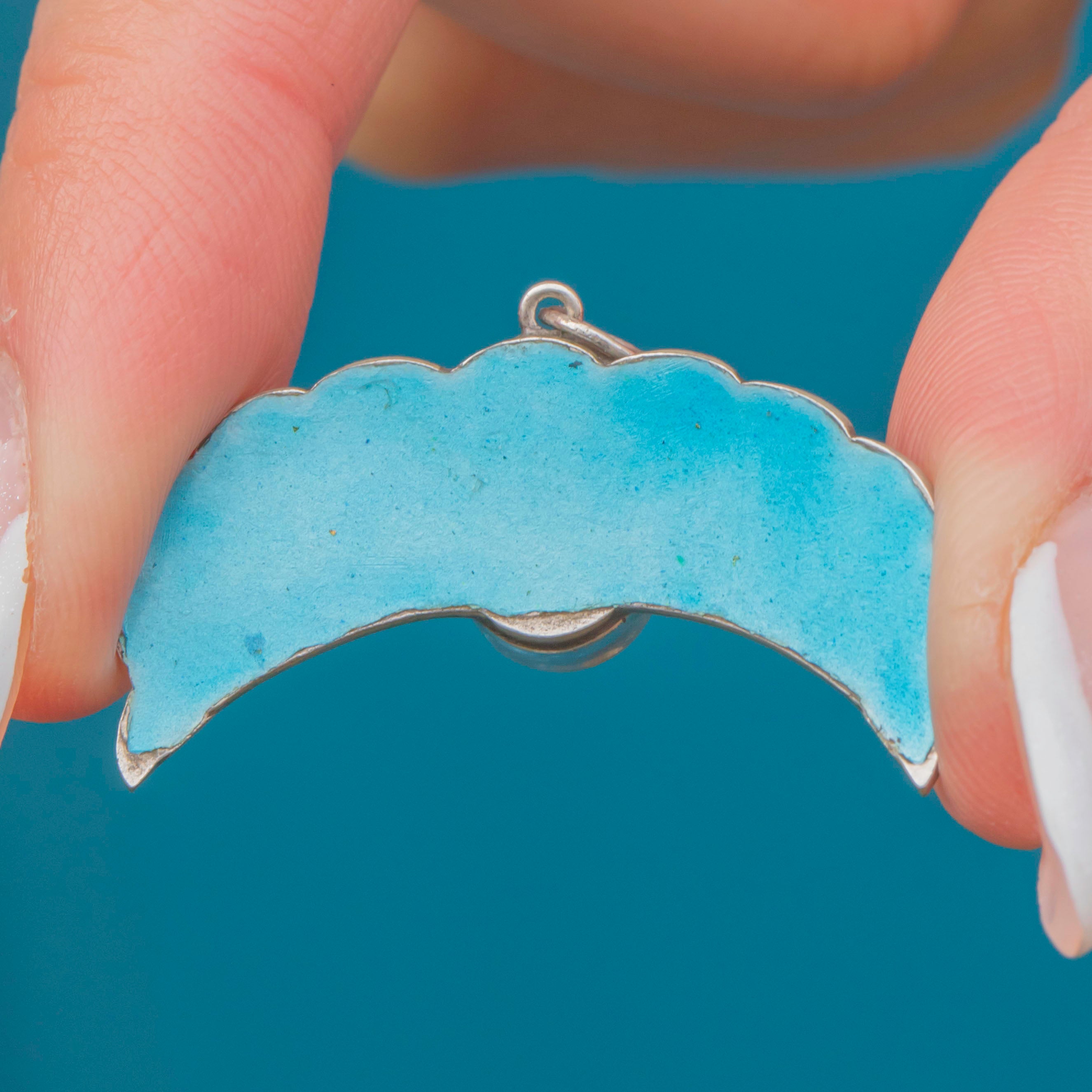 VERY GOOD: This Art Deco Silver blue Enamel Egyptian revival pendant is in very good condition. The Enamel is rich and vibrant, with minor signs of wear to the back commensurate with age. With a secure jump ring, you can wear this antique pendant with confidence.