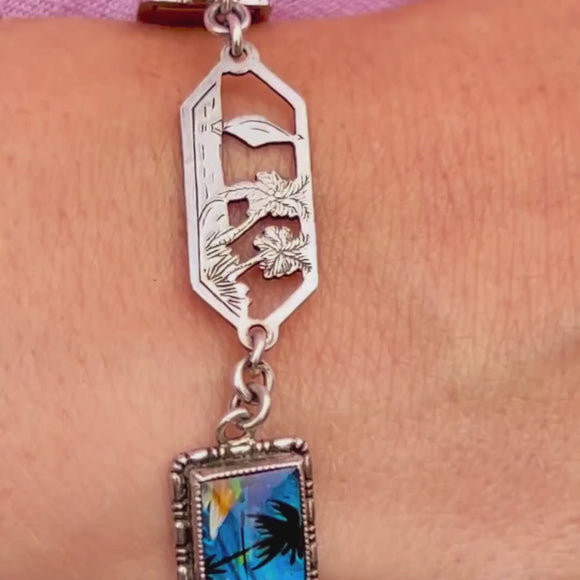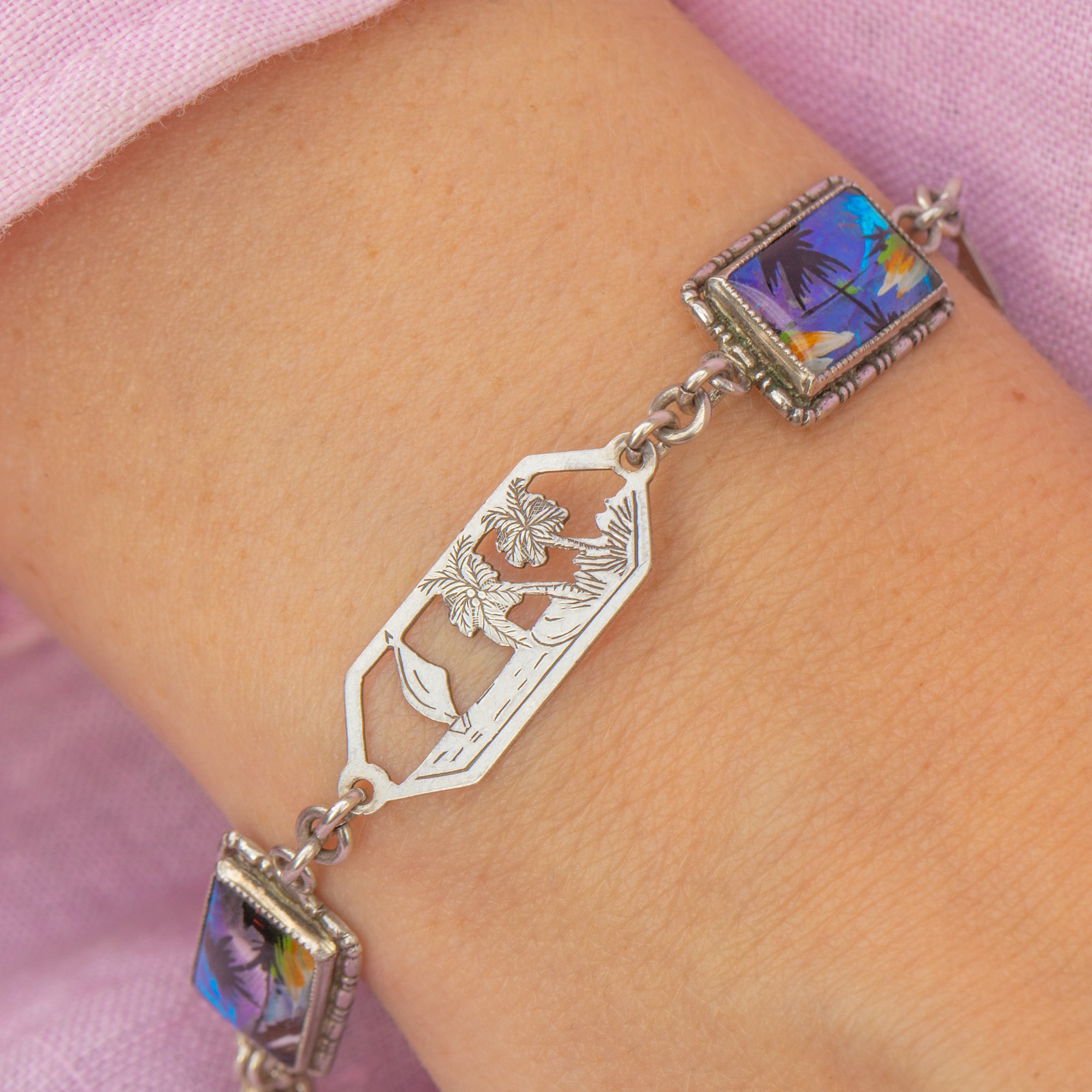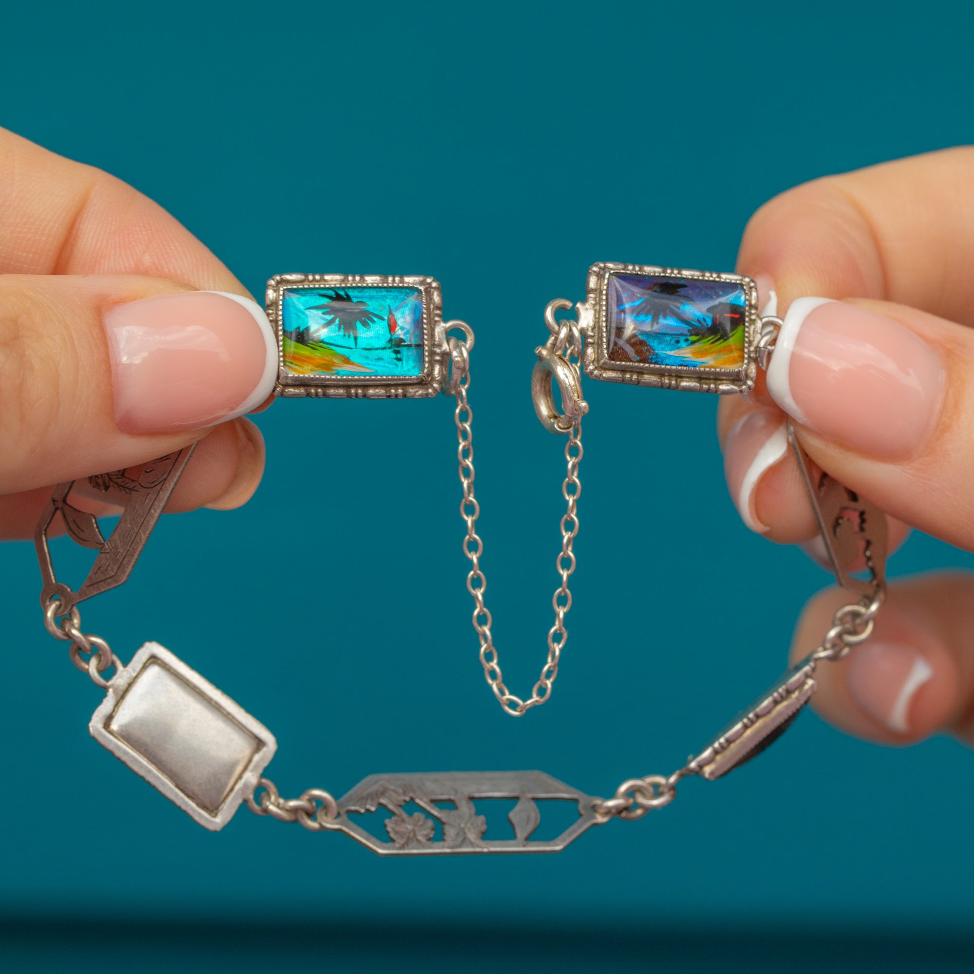 This Thomas Mott Bracelet has links that feature four brilliant blue Morpho butterfly wings, each with intricately painted scenes. Alternating with the butterfly wing links are corresponding silver links, boasting elaborately engraved Tropical scenes. Just looking at this classic Art Deco bracelet will immediately transport you to warmer climates. Bon Voyage!