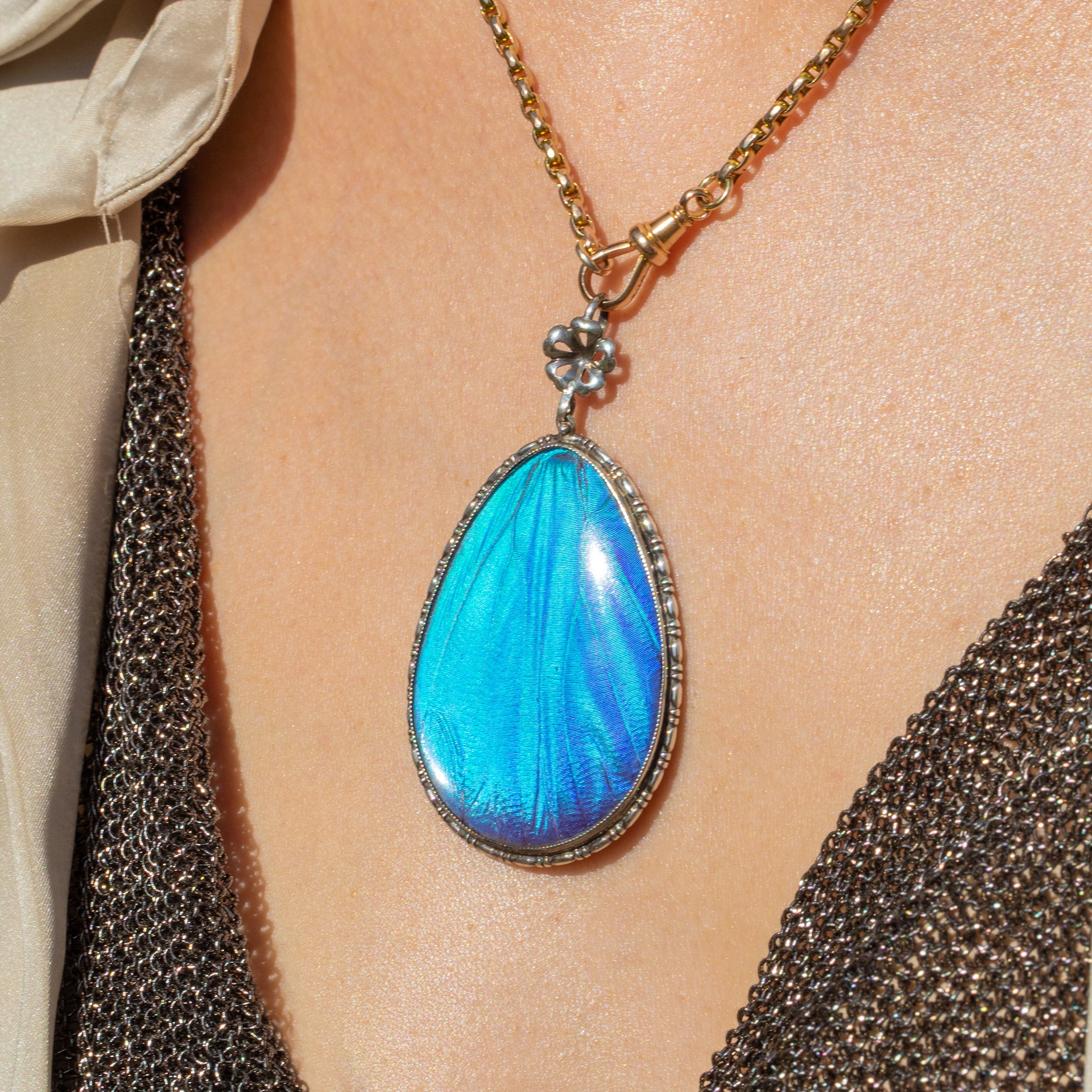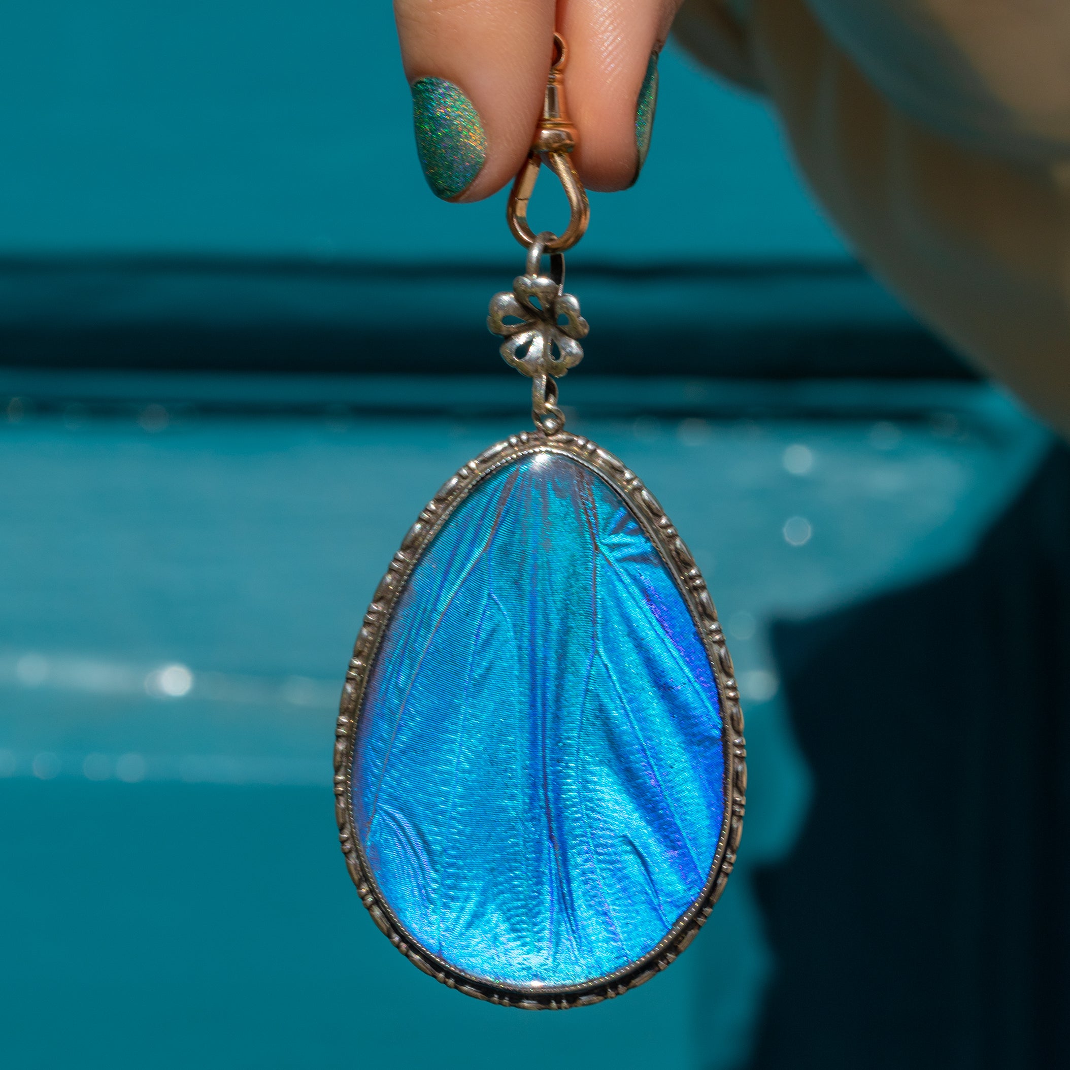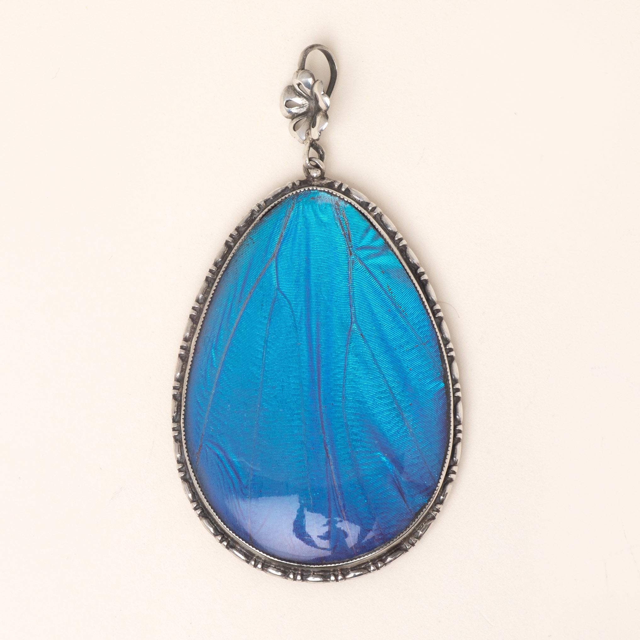 This pendant contains the neo-tropical Morpho blue butterfly wing which was a species of butterfly that was native to Peru. The 1920s was a time renowned for exploration, so it is not surprising that this wing has likely travelled far and wide in it's long life. This butterfly species was unable to be found in the UK, so you can just imagine the awe-inspiring gasp from those who viewed this pendant for the first time!