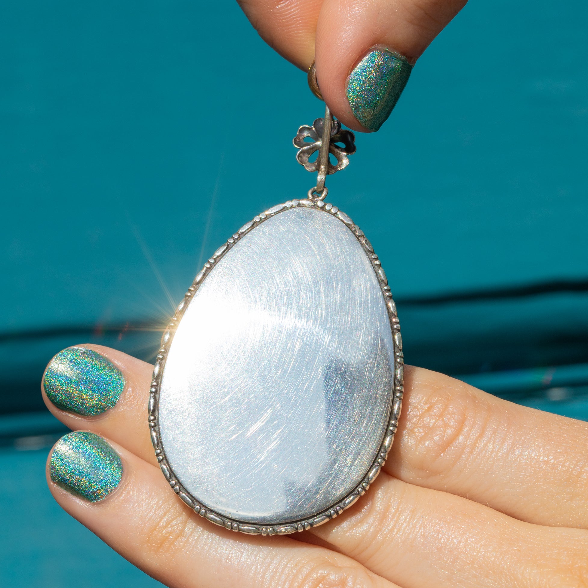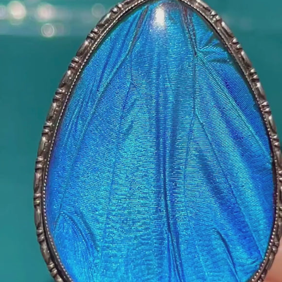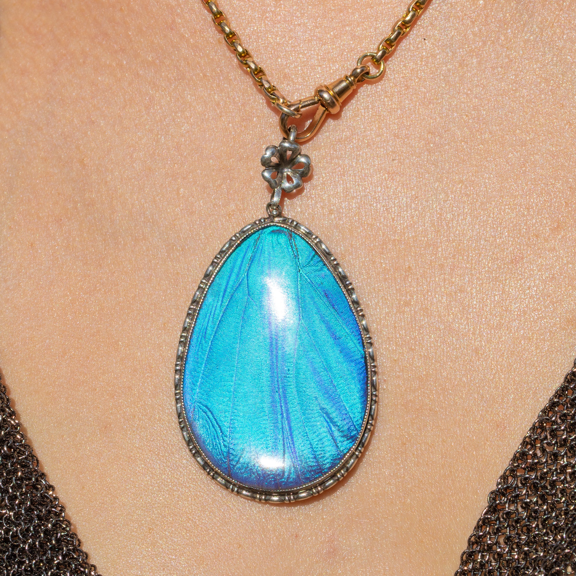 This pendant contains the neo-tropical Morpho blue butterfly wing which was a species of butterfly that was native to Peru. The 1920s was a time renowned for exploration, so it is not surprising that this wing has likely travelled far and wide in it's long life. This butterfly species was unable to be found in the UK, so you can just imagine the awe-inspiring gasp from those who viewed this pendant for the first time!