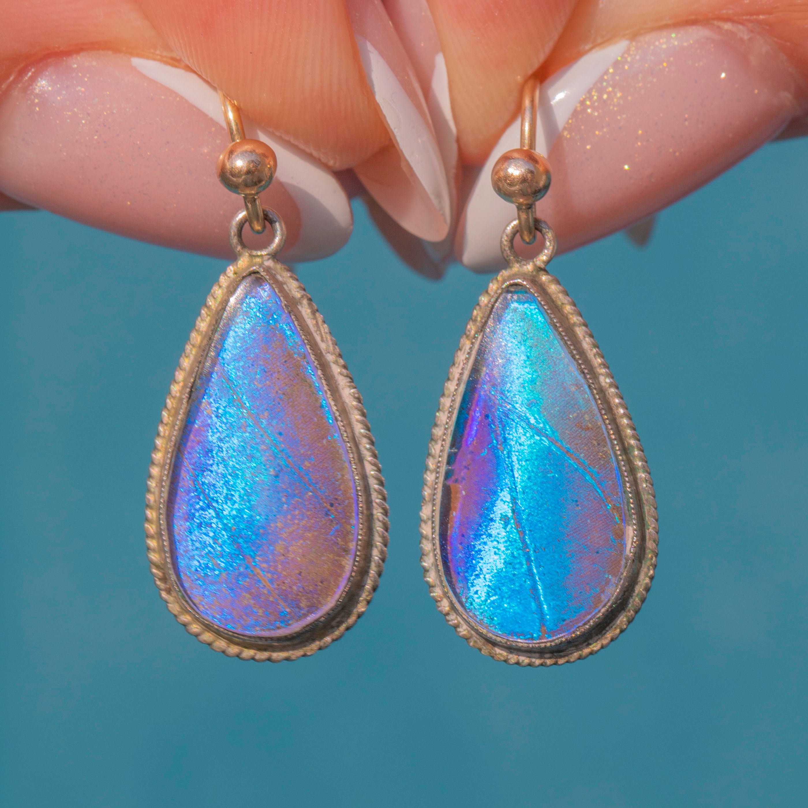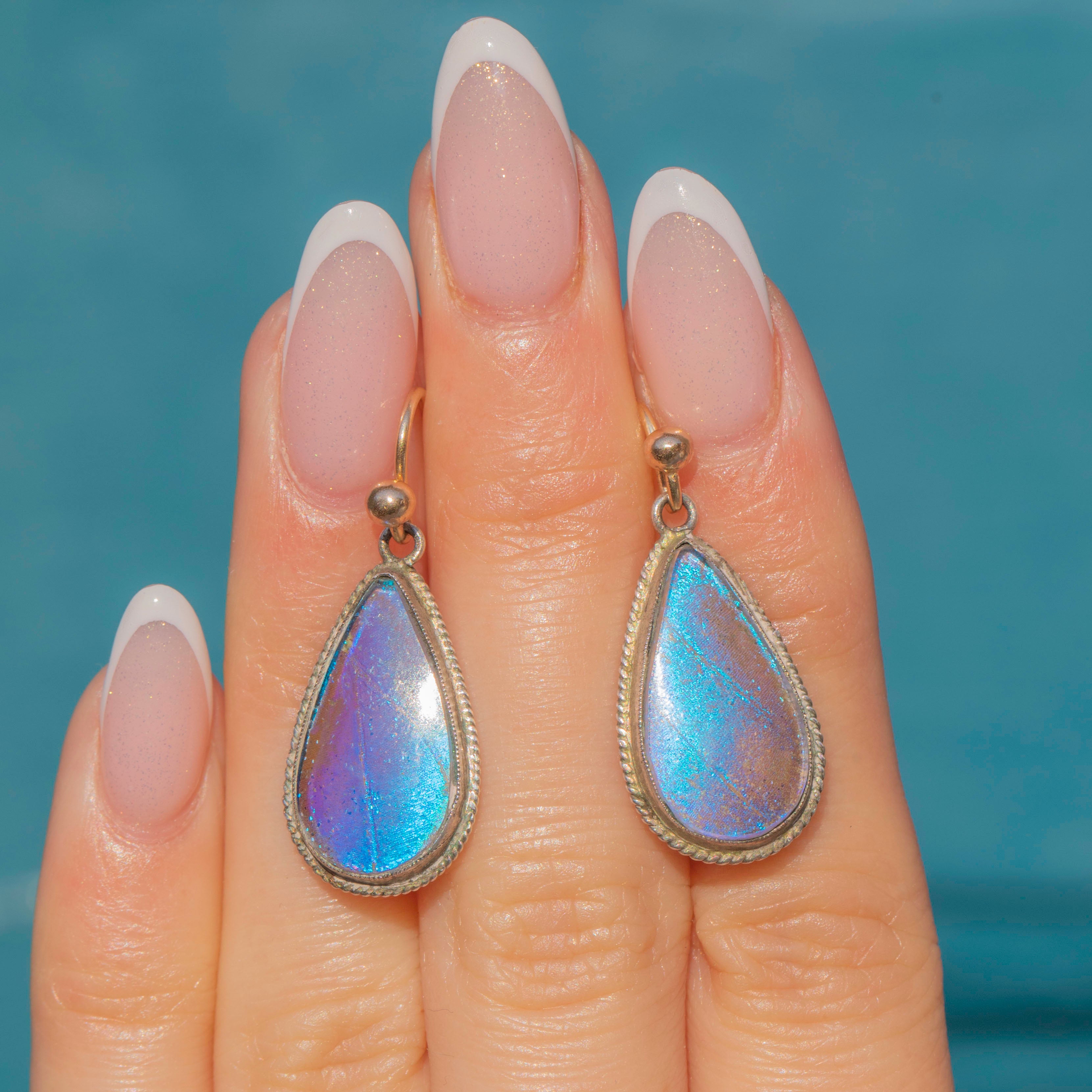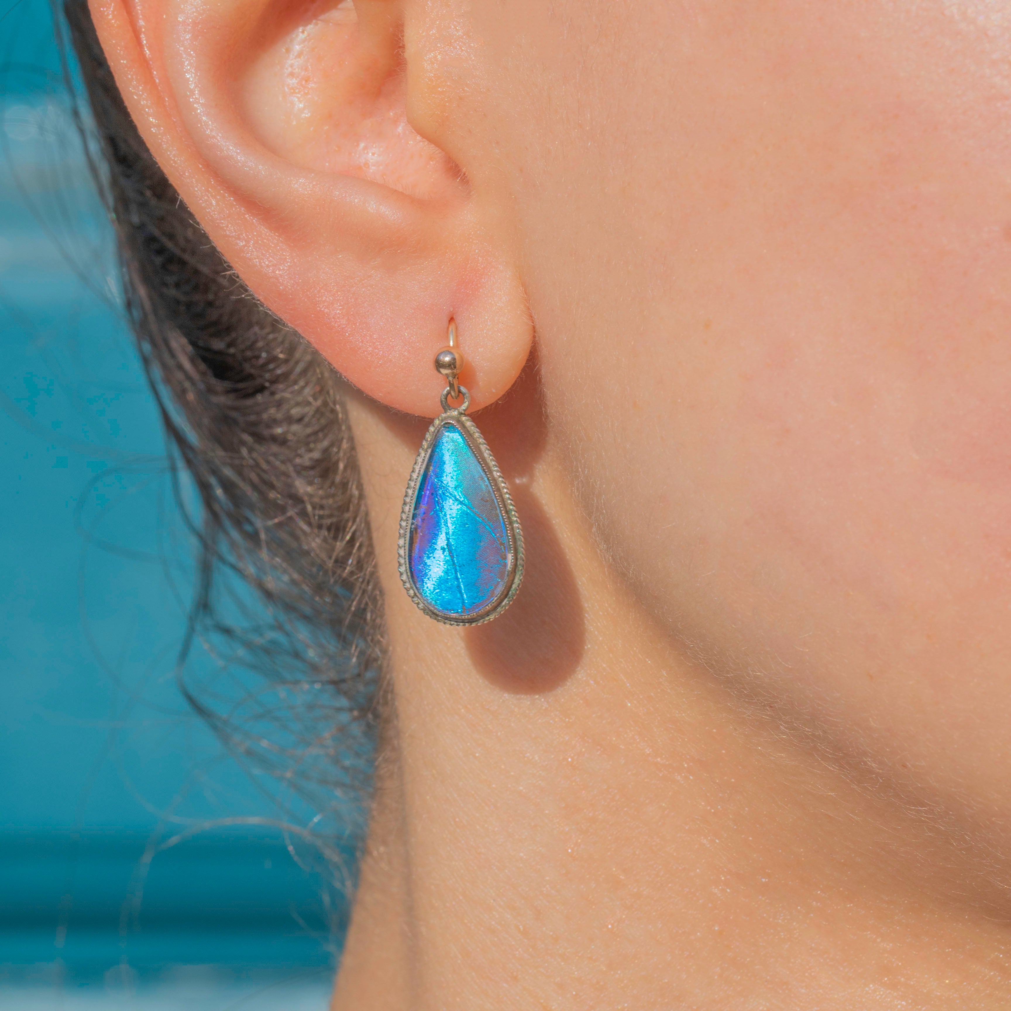 These antique drop earrings each feature a radiant Morpho butterfly wing, projecting magnificent iridescent blues and violets as they capture the light. The wings are set within glossy Silver pear drop bezels, with a detailed rope border which adds a lovely texture and depth.