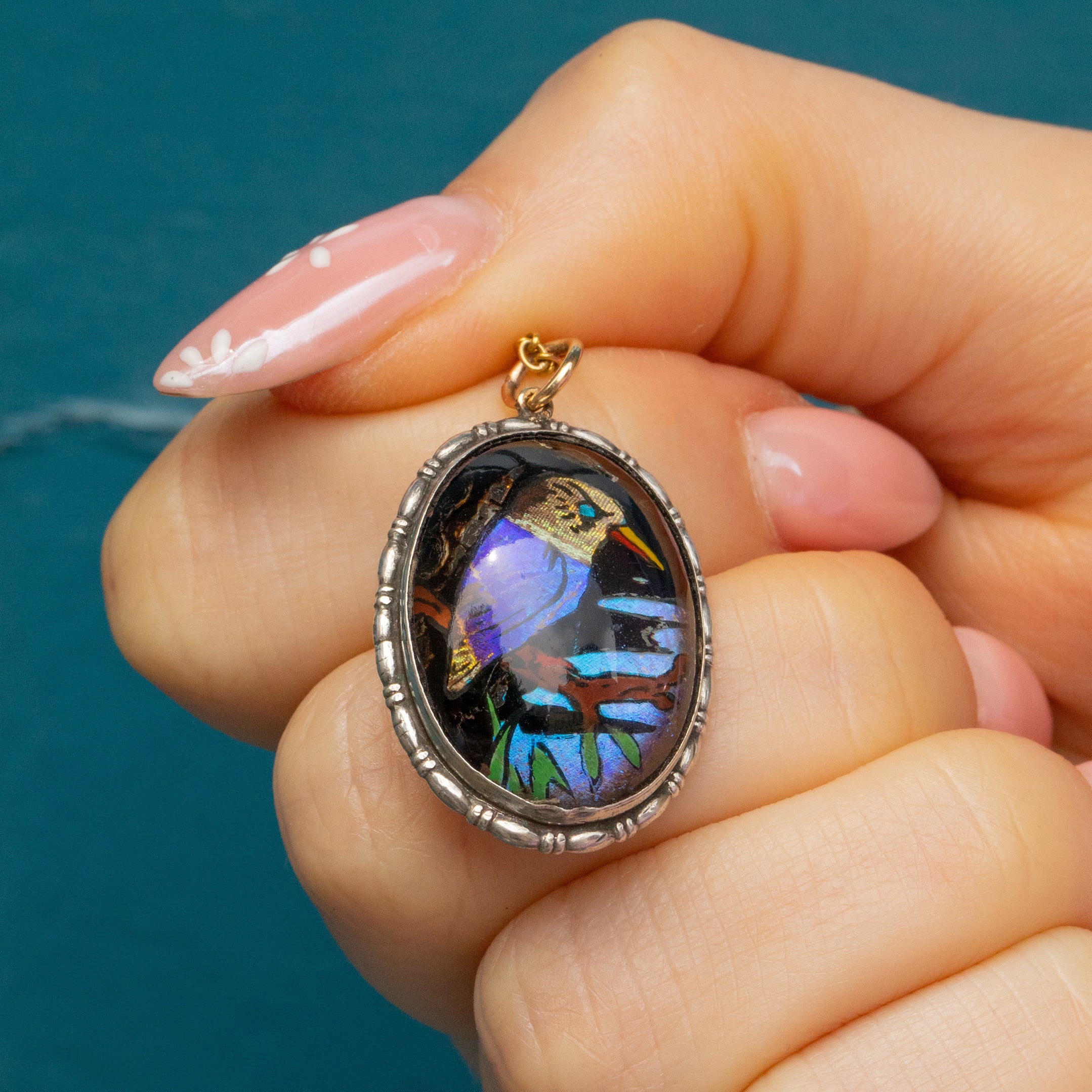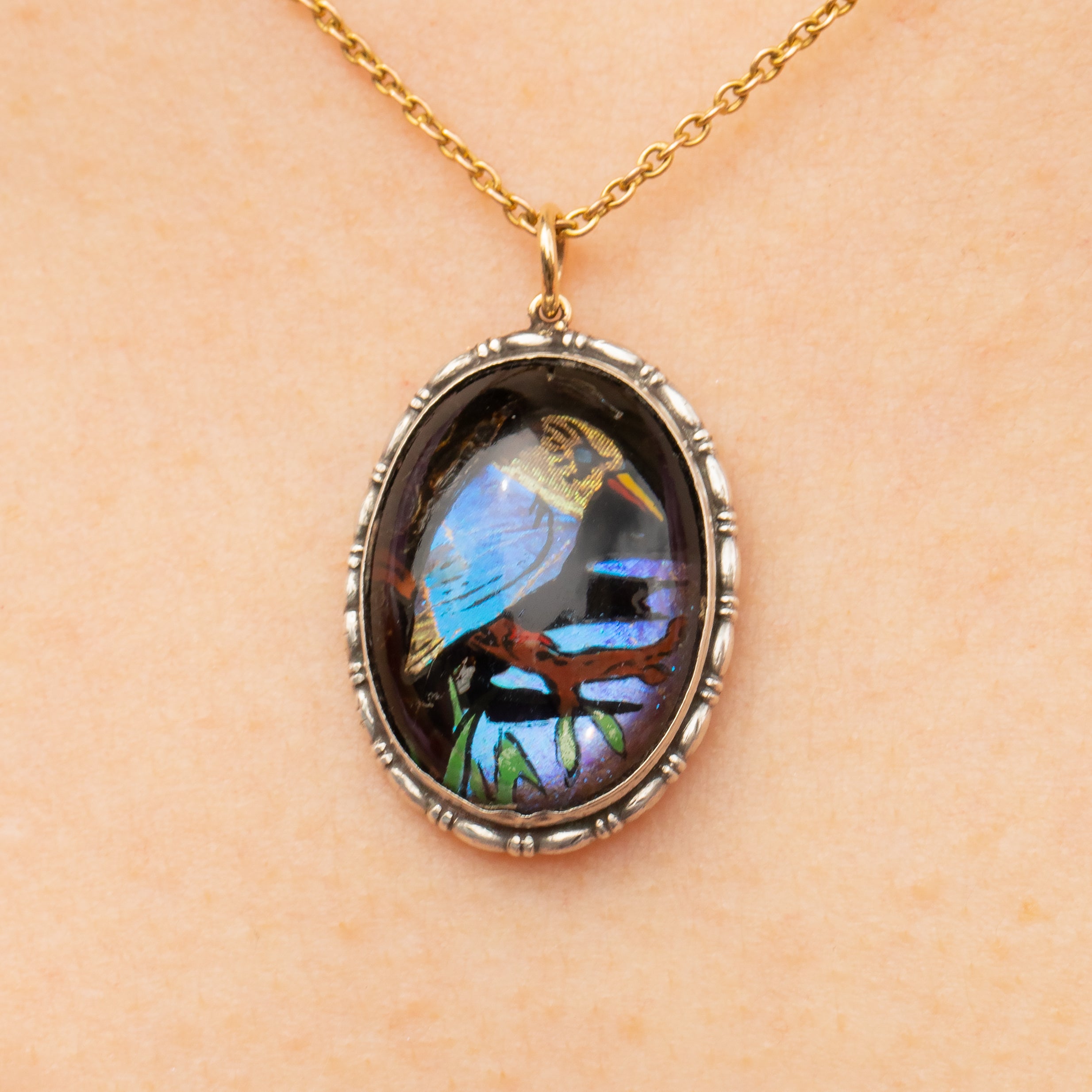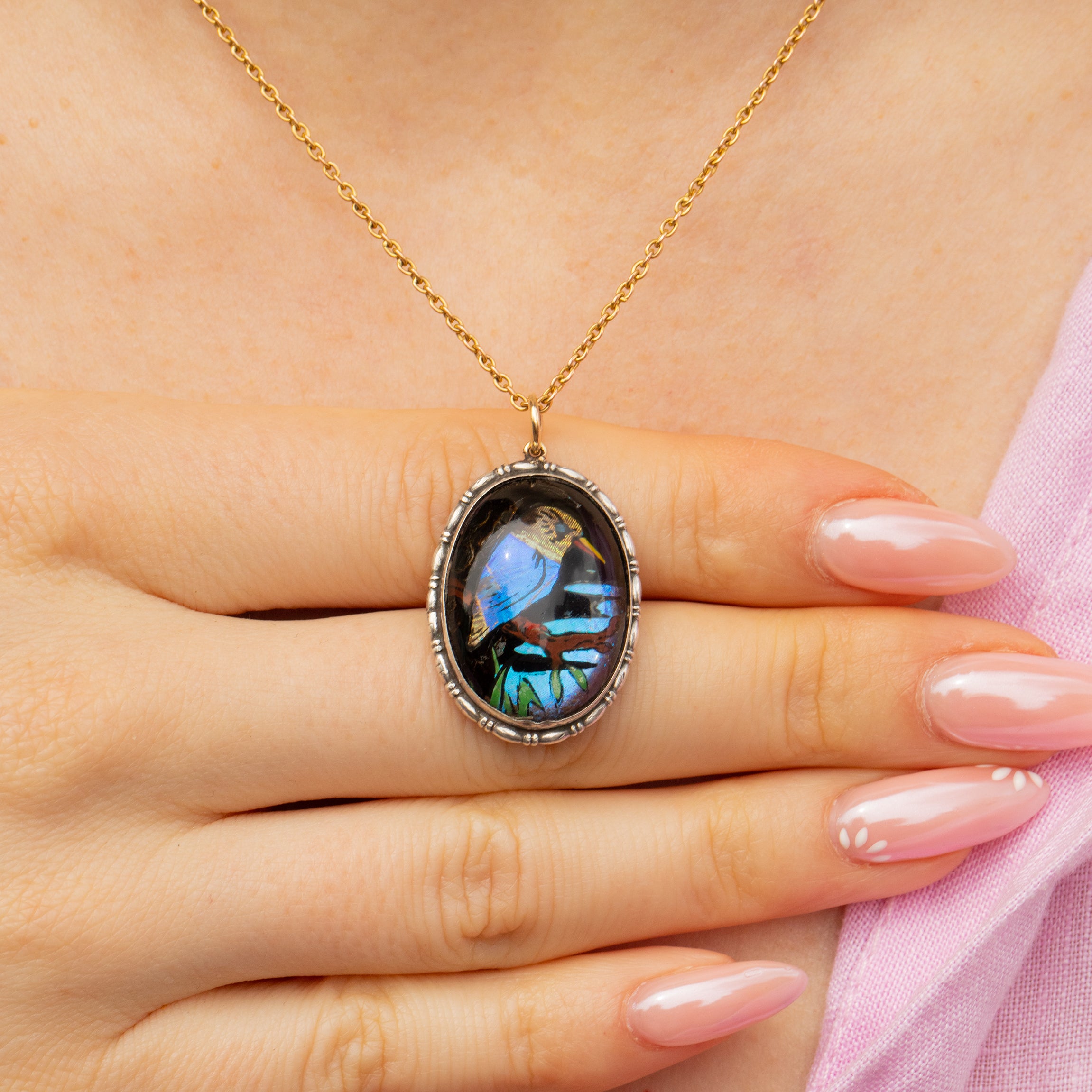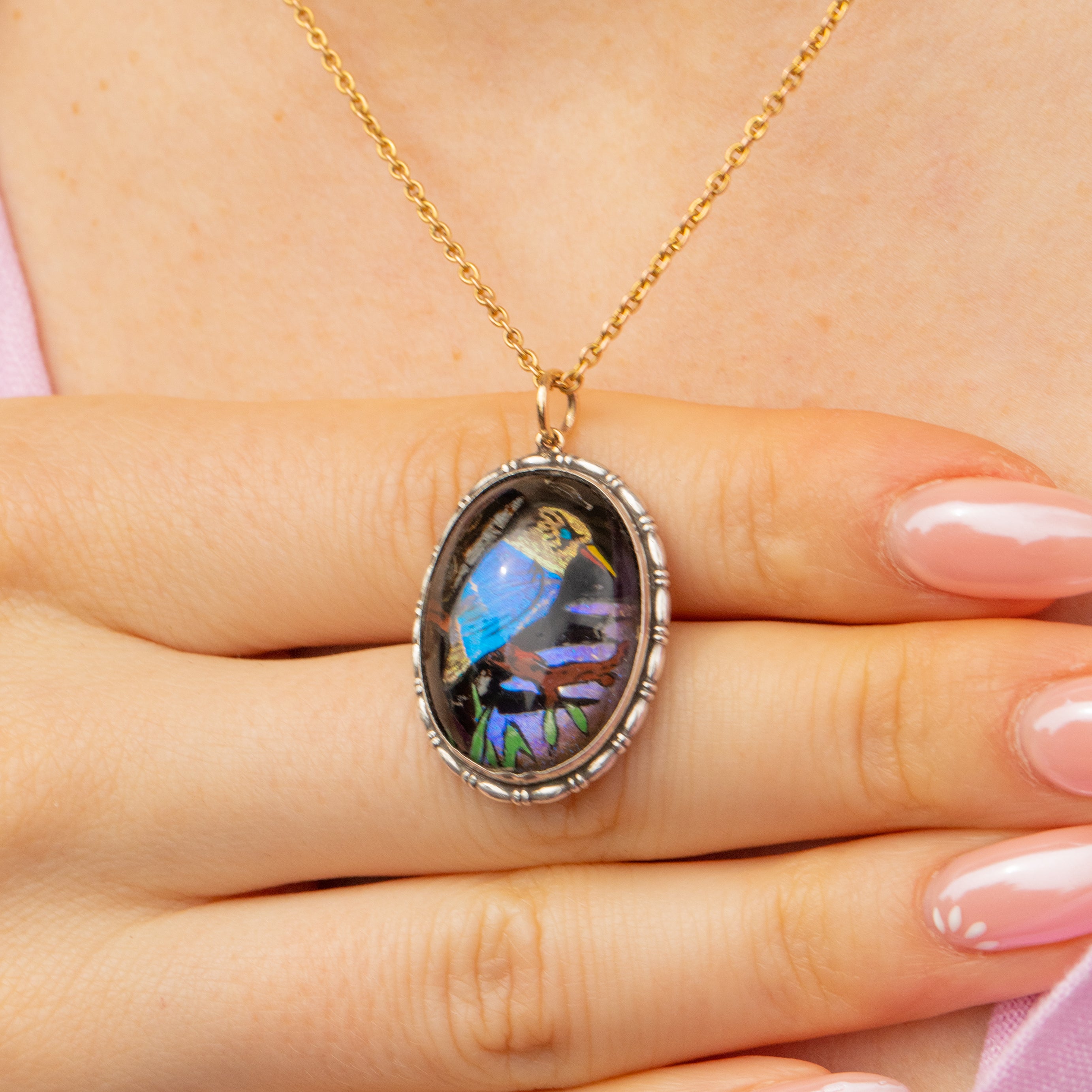 If you're a lover of all things nature, this Art Deco Silver butterfly wing pendant was made for you! Skilfully using the neo-tropical Morpho blue butterfly wing with electric blue shimmers, an exotic bird motif has been crafted.
