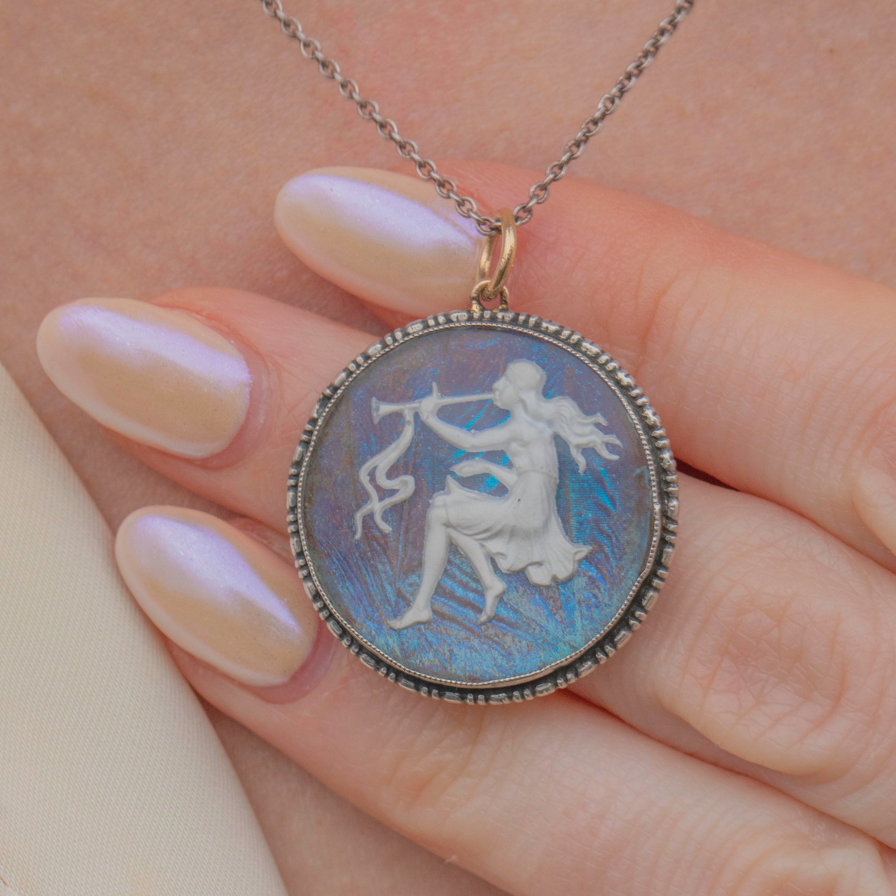 Using the natural beauty of a shimmering electric blue Morpho butterfly wing as a background, a crisp motif of the Goddess Pheme sits in front, creating a striking contrast of shimmering beauty.