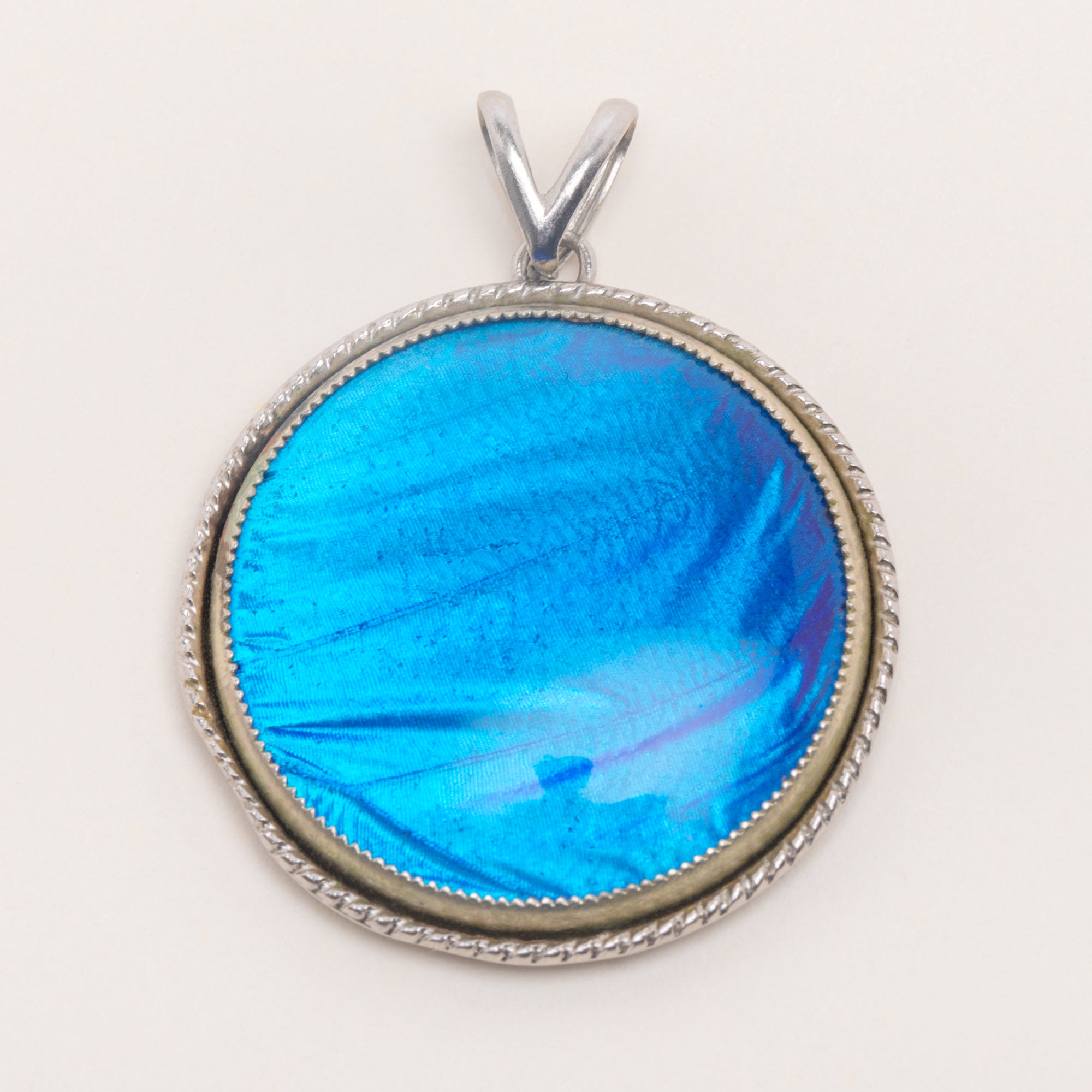 EXCELLENT. This Art Deco Silver round butterfly wing pendant is in wonderful condition. The butterfly wing is immaculate and well-presented within its original glass frame.