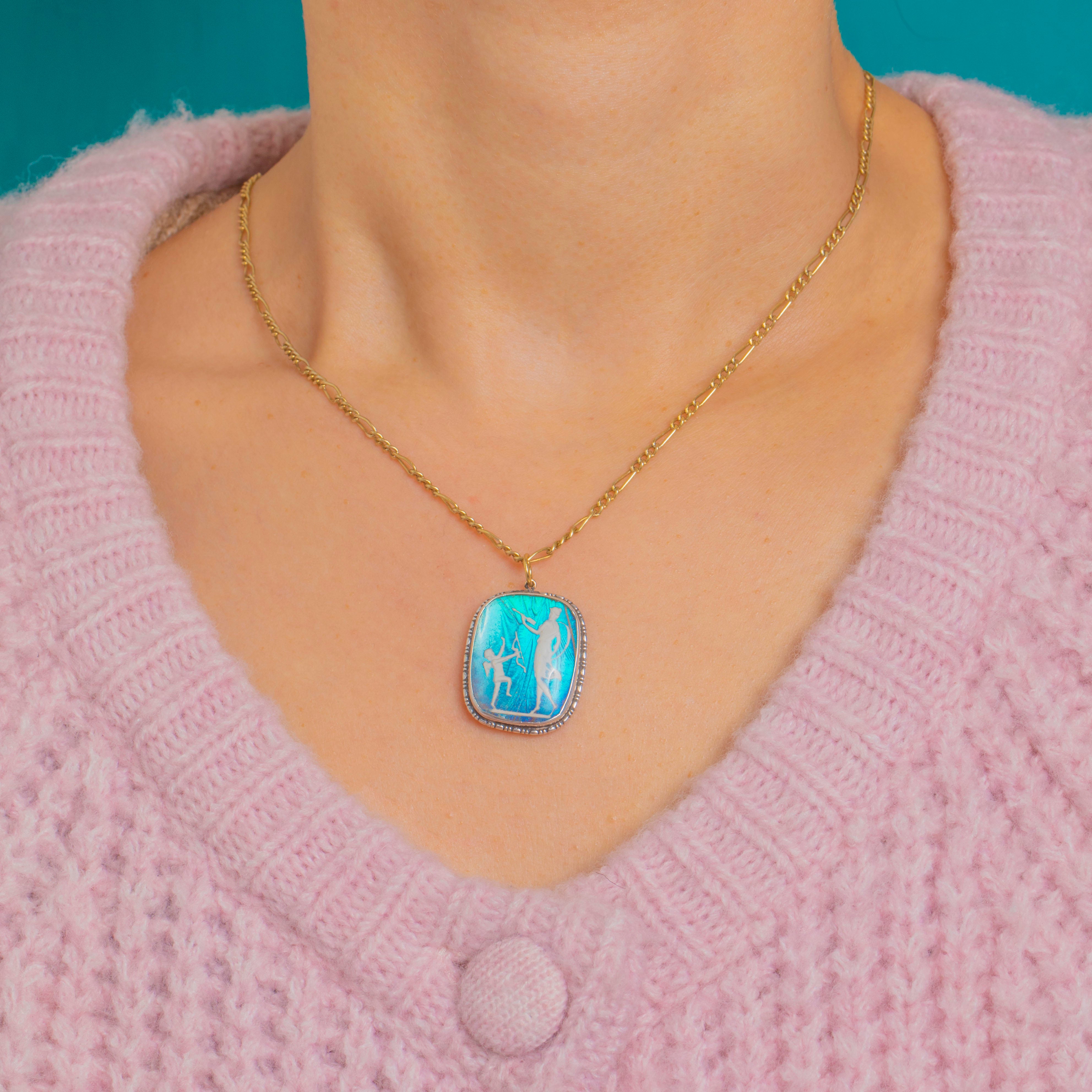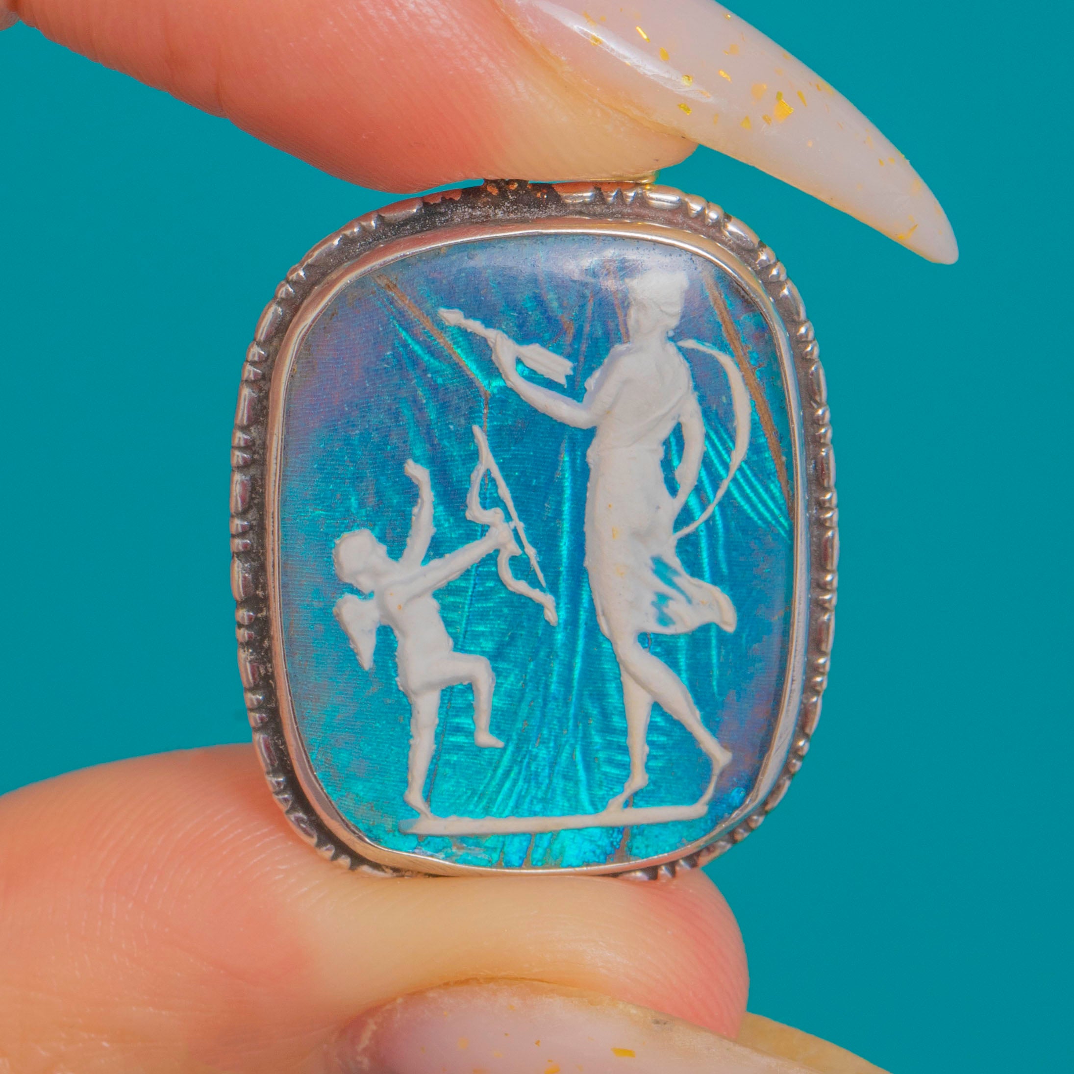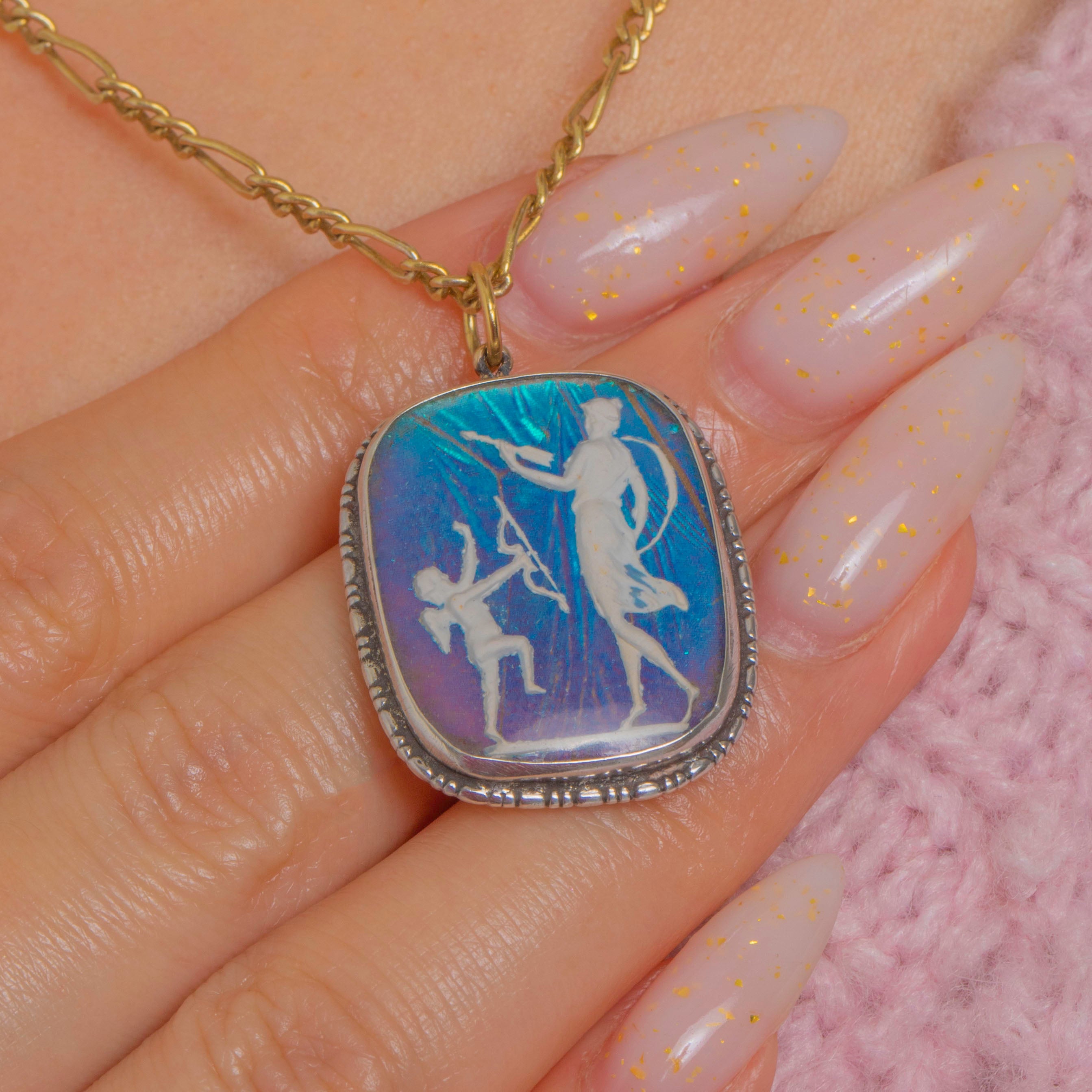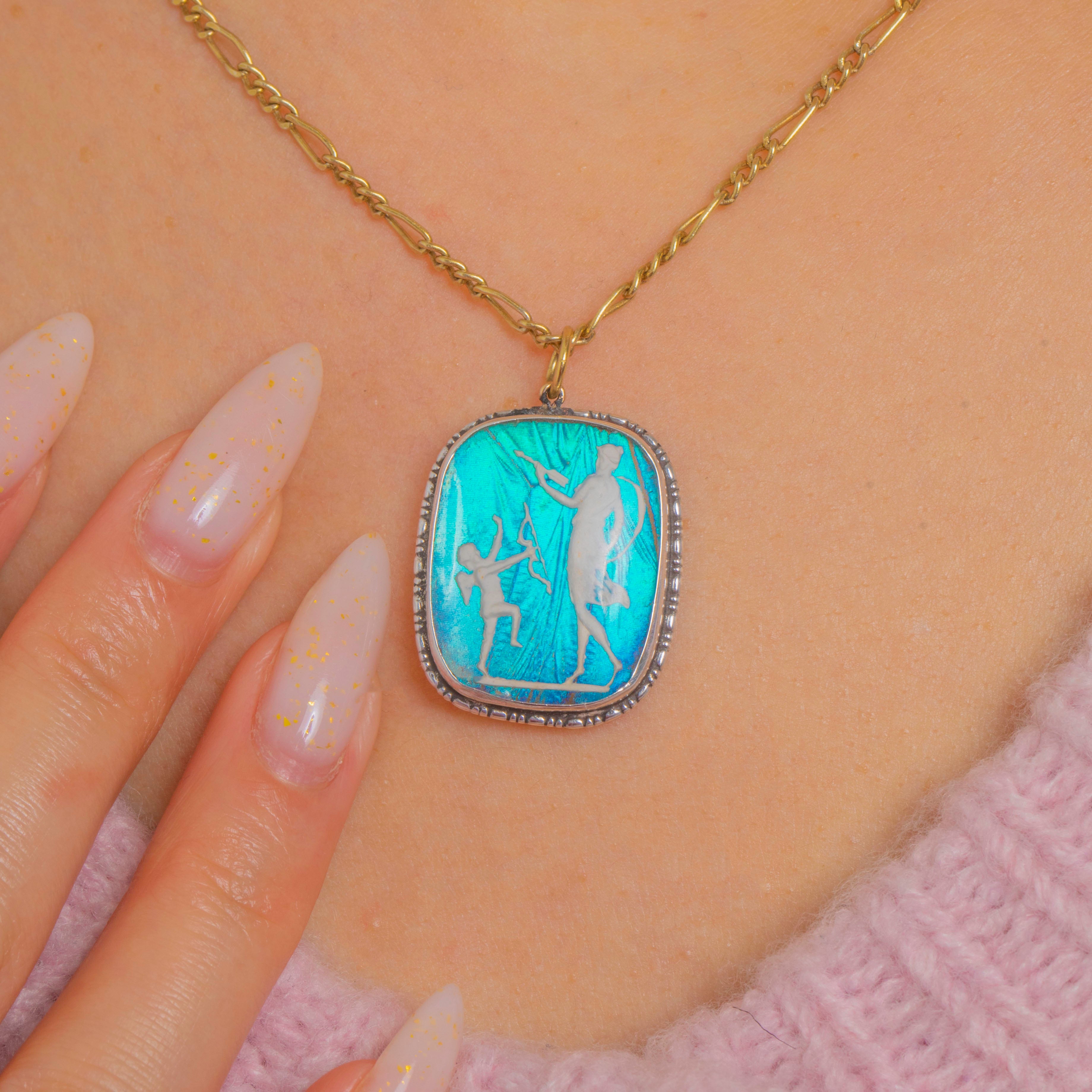 A jewel of pure Art Deco romance, this Sterling Silver pendant pairs the ethereal shimmer of Morpho butterfly with a classical scene of Cupid and Psyche in crisp white relief. The iridescent aqua-to-violet ground glows with peacock-like colour, while the cushion-rectangular plaque is framed by a refined beaded milgrain bezel for a distinctly Deco silhouette.