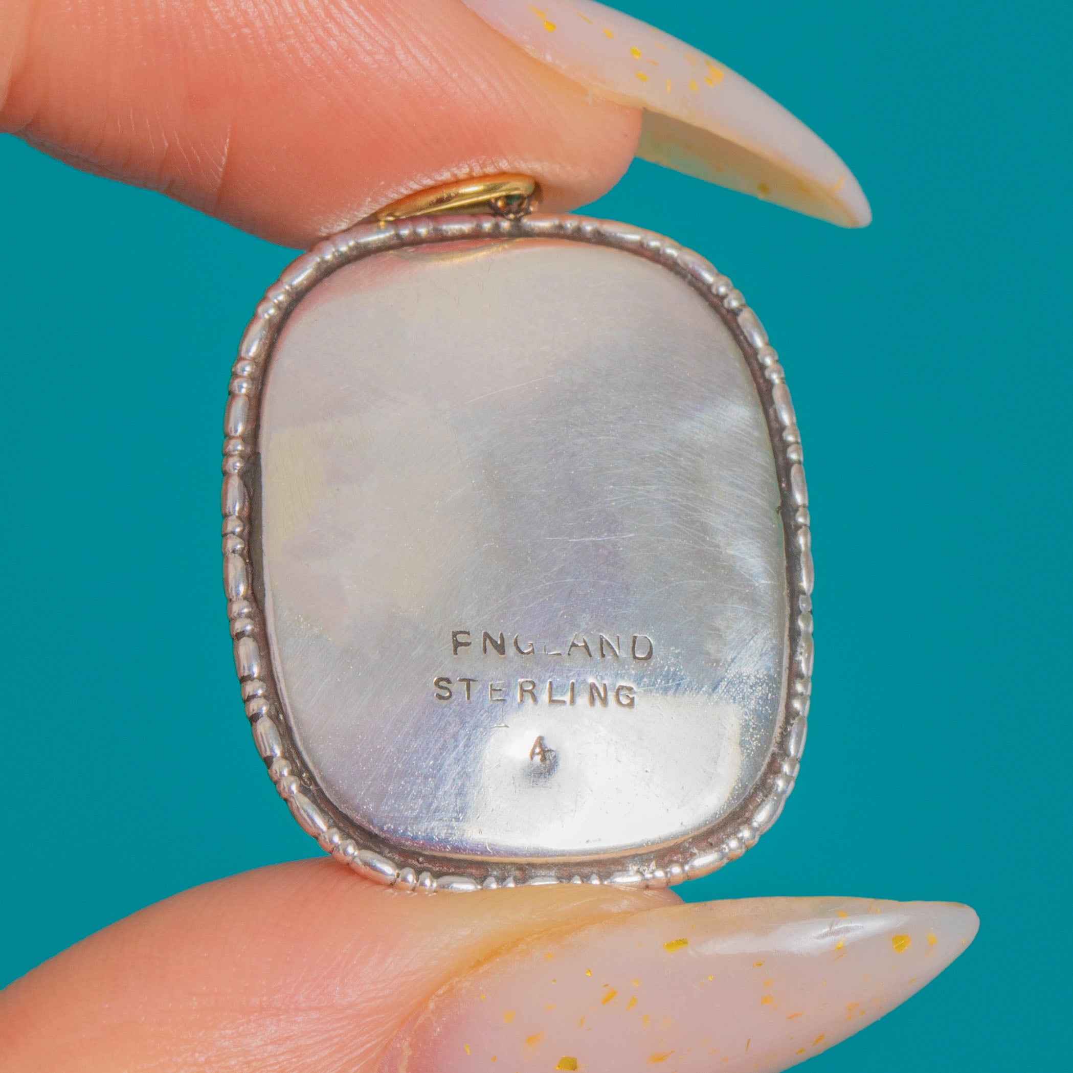 Beautifully made with a closed, polished back stamped “ENGLAND STERLING” and finished with a 9ct Gold jump ring, it’s a captivating, cameo-like miniature that brings movement and light to every look.