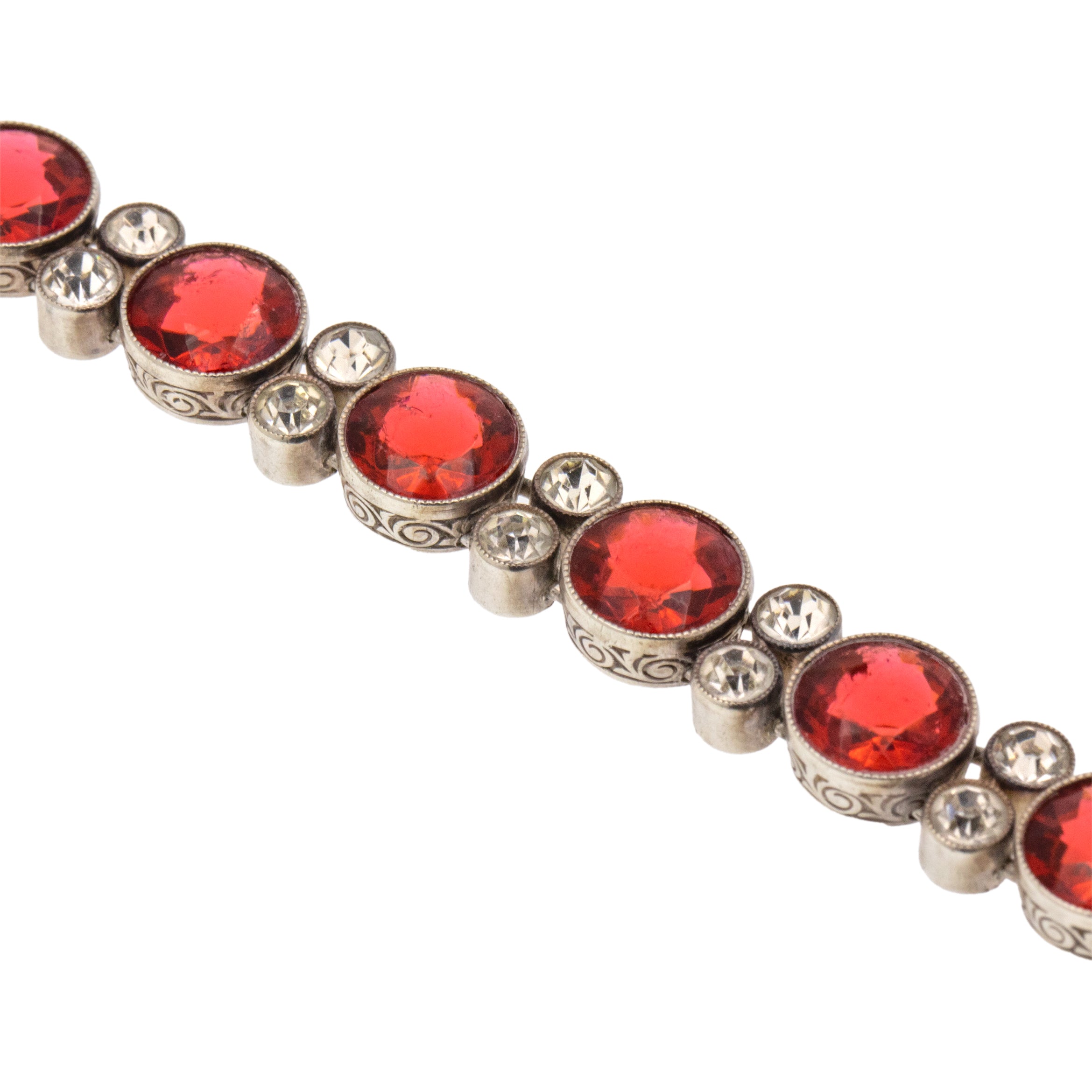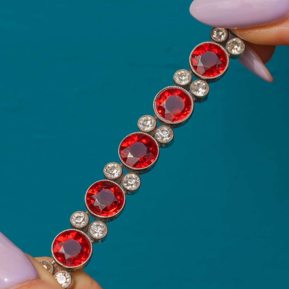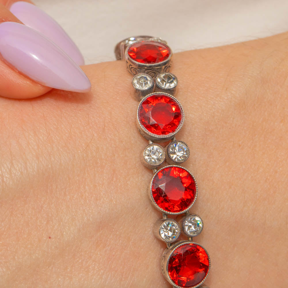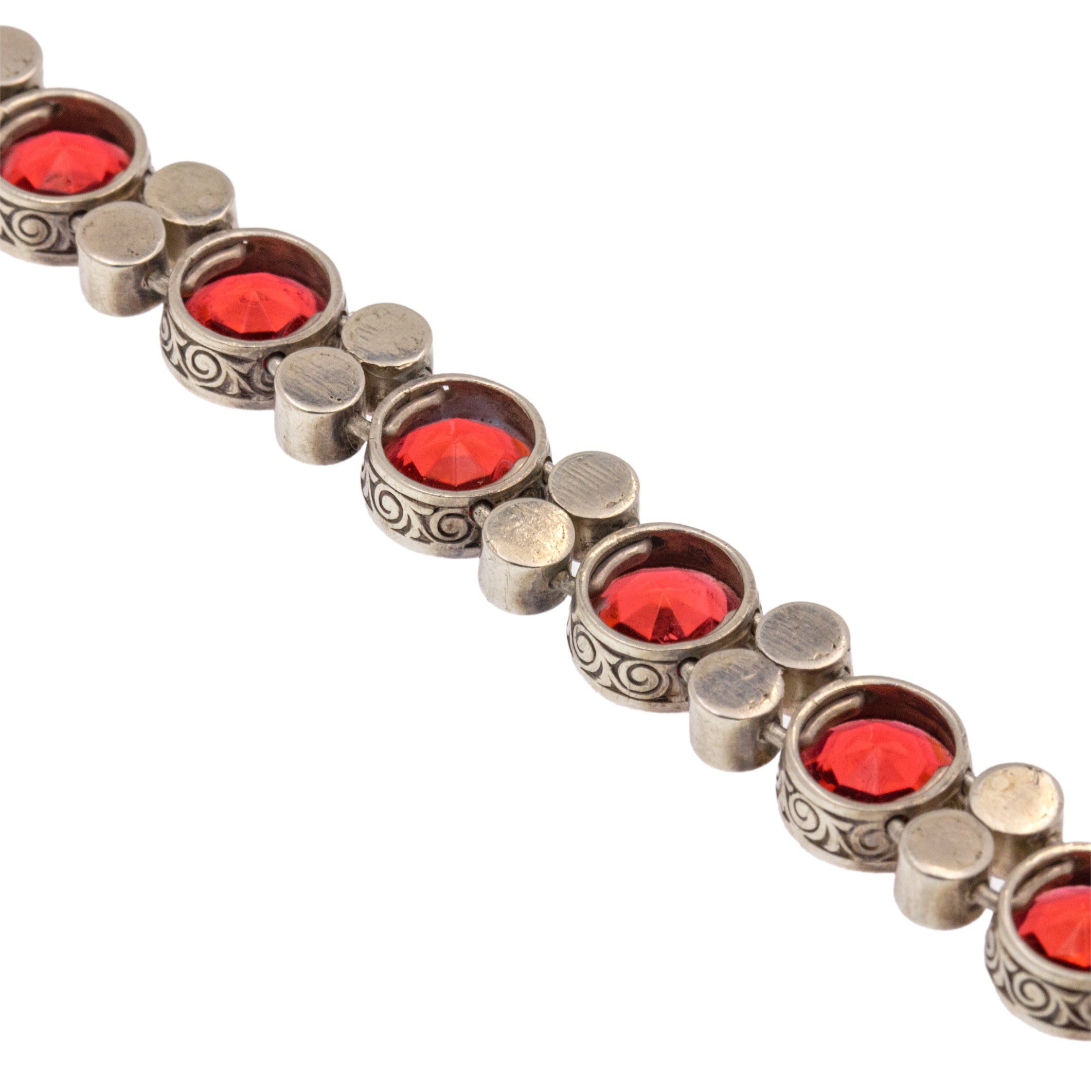 VERY GOOD-EXCELLENT. This Art Deco Silver round orange Paste bracelet is in wonderful condition. The Paste gemstones are all present and securely held within their bezels with crisp facets that twinkle from afar. Some of the Paste do have some subtle wear, including a small chip on the orange Paste on the clasp, but this is only noticeable under inspection. The Silver is lustrous and the engraved details have all remained crisp, and with a secure clasp, this antique Paste bracelet promises many more years of wear!
