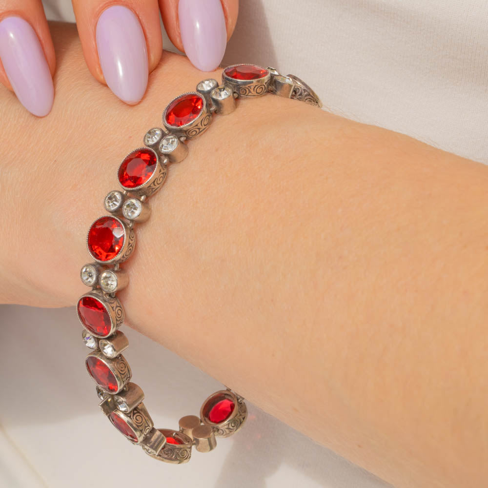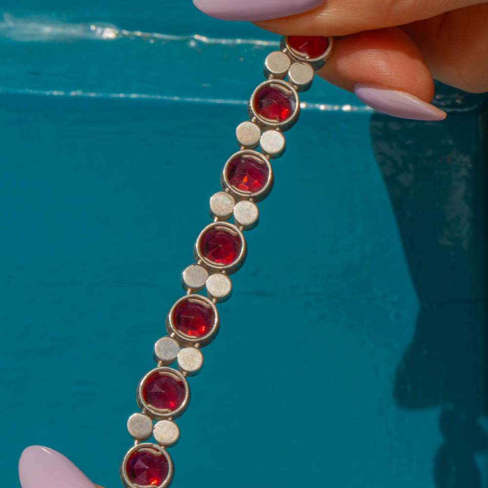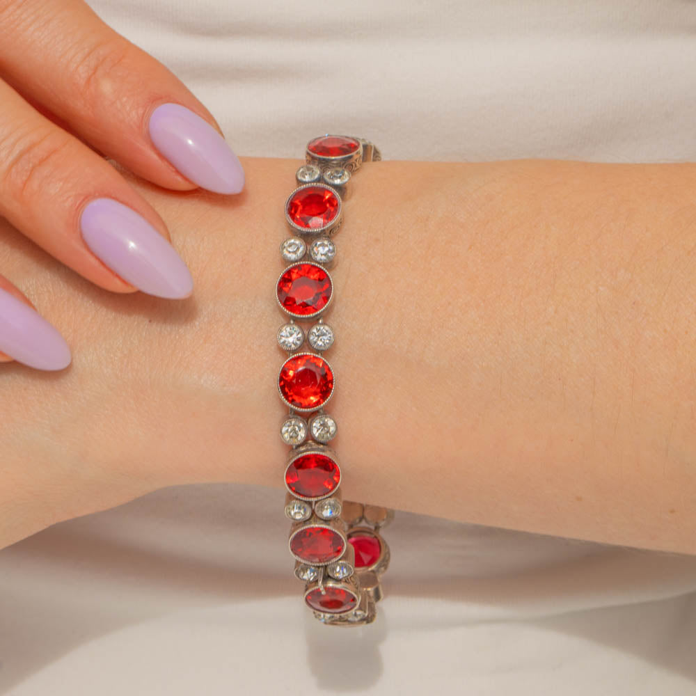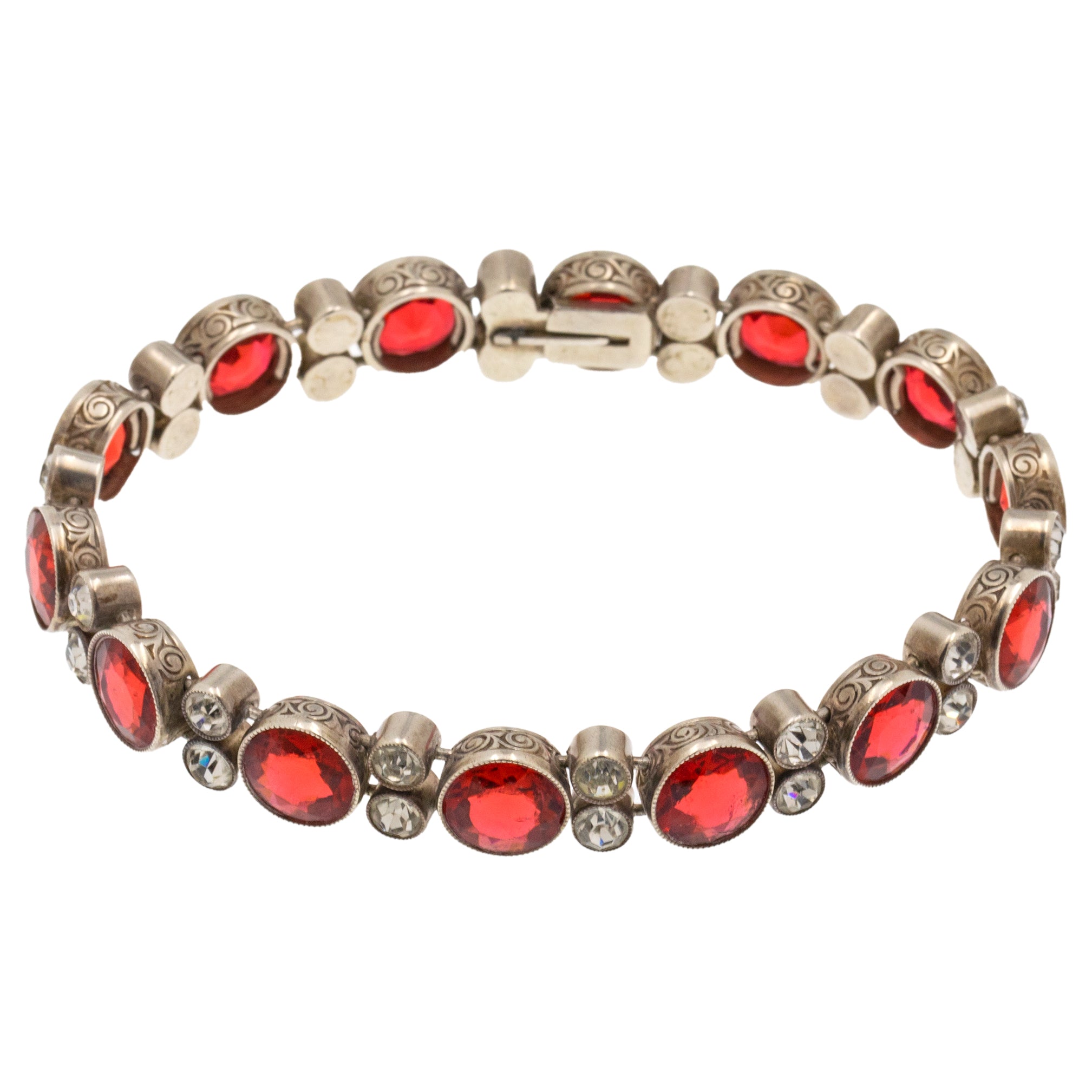 VERY GOOD-EXCELLENT. This Art Deco Silver round orange Paste bracelet is in wonderful condition. The Paste gemstones are all present and securely held within their bezels with crisp facets that twinkle from afar. Some of the Paste do have some subtle wear, including a small chip on the orange Paste on the clasp, but this is only noticeable under inspection. The Silver is lustrous and the engraved details have all remained crisp, and with a secure clasp, this antique Paste bracelet promises many more years of wear!