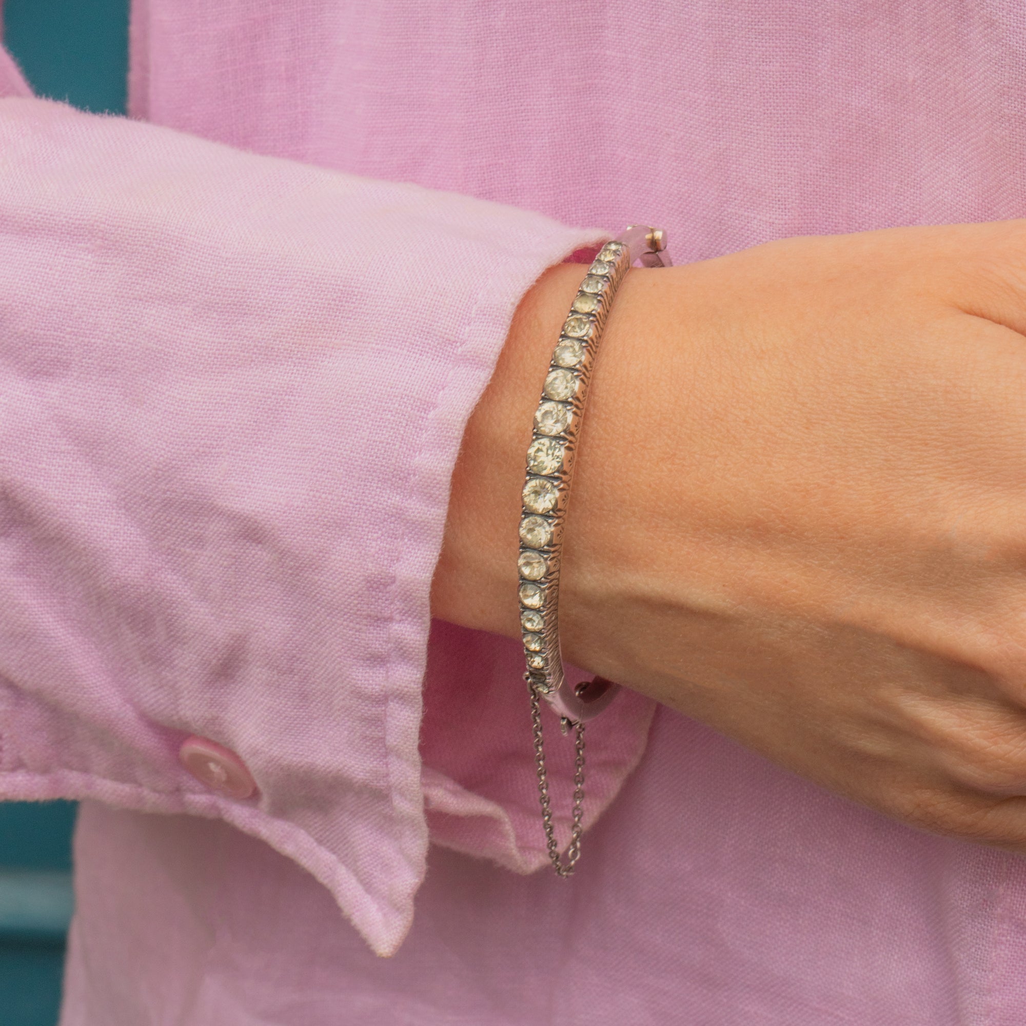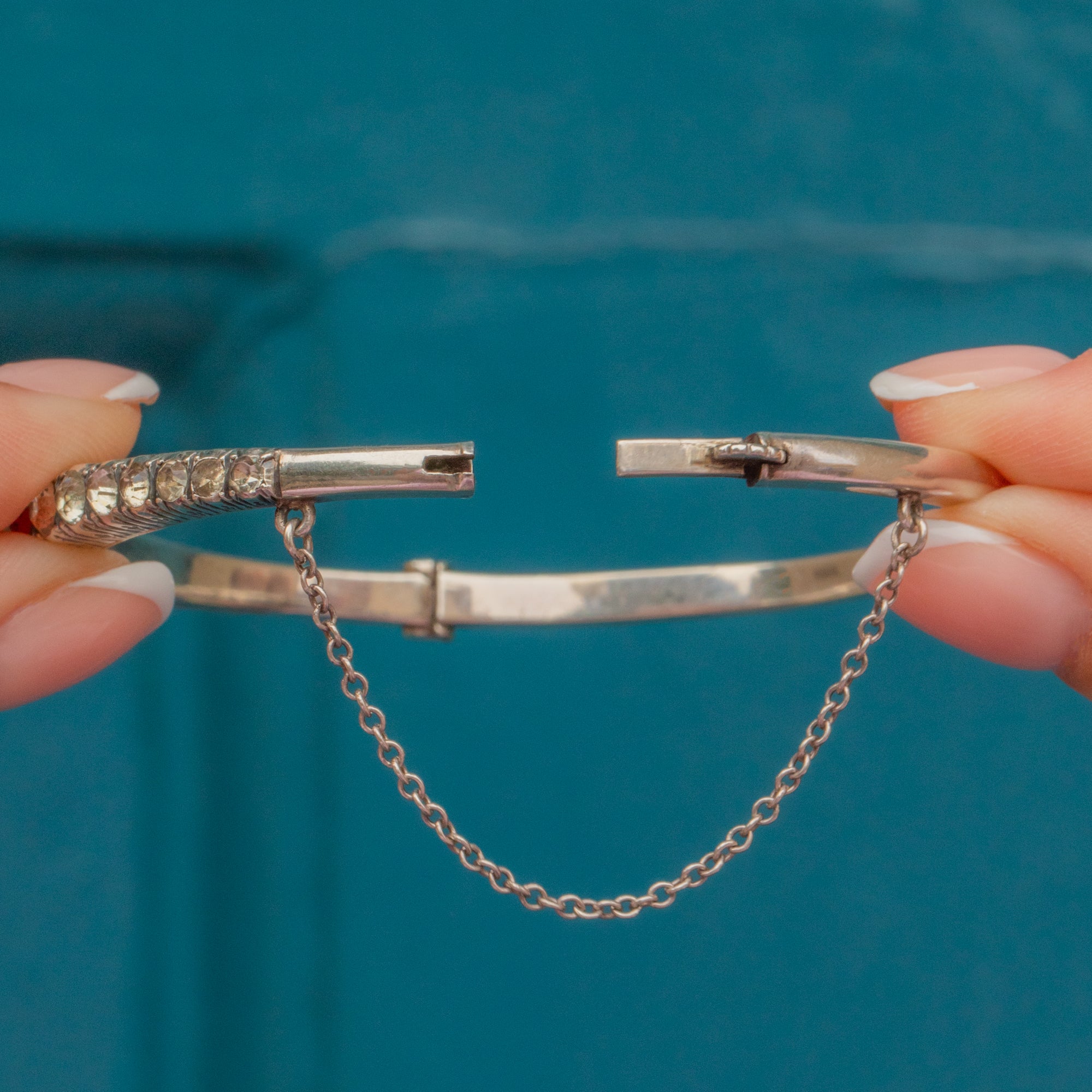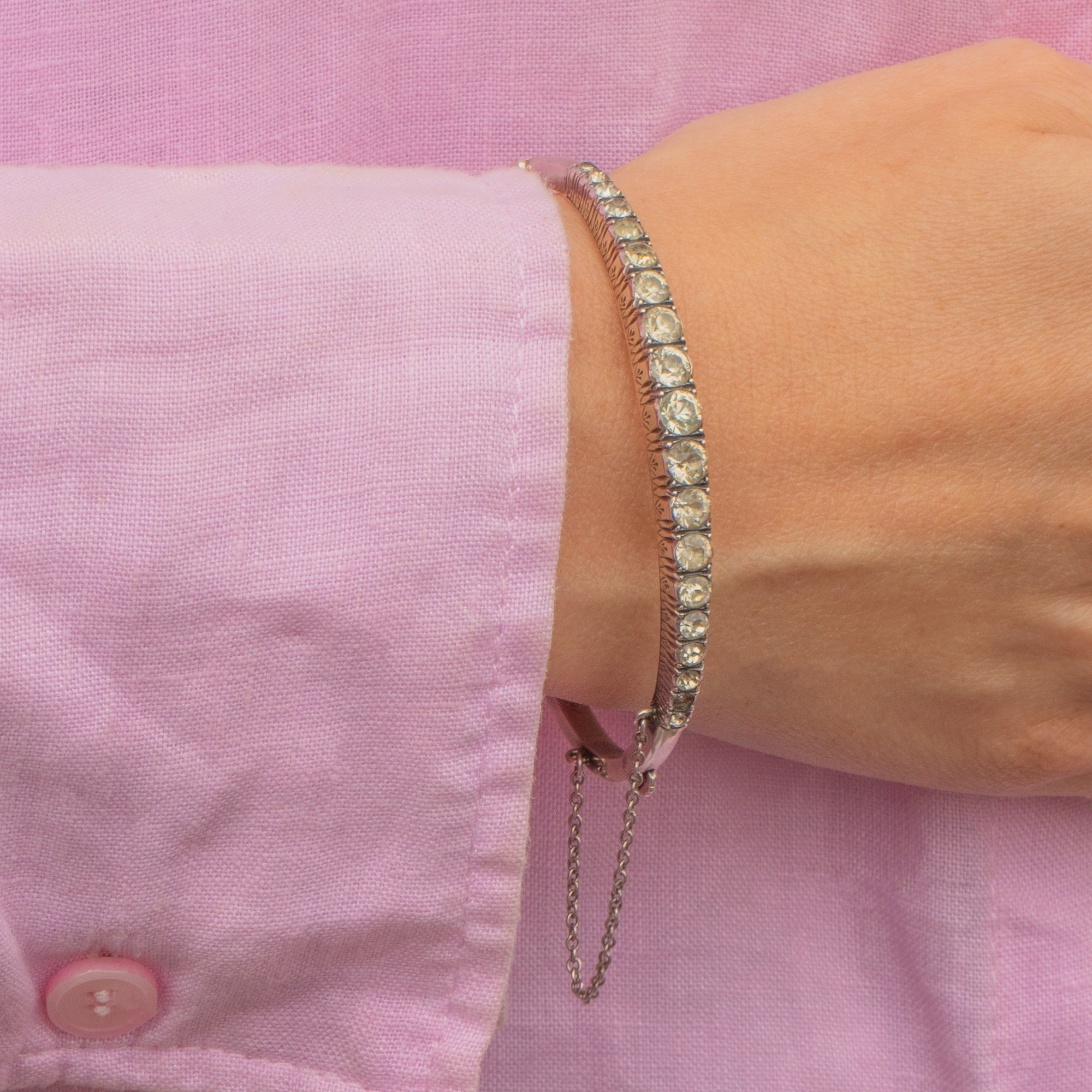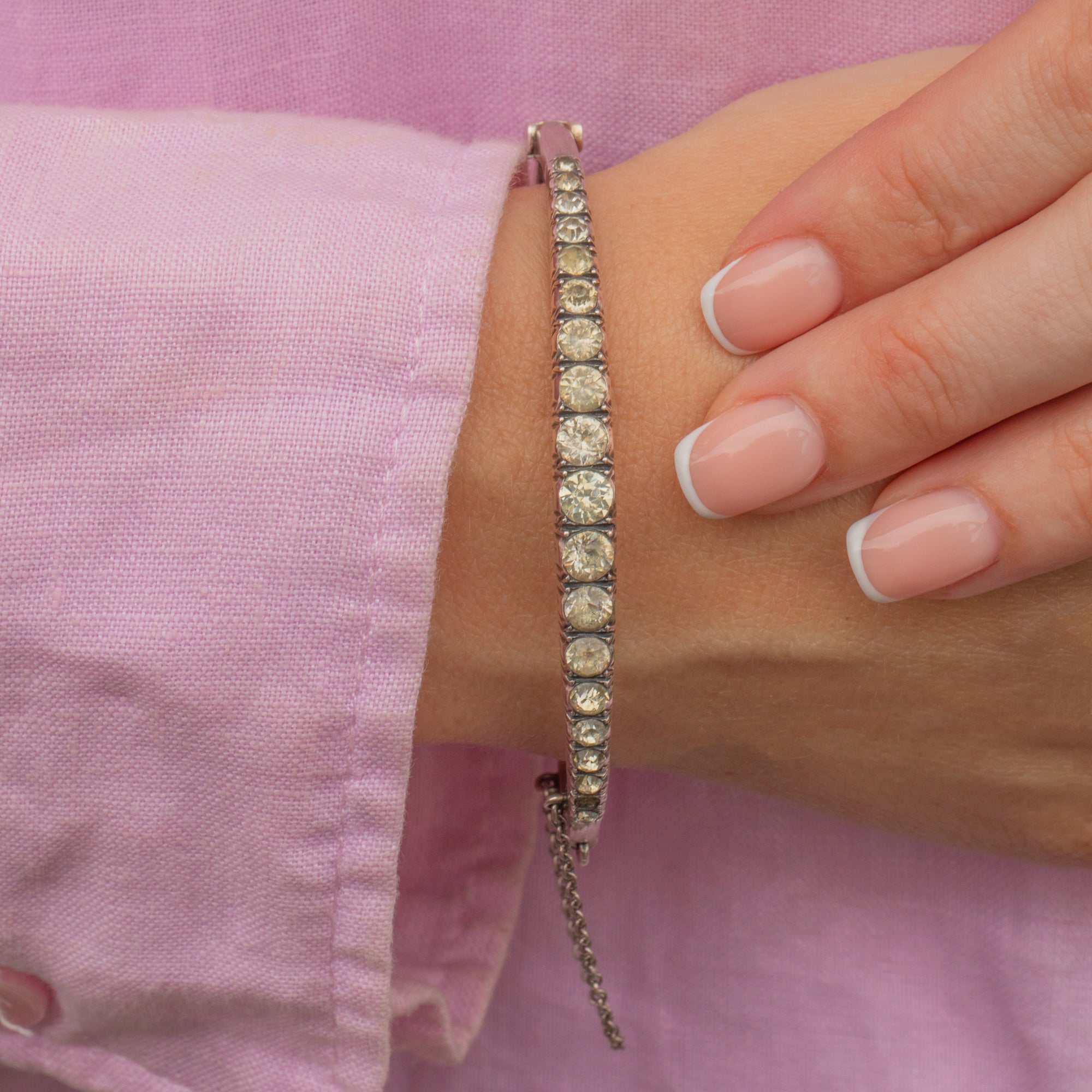 VERY GOOD-EXCELLENT. This Art Deco Silver graduating Paste bangle is in very good to excellent condition! The Paste gemstones sit securely, with a soft and harmonious sparkle throughout. The engraved details around the gallery of the gemstones are crisp and although there are a couple of dings to the to the back of the bangle, this cannot be seen when worn. with a safety chain and a firmly closing clasp, she can be worn with confidence.