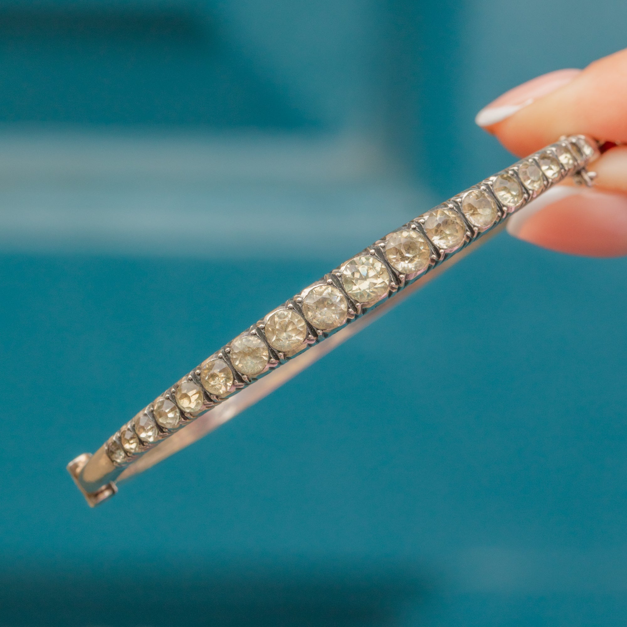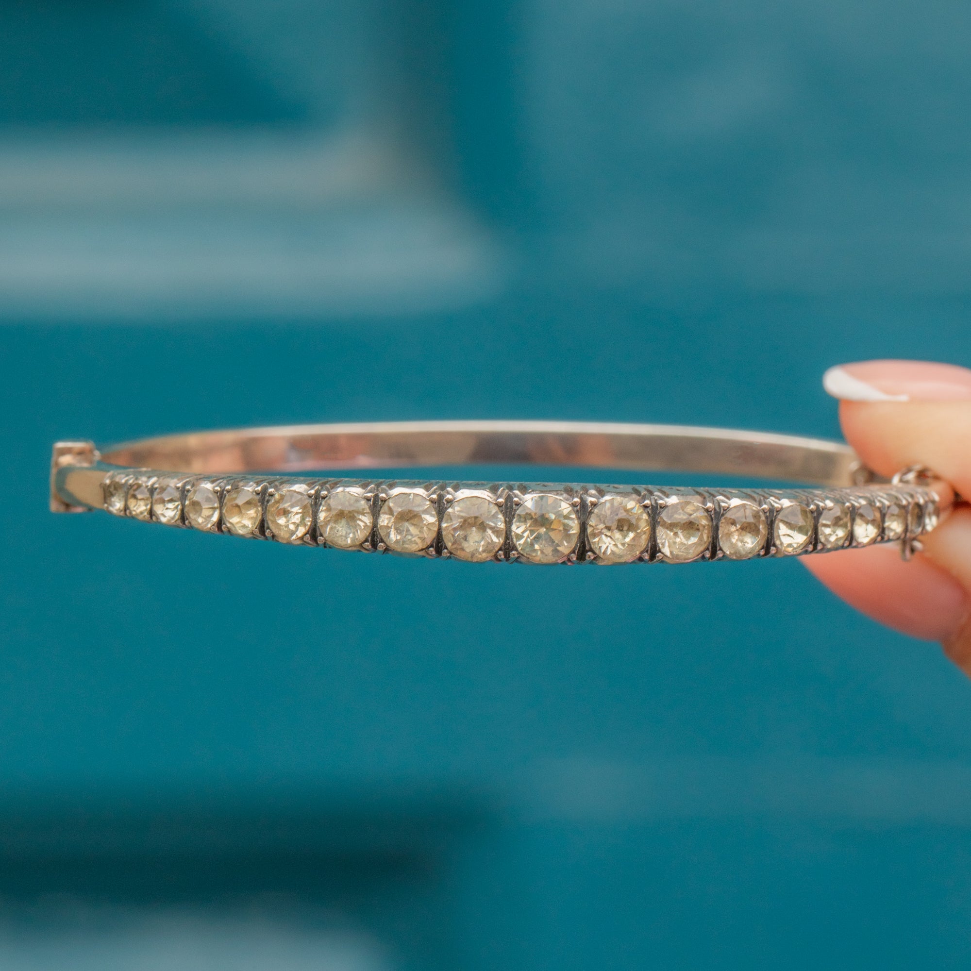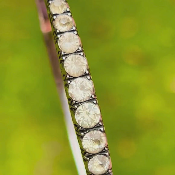 You can't go wrong with this Art Deco bracelet, the perfect accessory for those who enjoy antique techniques such as hand cut Paste gemstones. The slender form of this Paste bangle makes her easily stackable or a wonderful stand alone piece!