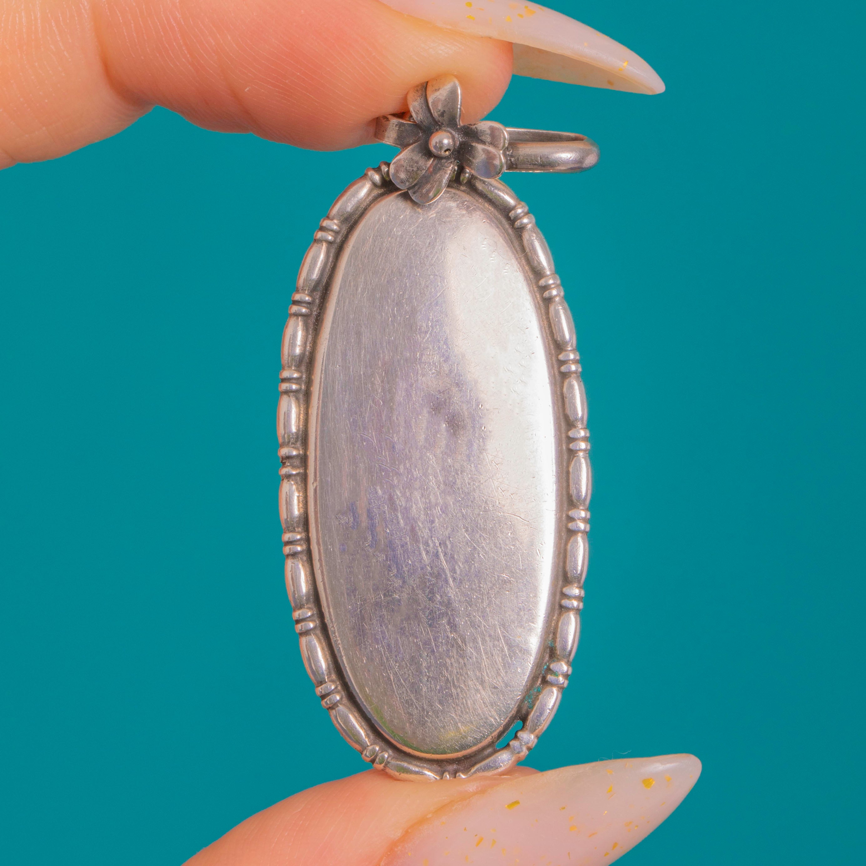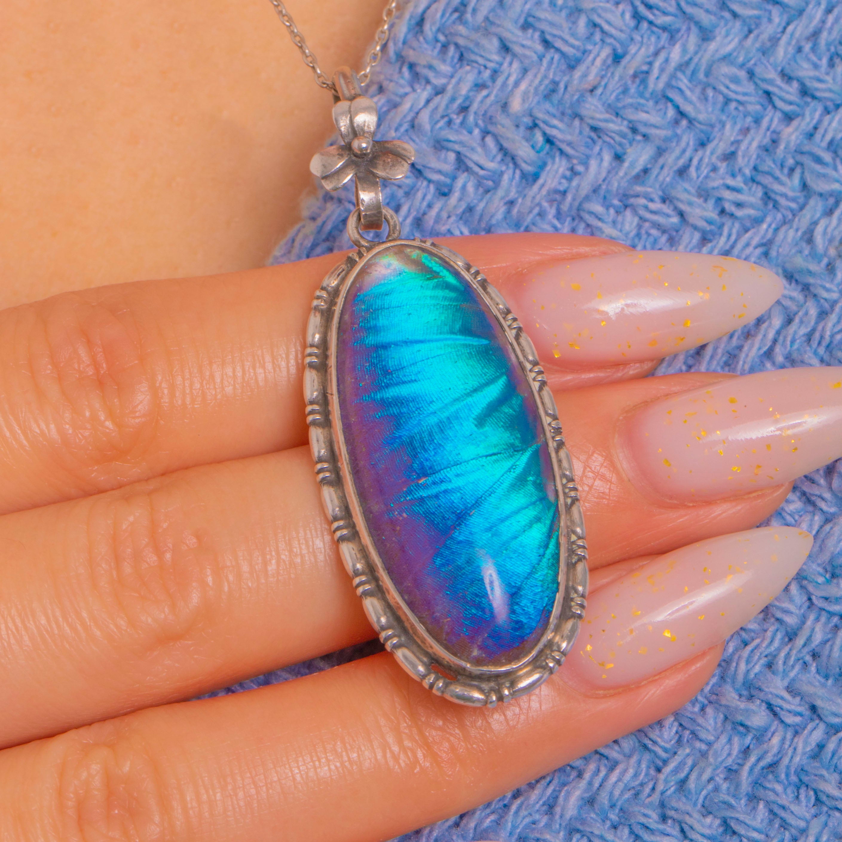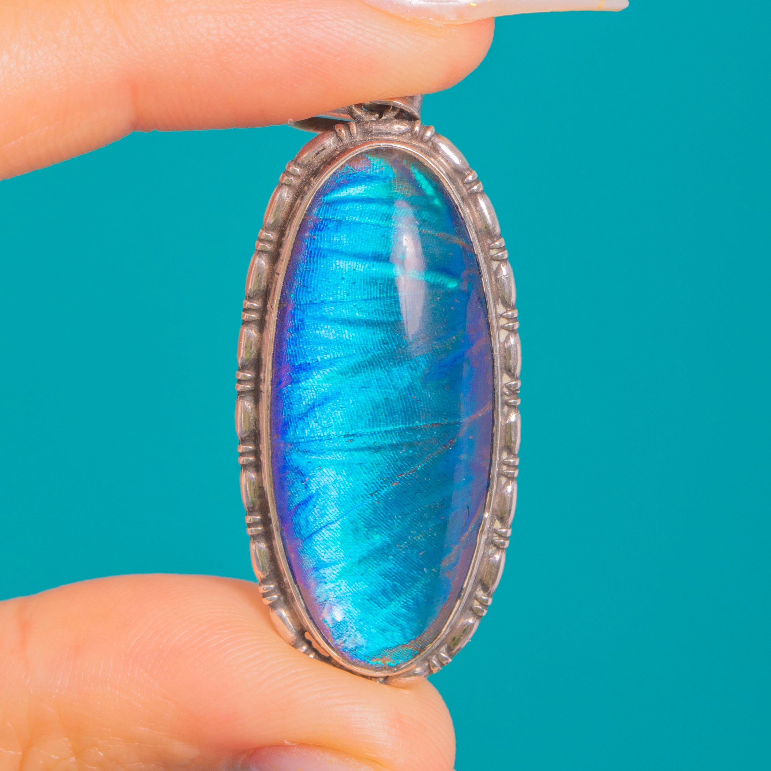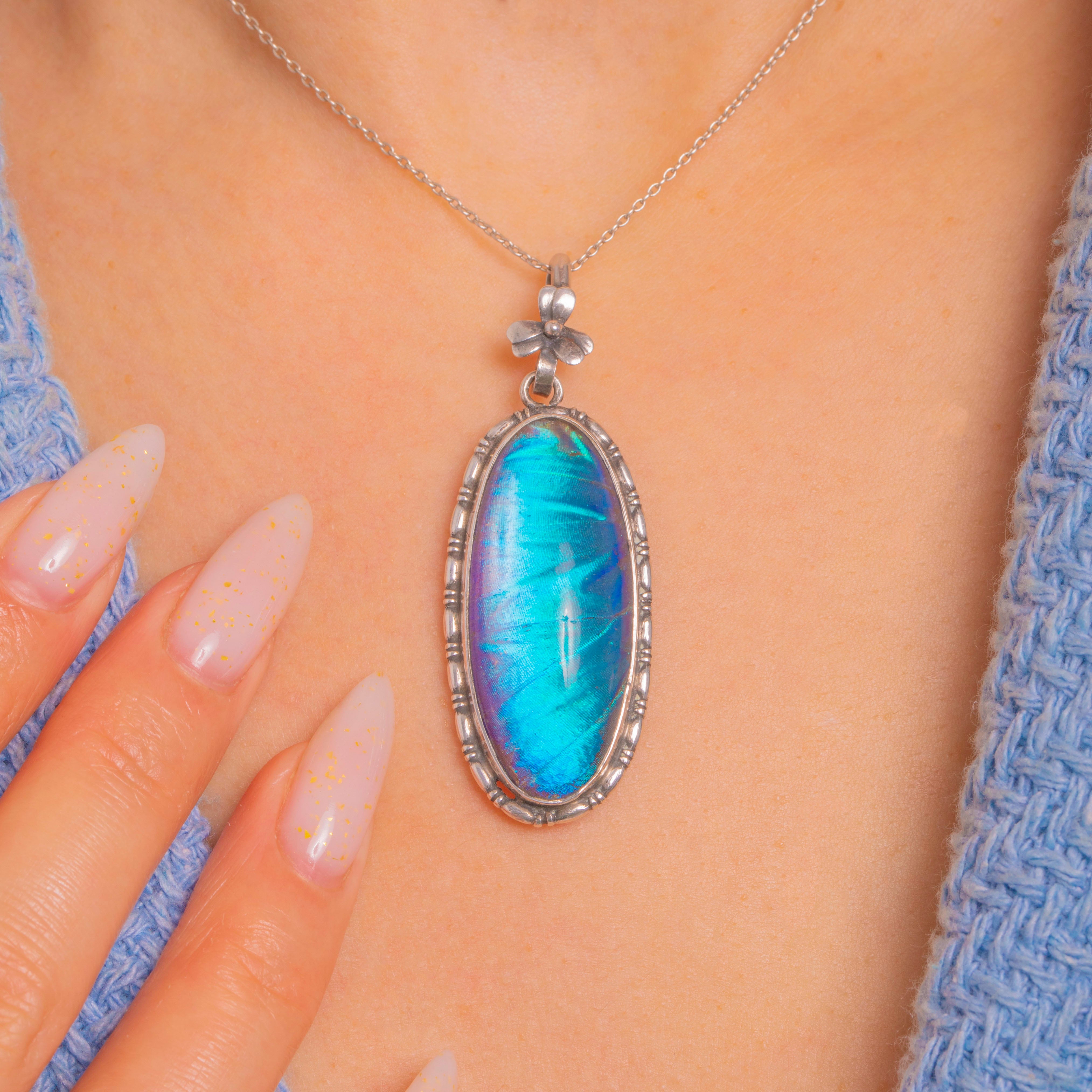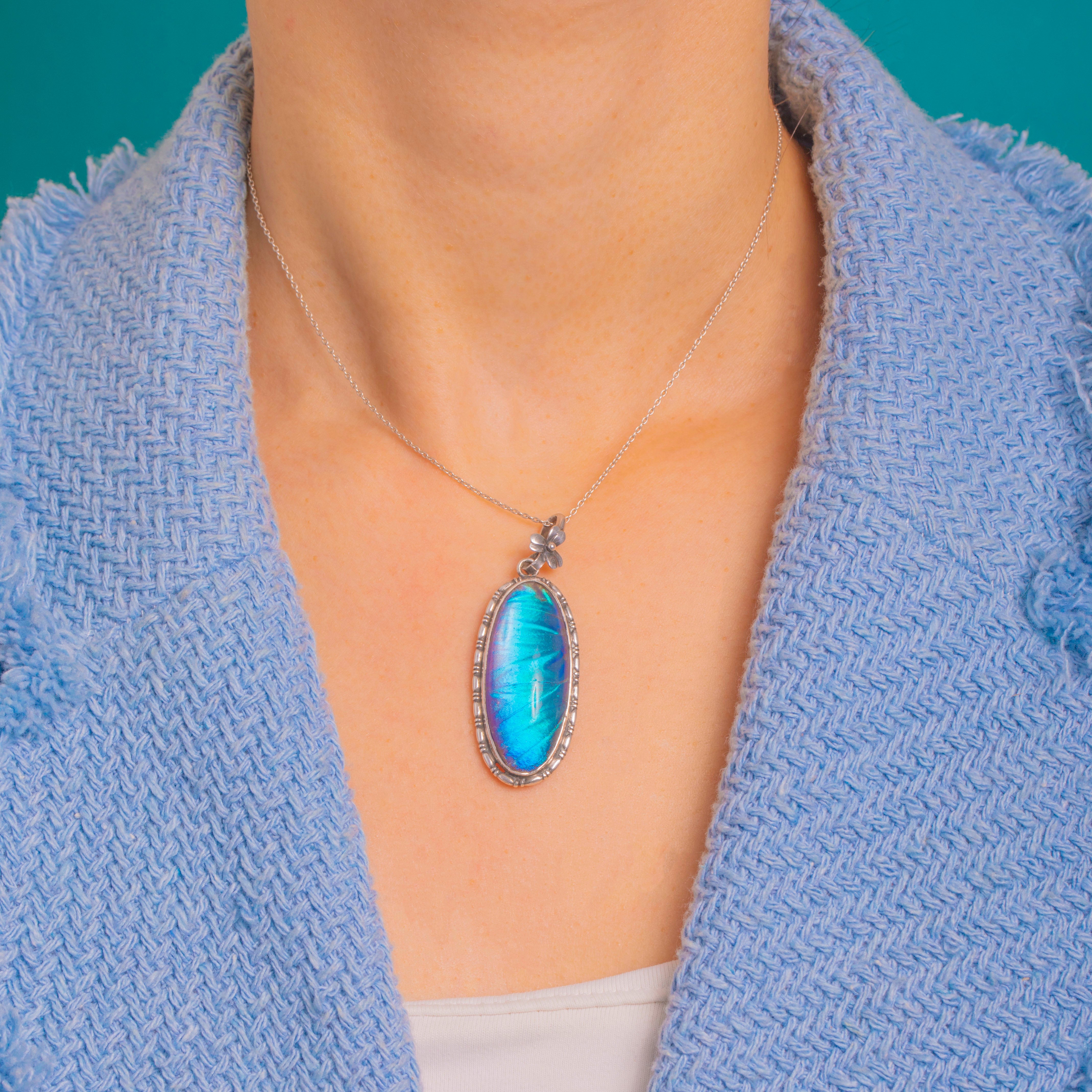 Shimmering with electric blue and teal iridescence, this Art Deco Silver pendant showcases a genuine Morpho butterfly wing beneath a domed resin cover. The elongated oval is framed by a knopped, beaded border that catches the light beautifully, while a sweet five‑petal flower crowns the fixed bail for a delicate botanical flourish.