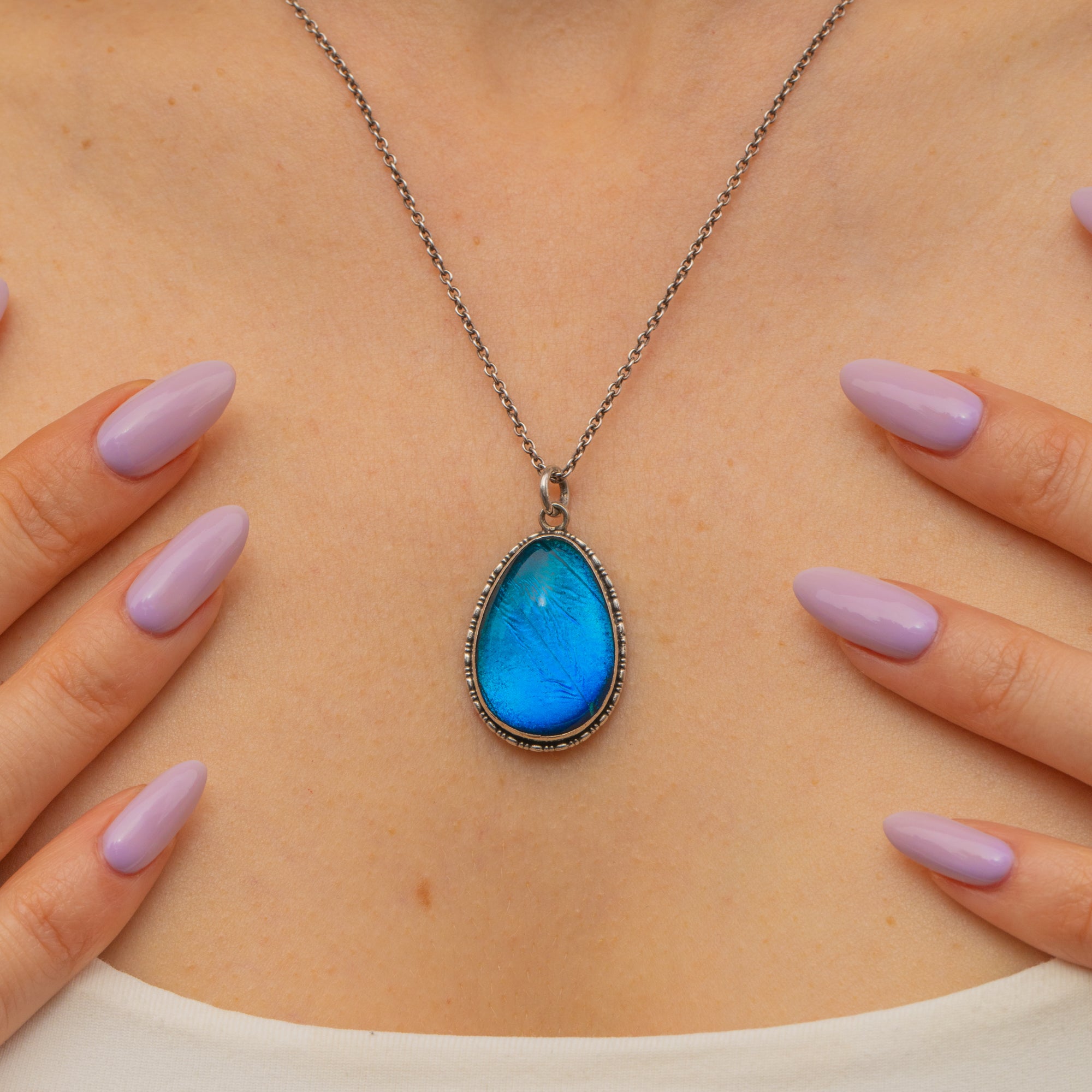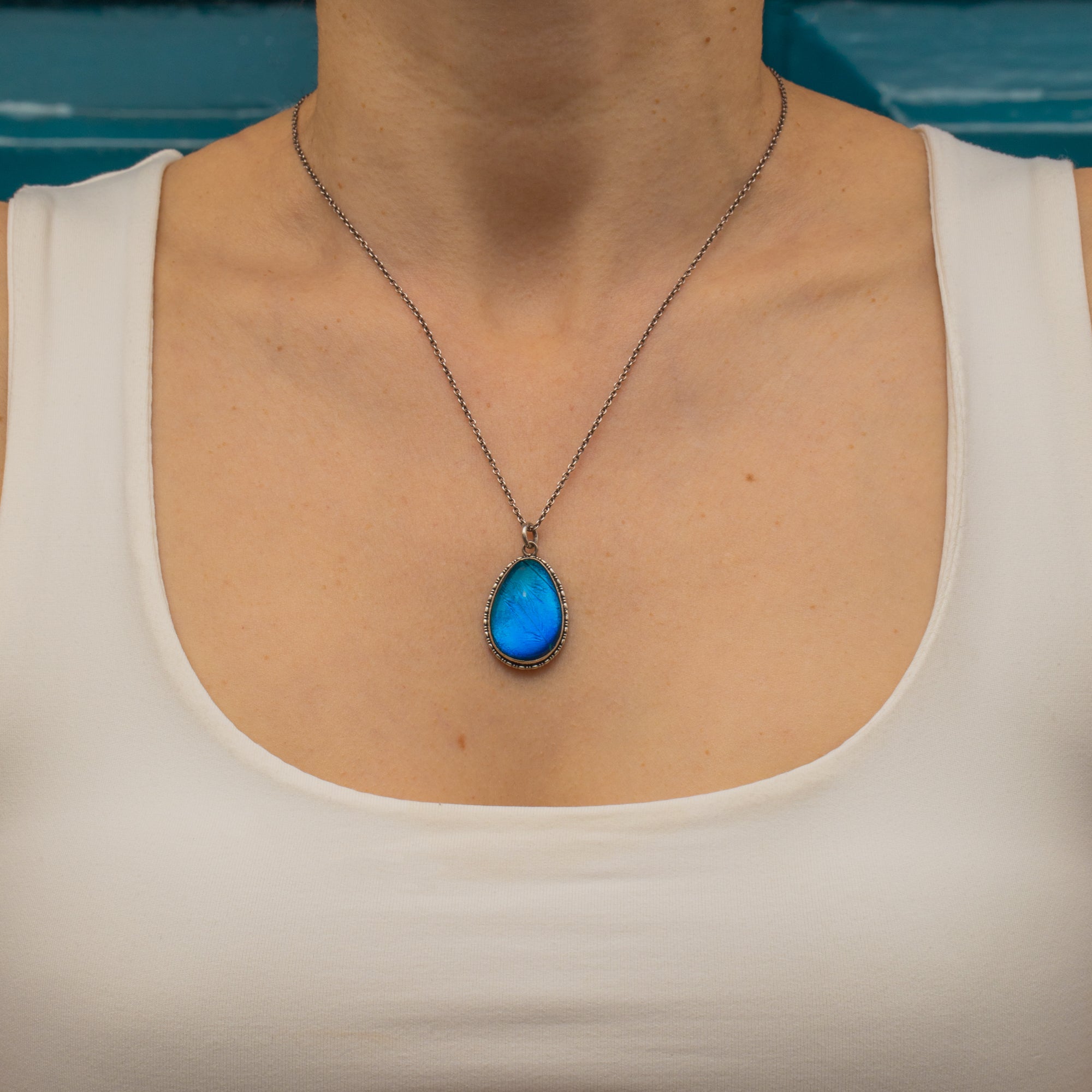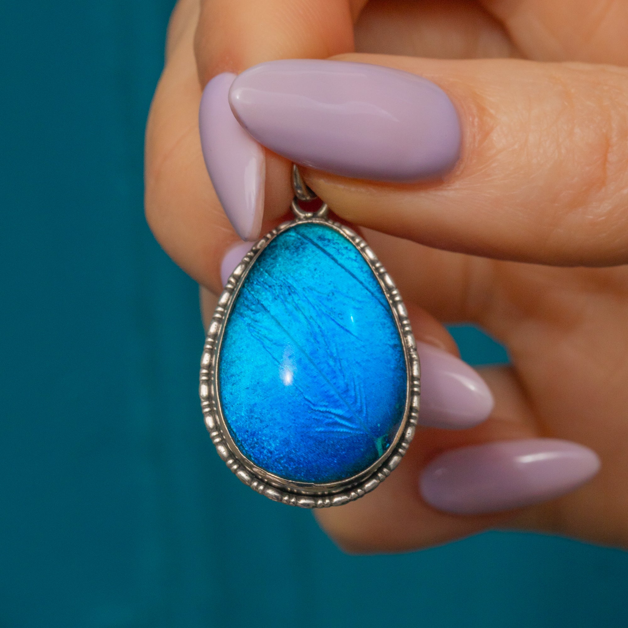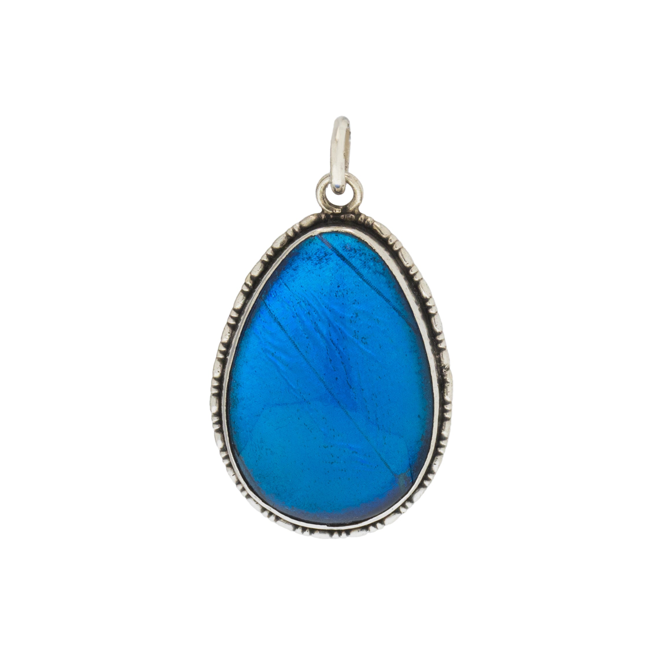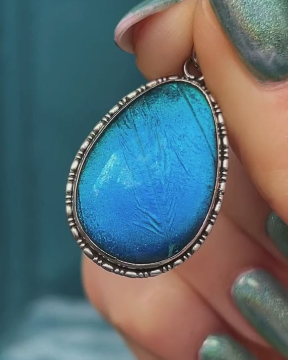 This is a stunning Art Deco Silver pear-drop butterfly wing pendant. Encasing a sliver of iridescent Morpho butterfly wing, this is the perfect pendant for adding a flash of electric blue to any outfit.