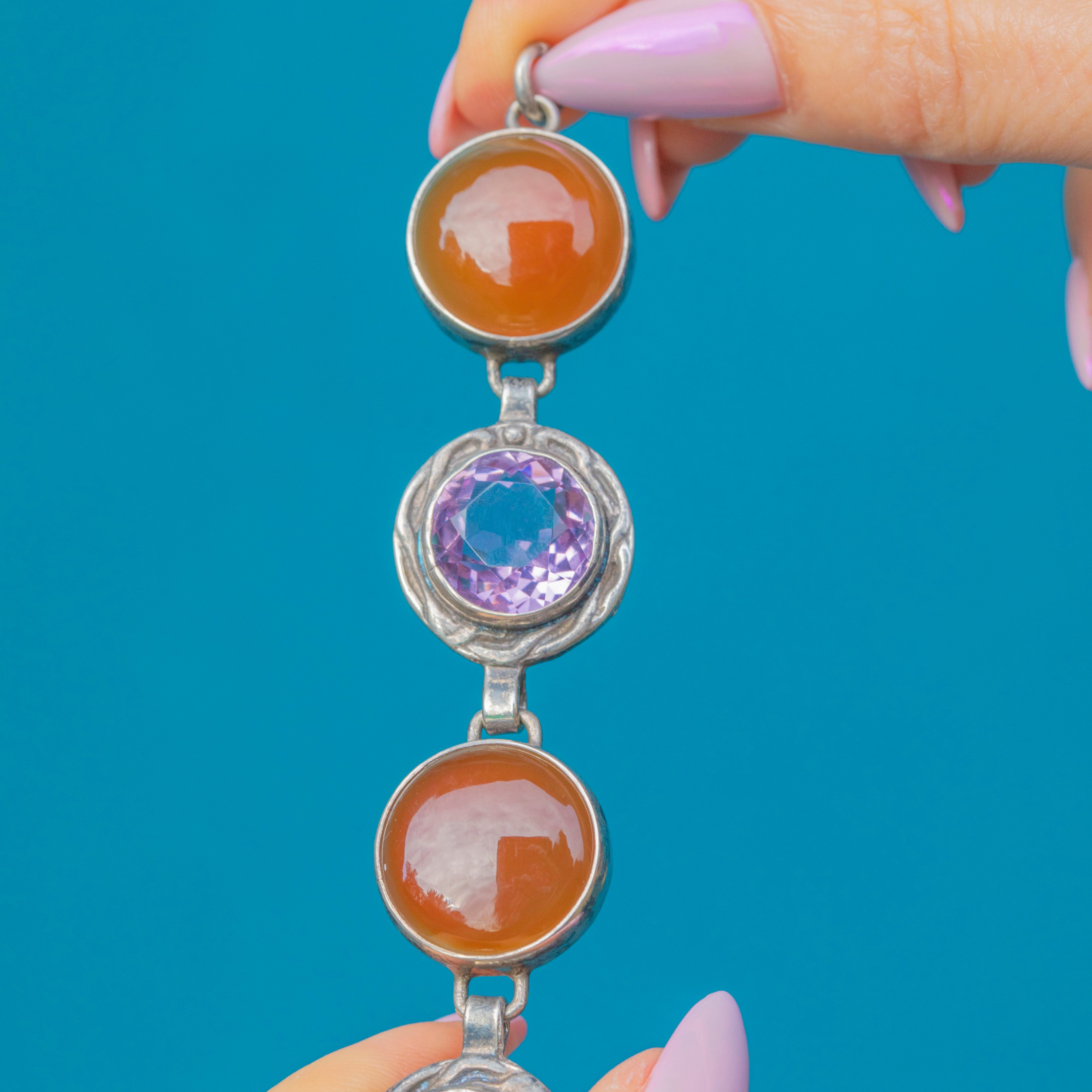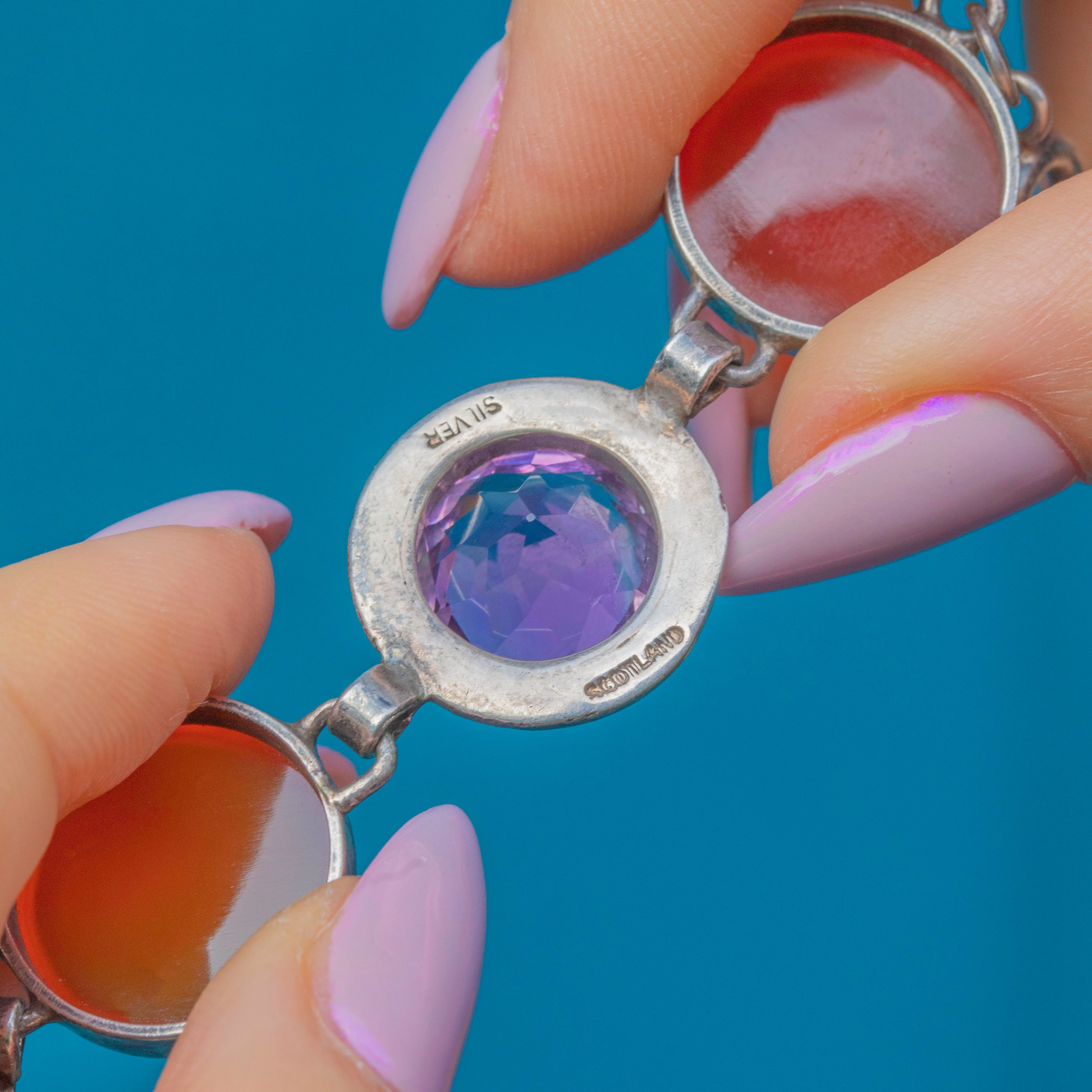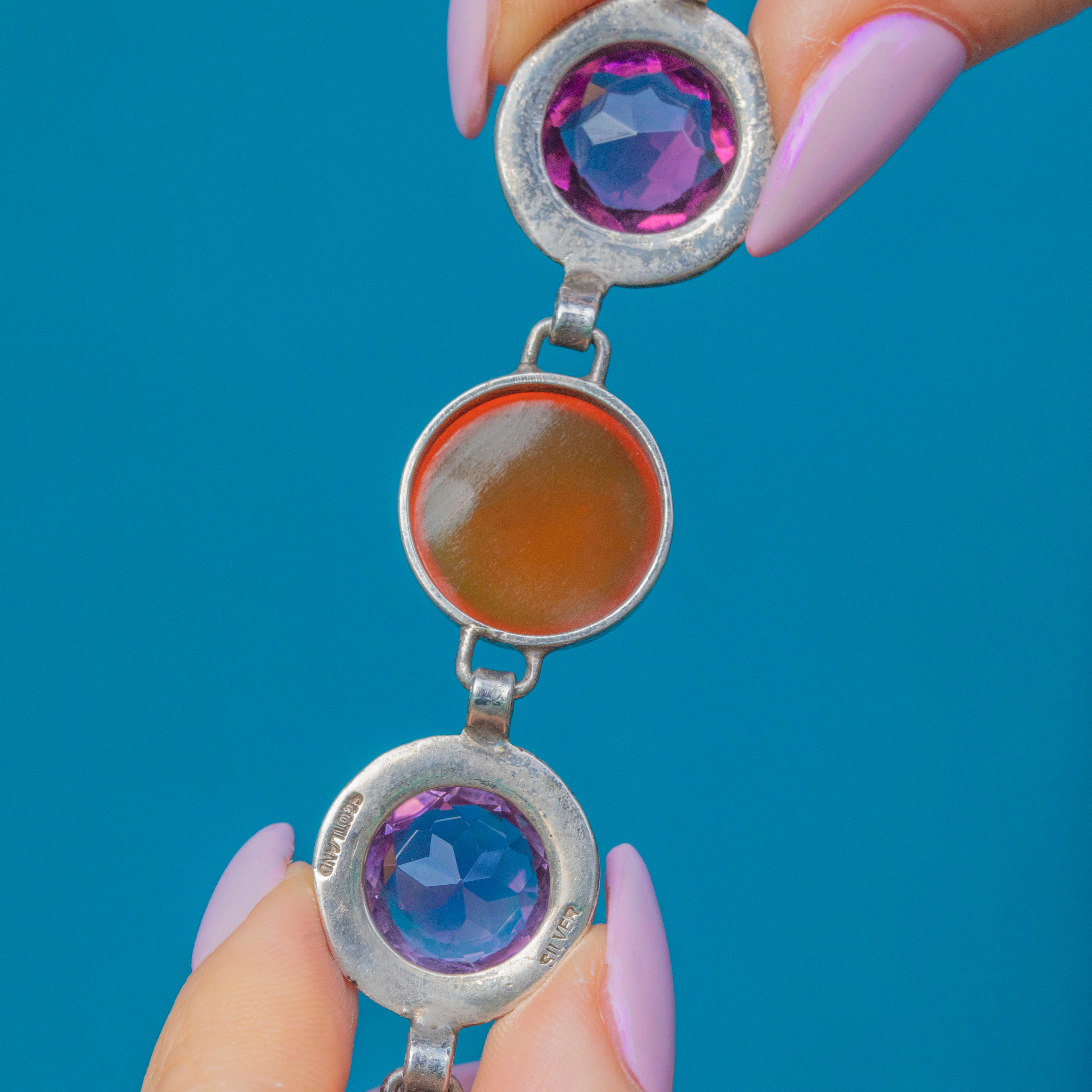 A striking 1920s Scottish bracelet crafted in Sterling Silver, alternating glowing Carnelian cabochons with rich purple Amethysts and a central Paste for a bold look.