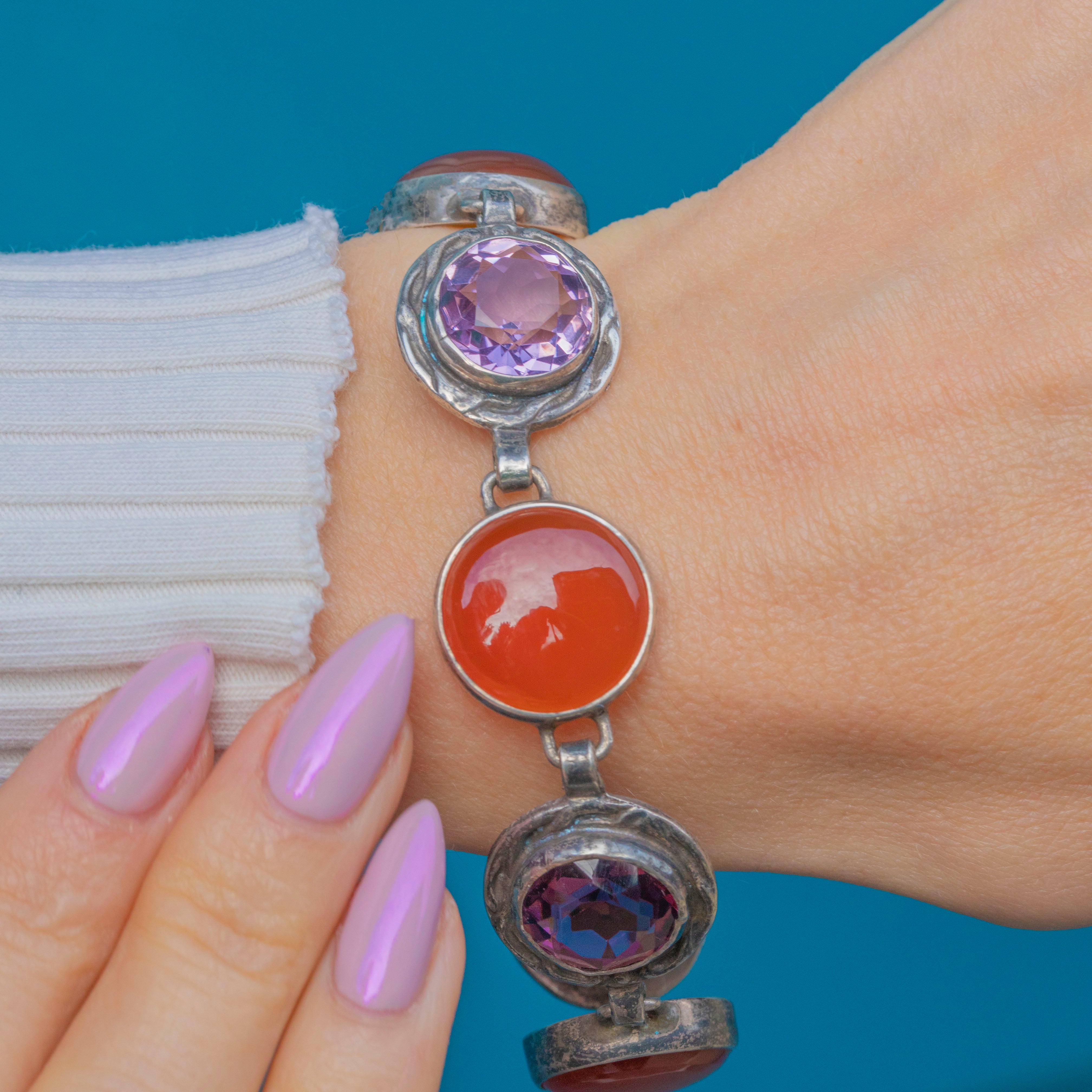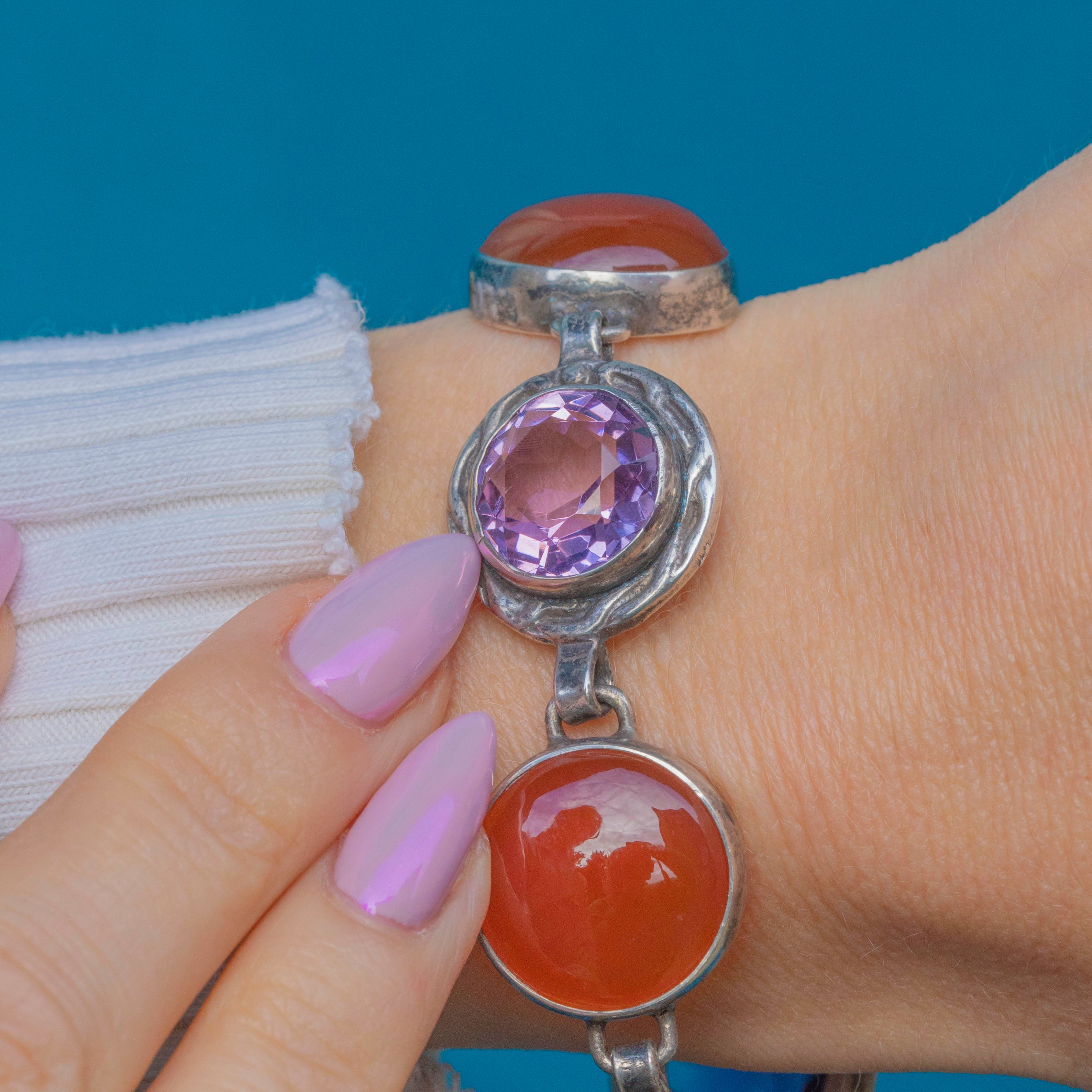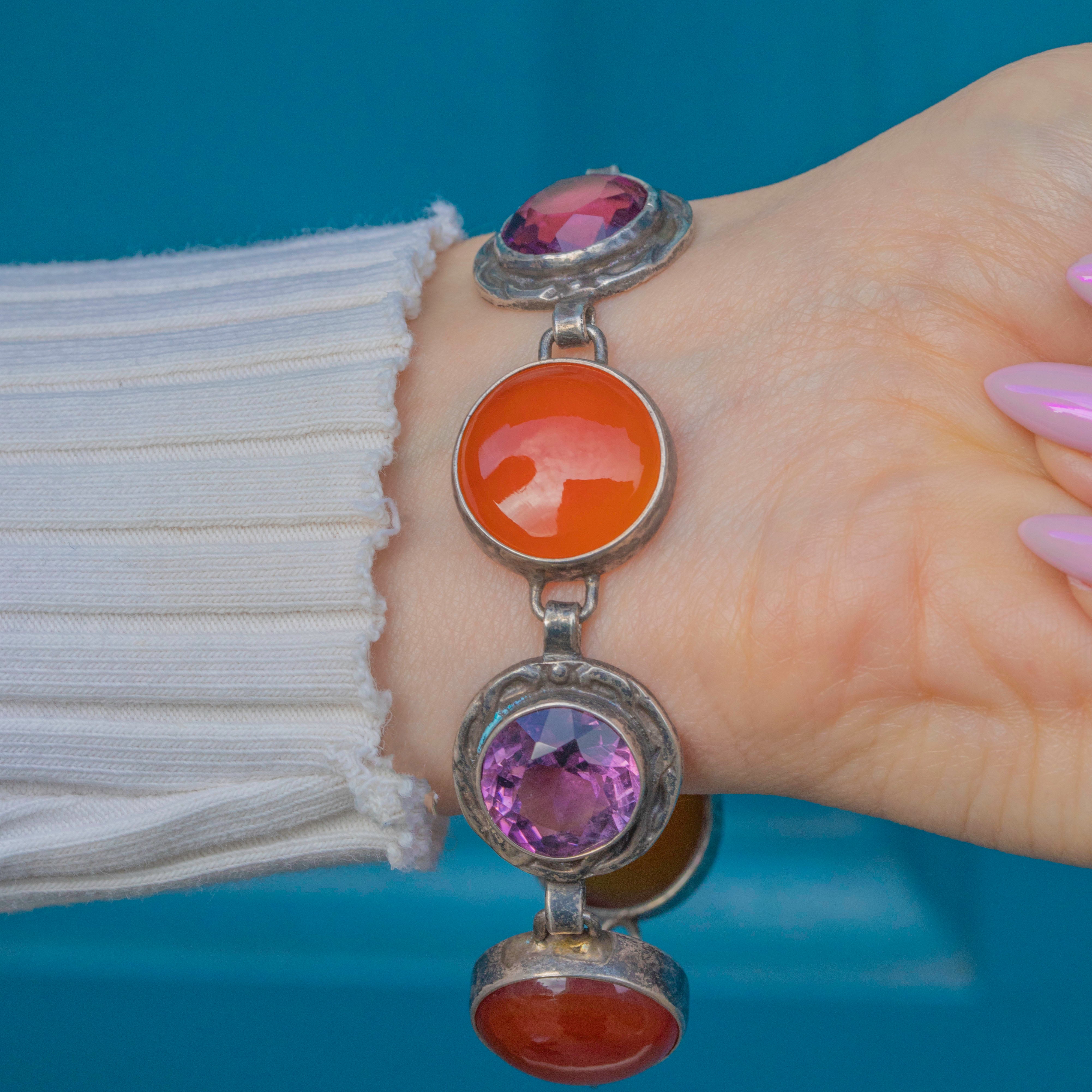 A striking 1920s Scottish bracelet crafted in Sterling Silver, alternating glowing Carnelian cabochons with rich purple Amethysts and a central Paste for a bold look.