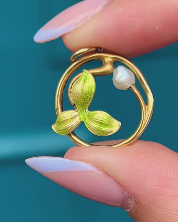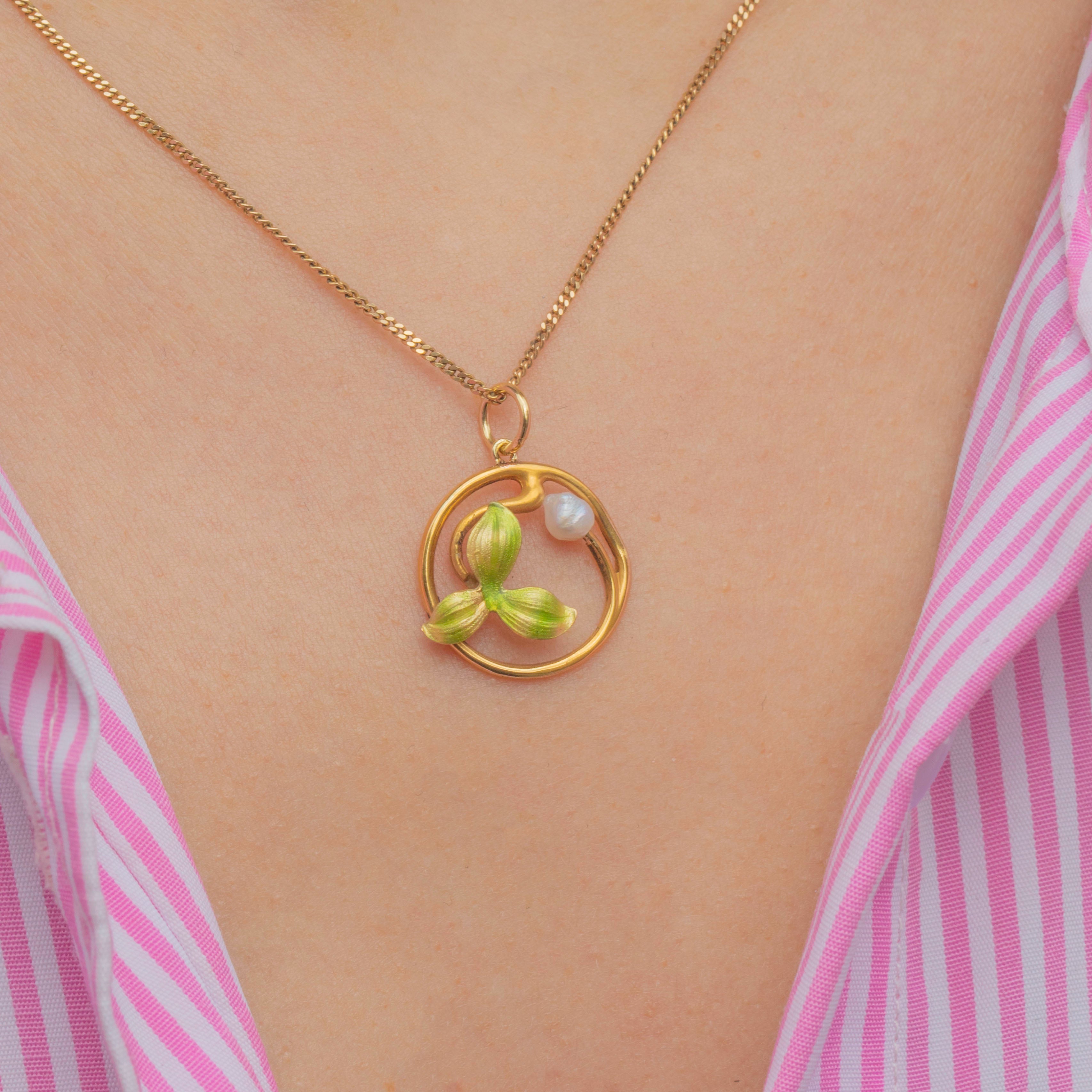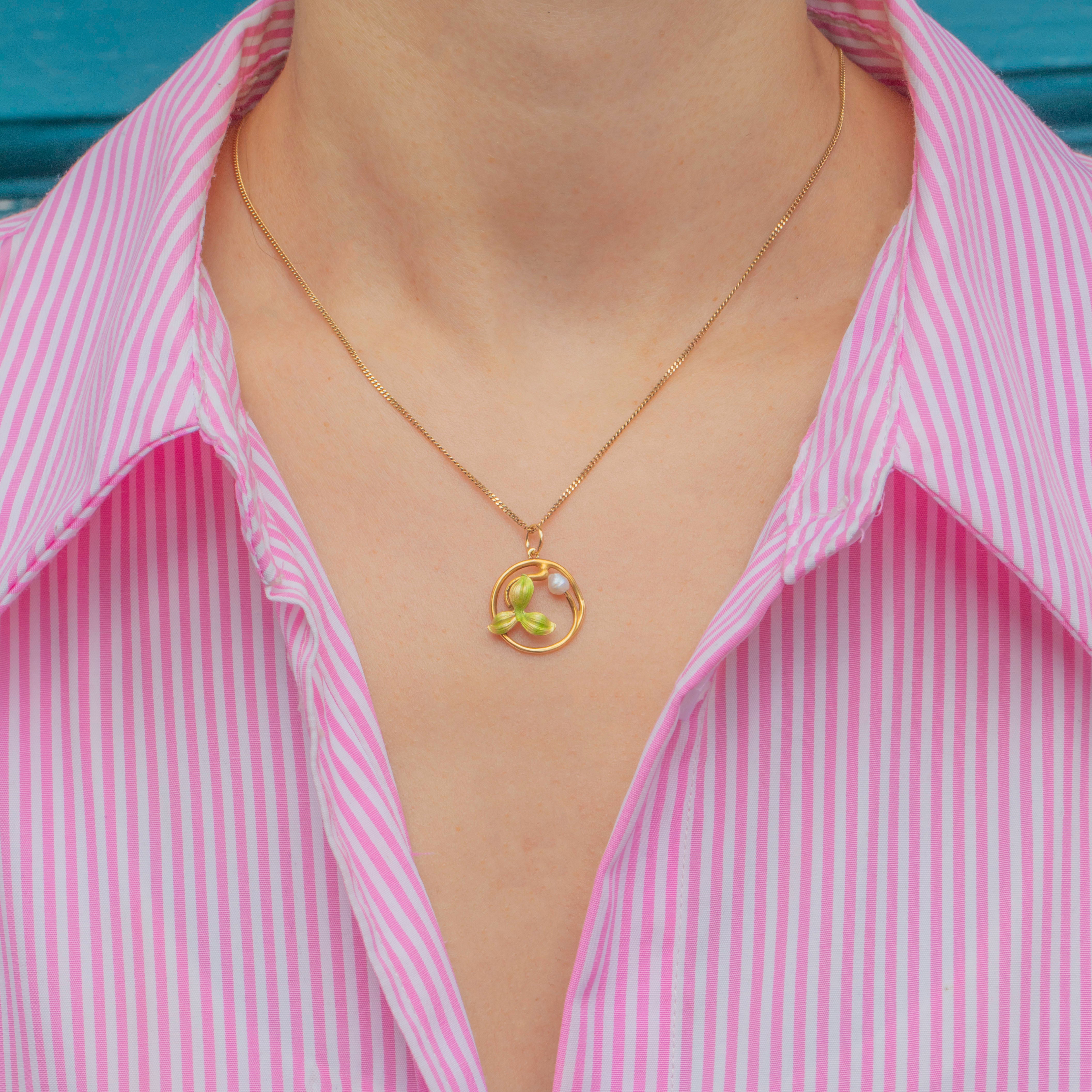 The pendant features an elegant sage green Enamel leaf motif, beautifully enhanced by the iridescent Pearl. They are displayed within curvaceous lines of saturated 14ct Gold, in quintessential Art Nouveau style, giving this lightweight pendant a resplendent sophistication.