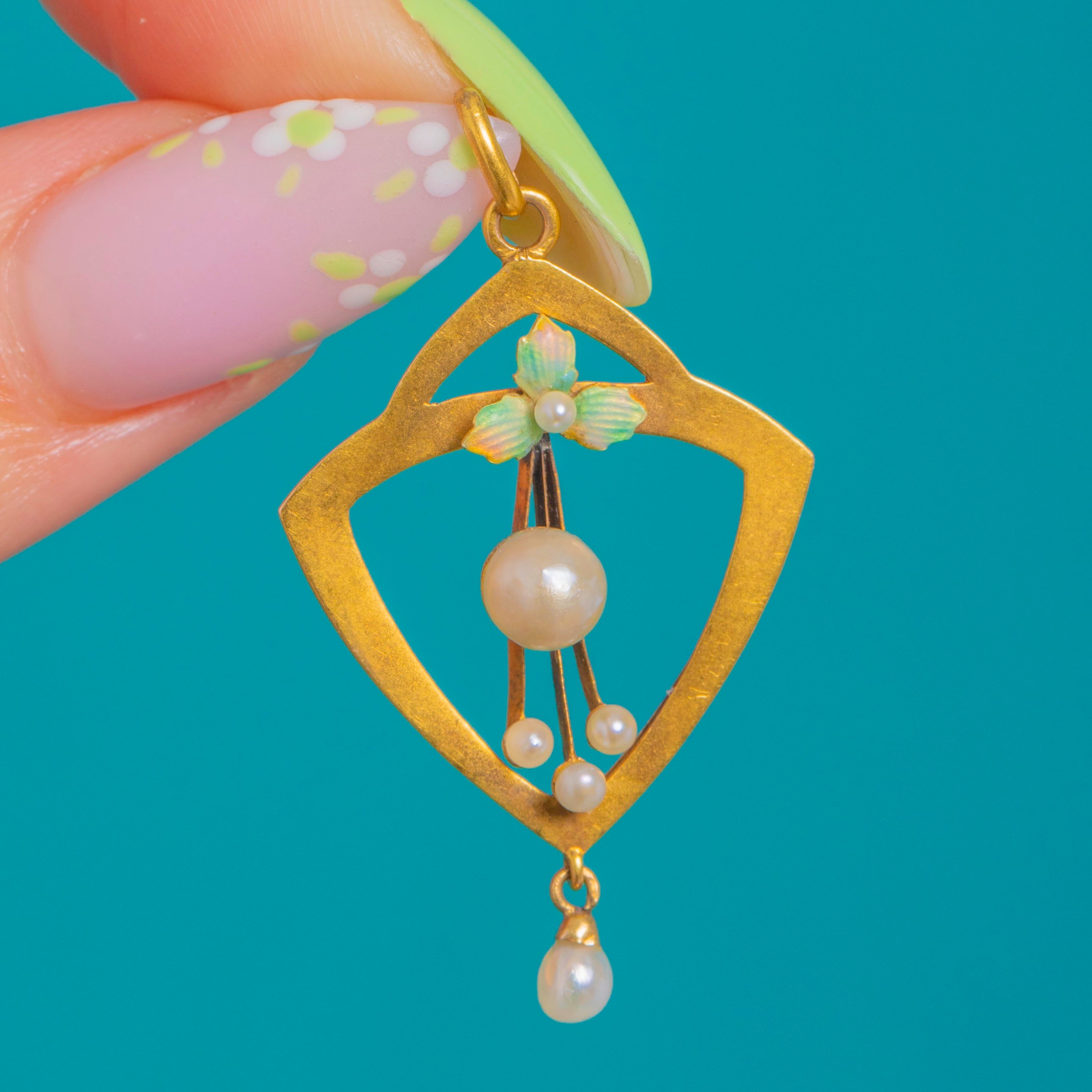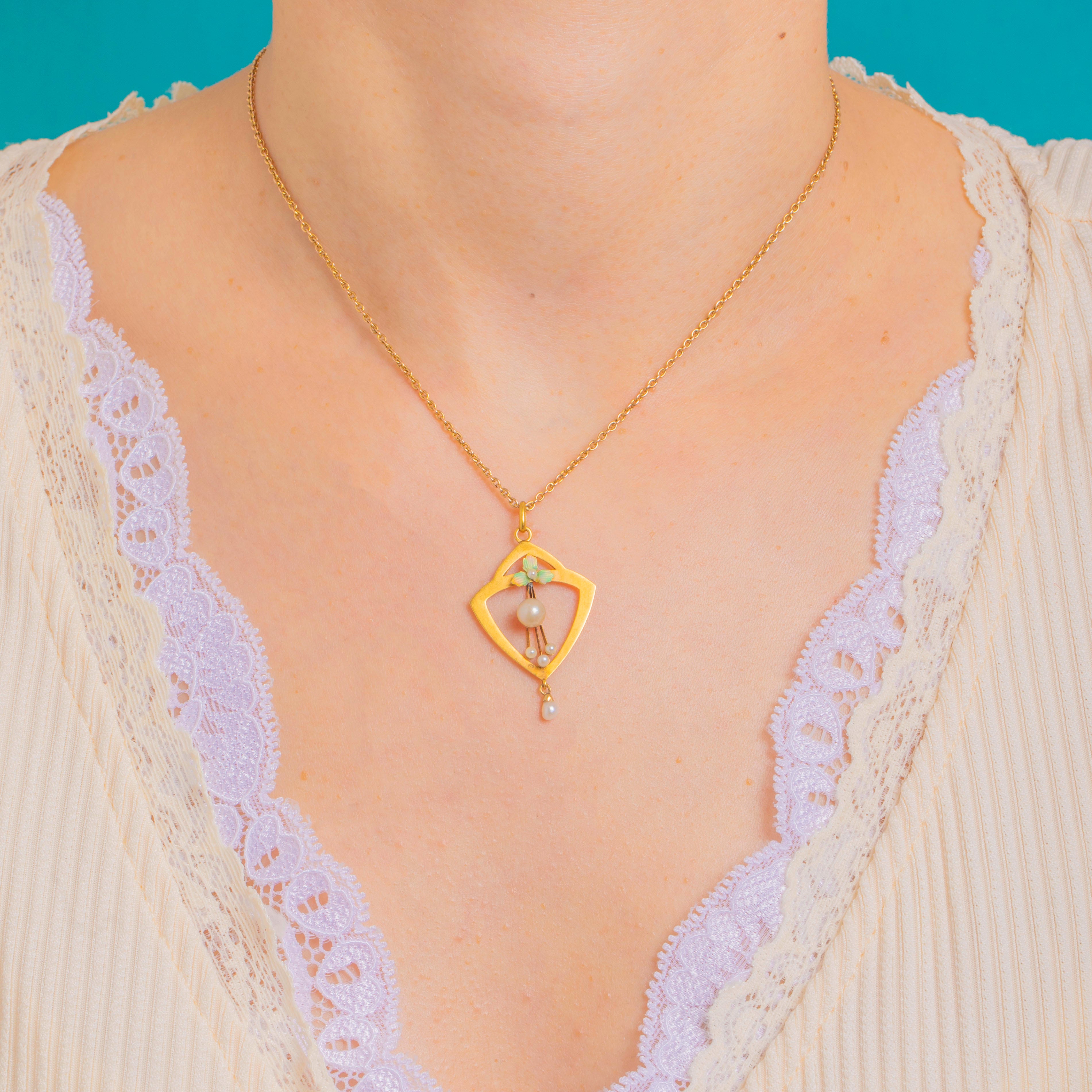 A delicate Art Nouveau 15ct Gold pendant with an elegant openwork lozenge silhouette, kissed with a tiny foliate Enamel accent and dotted with lustrous Pearls. A central round Pearl sits on a vertical stem framed by dainty seed Pearls, while a petite baroque teardrop Pearl dances below for graceful movement and light.