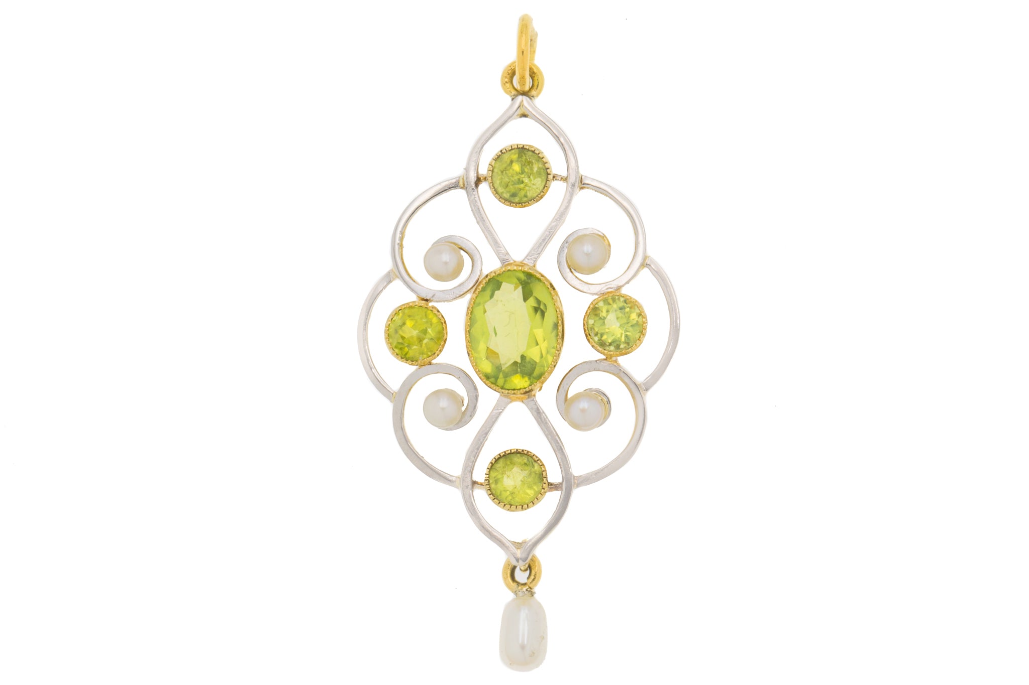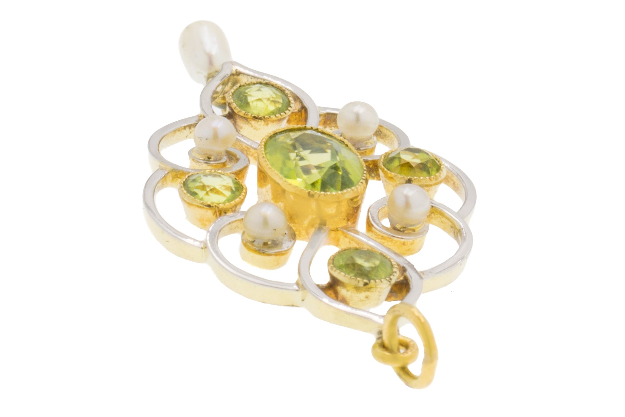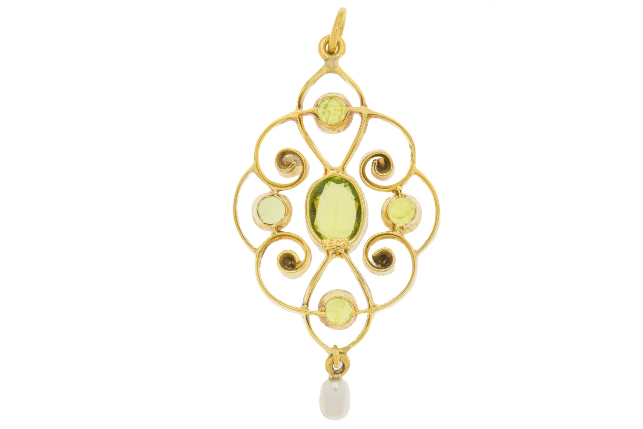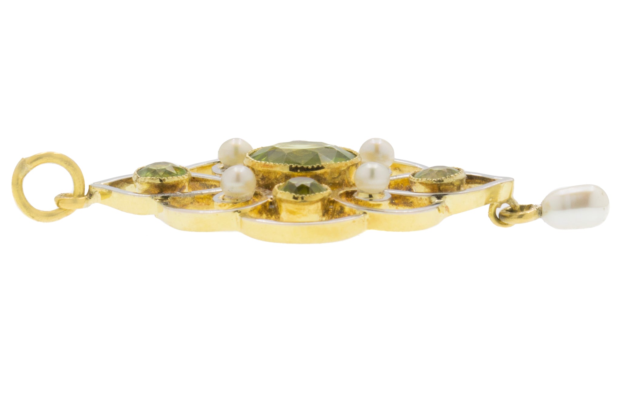 Pendentif goutte Art Nouveau en or 15 carats, perle et péridot, 1,00 ct
