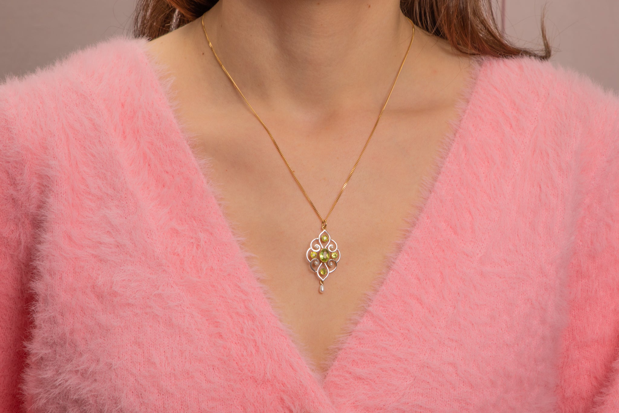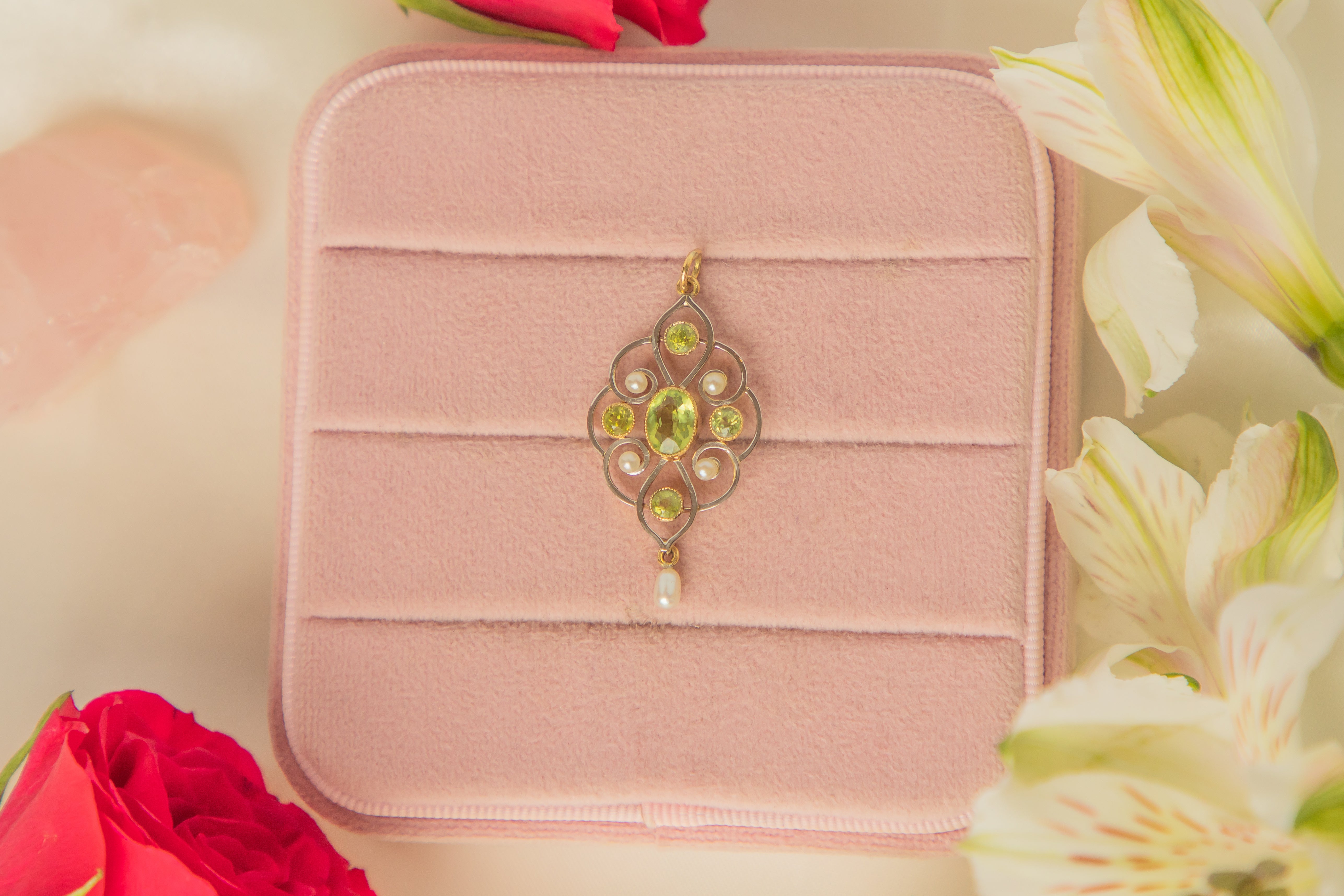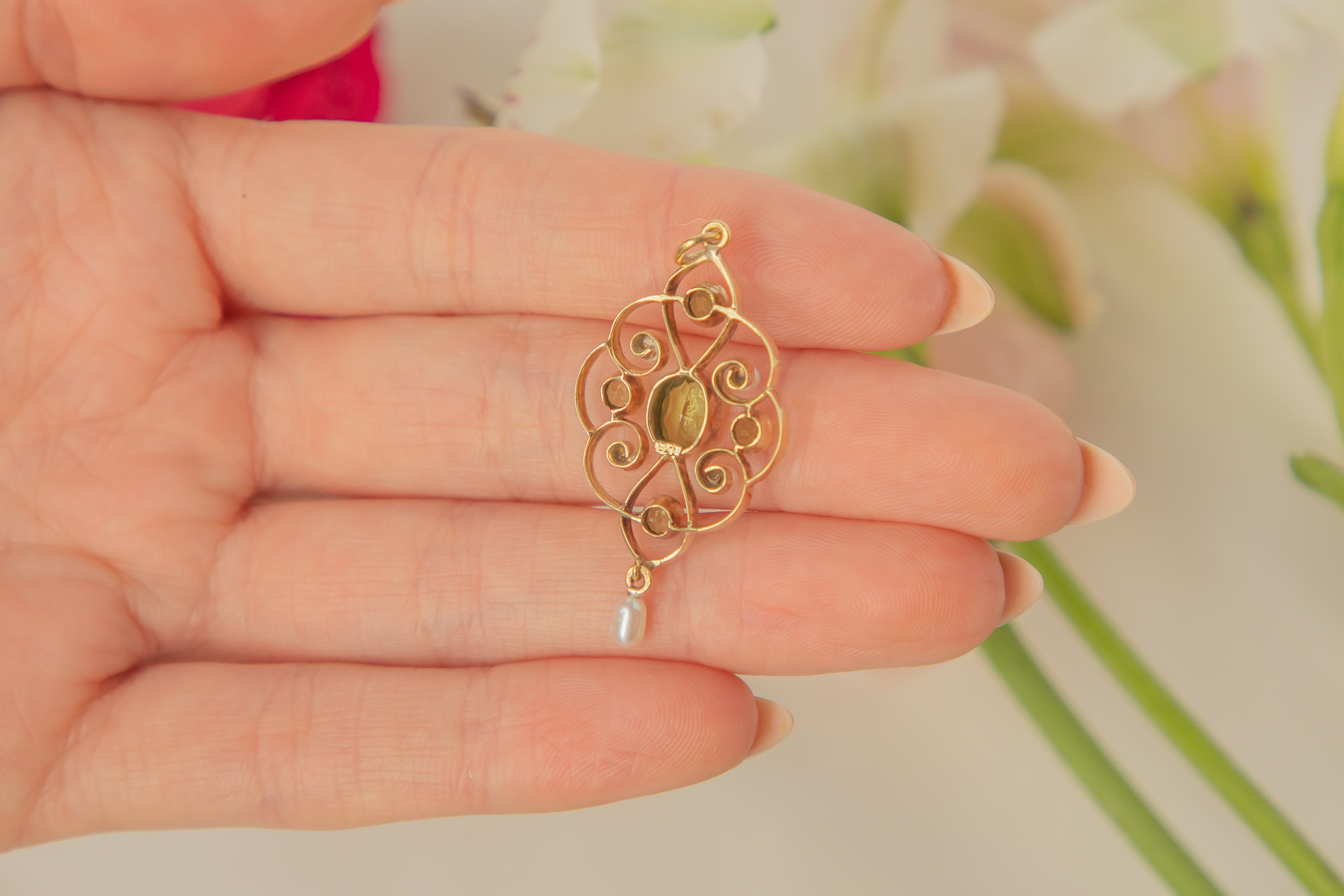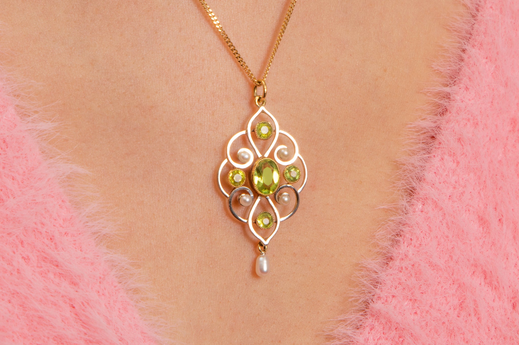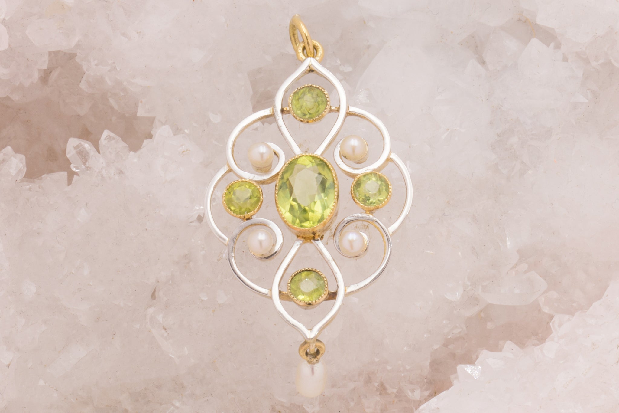 Pendentif goutte Art Nouveau en or 15 carats, perle et péridot, 1,00 ct