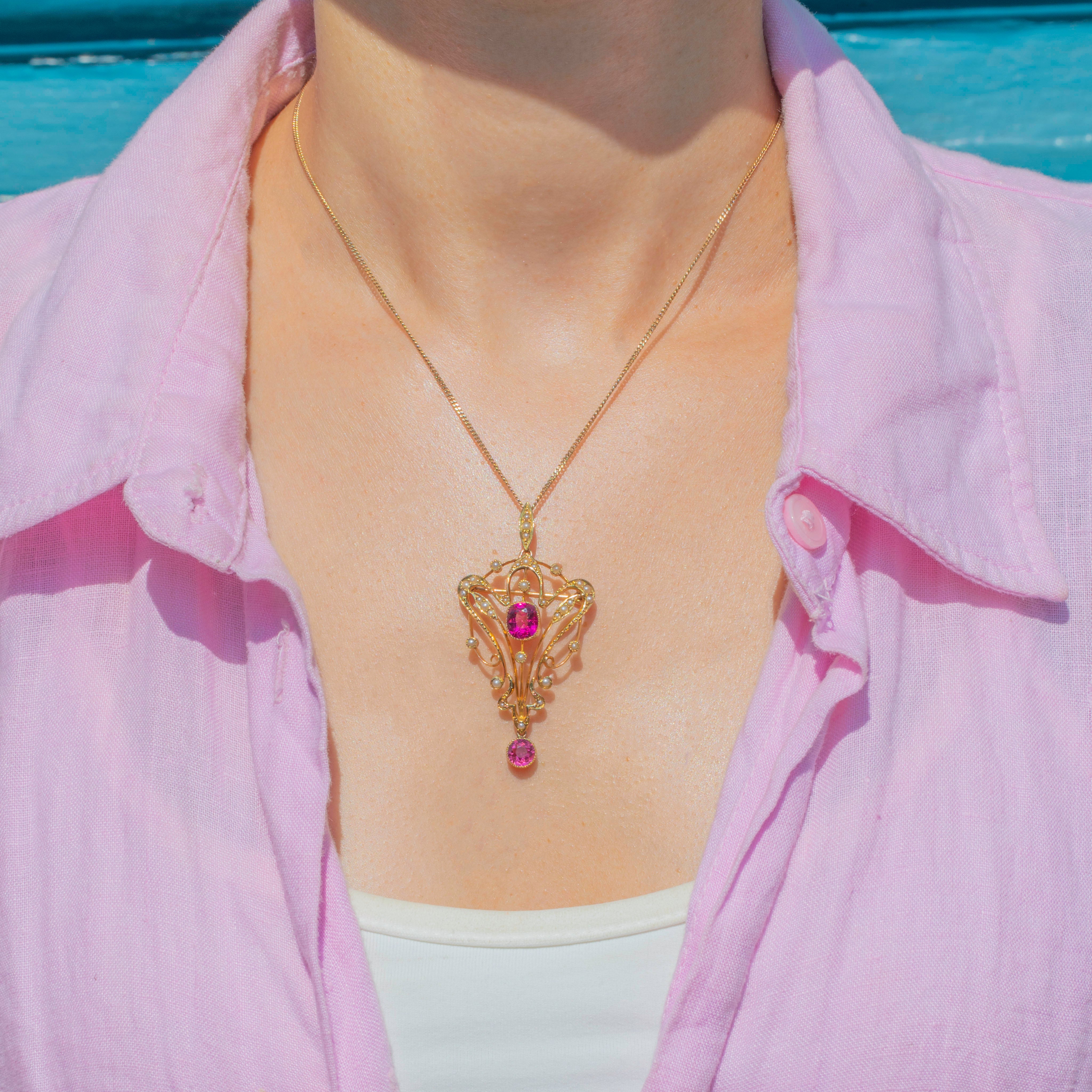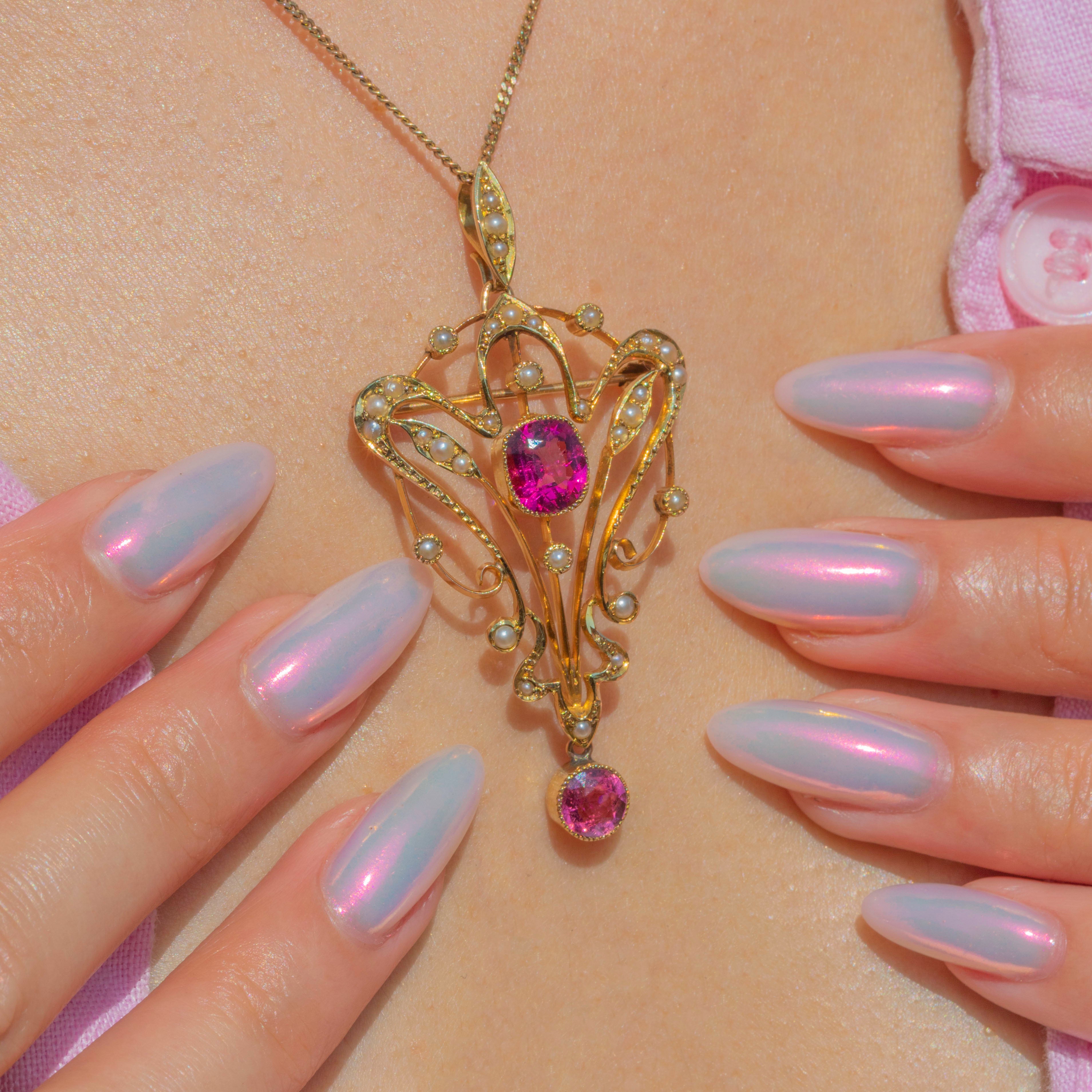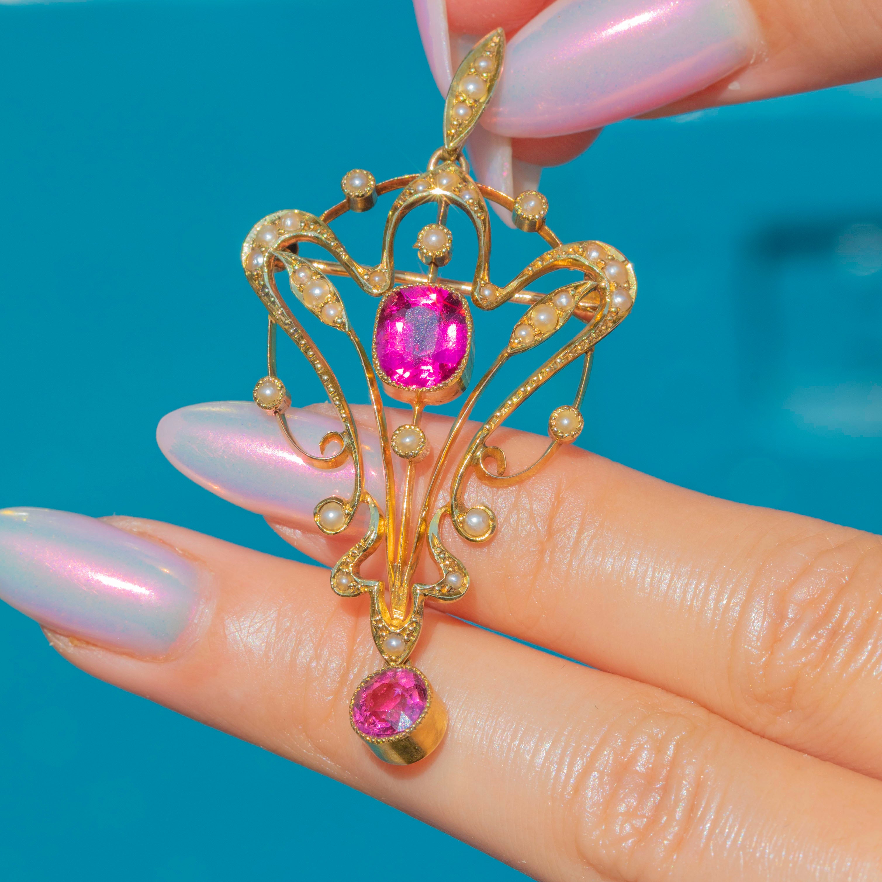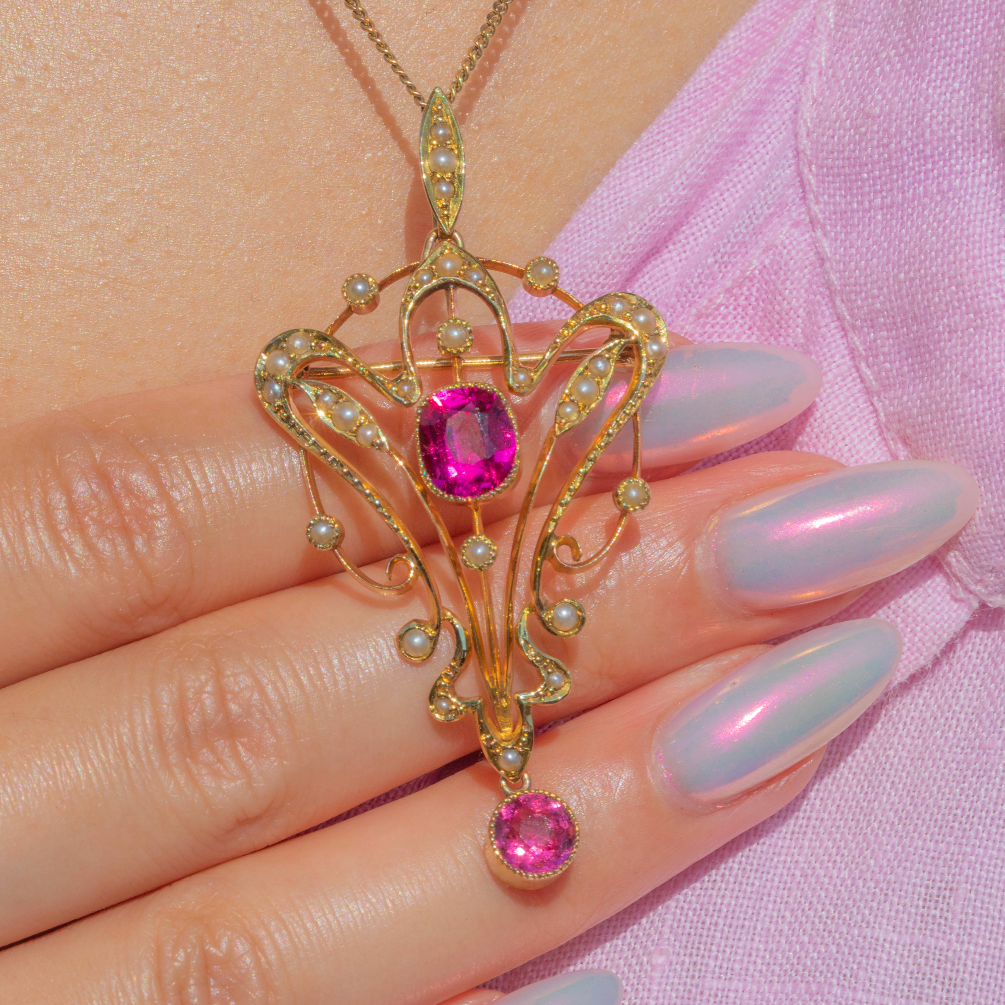 Art Nouveau 15ct Gold Pink Tourmaline Pearl Lavalier Pendant, 1.25ct