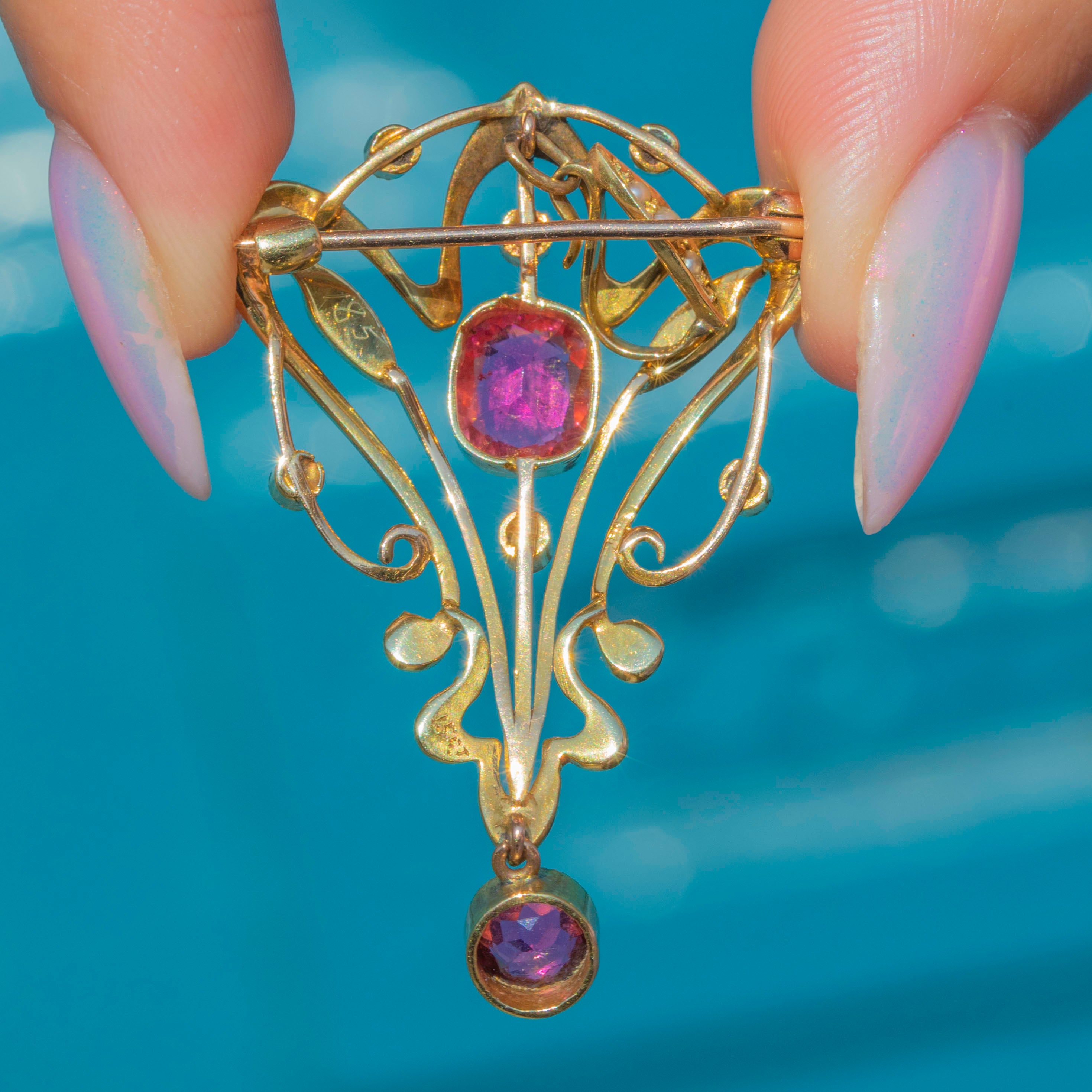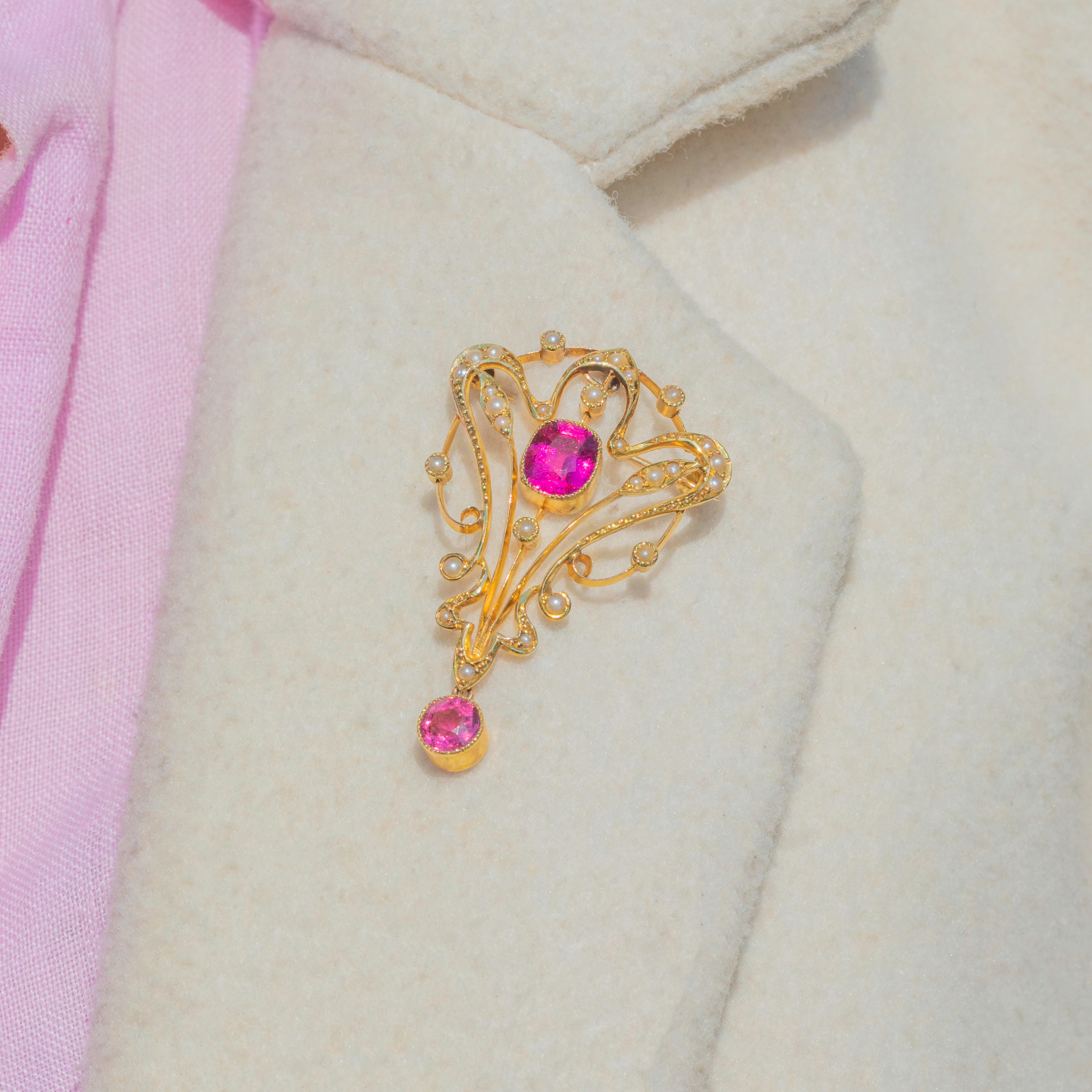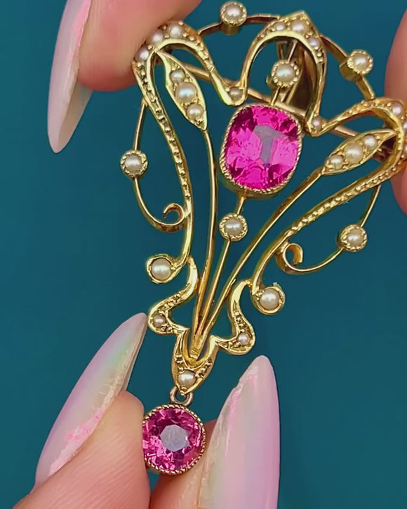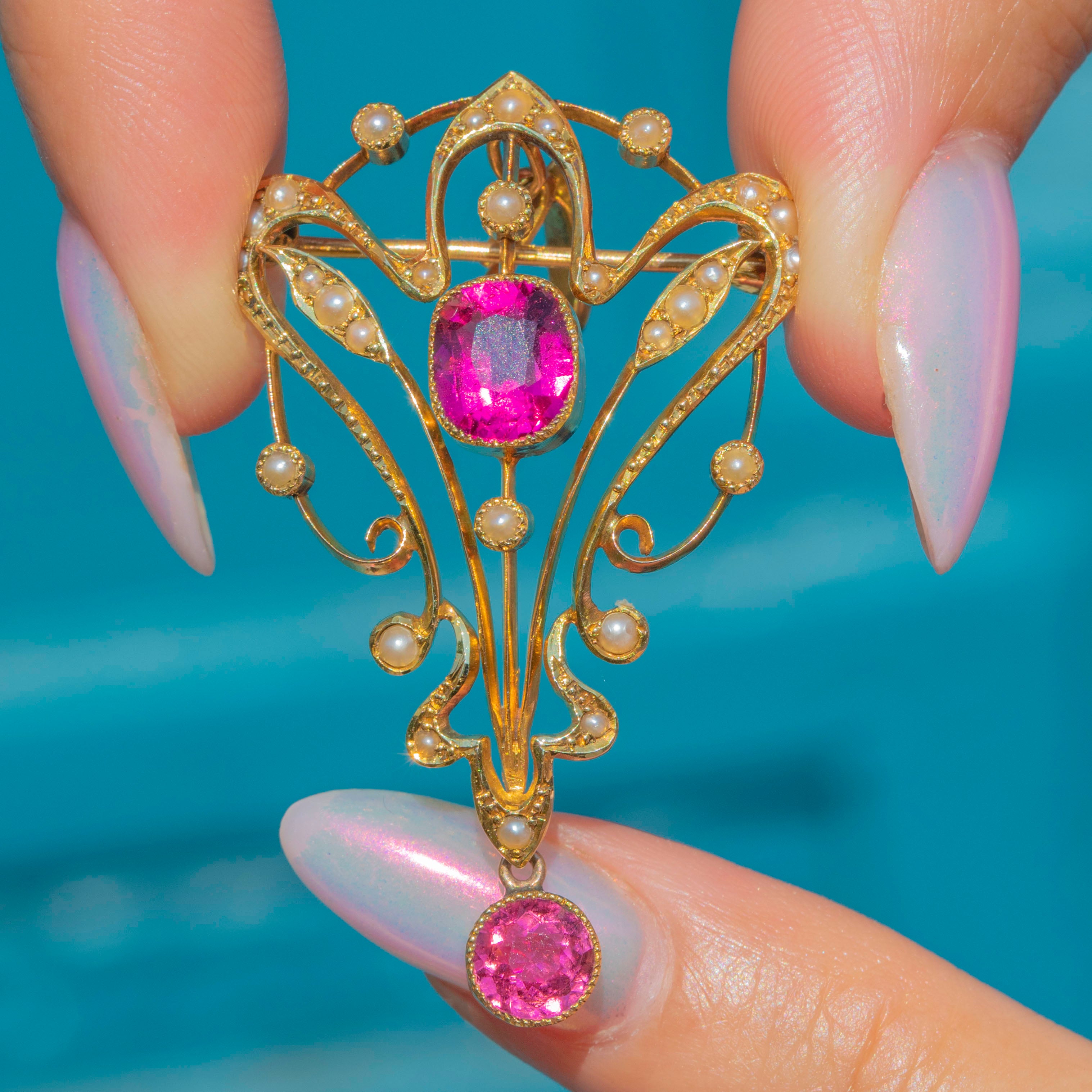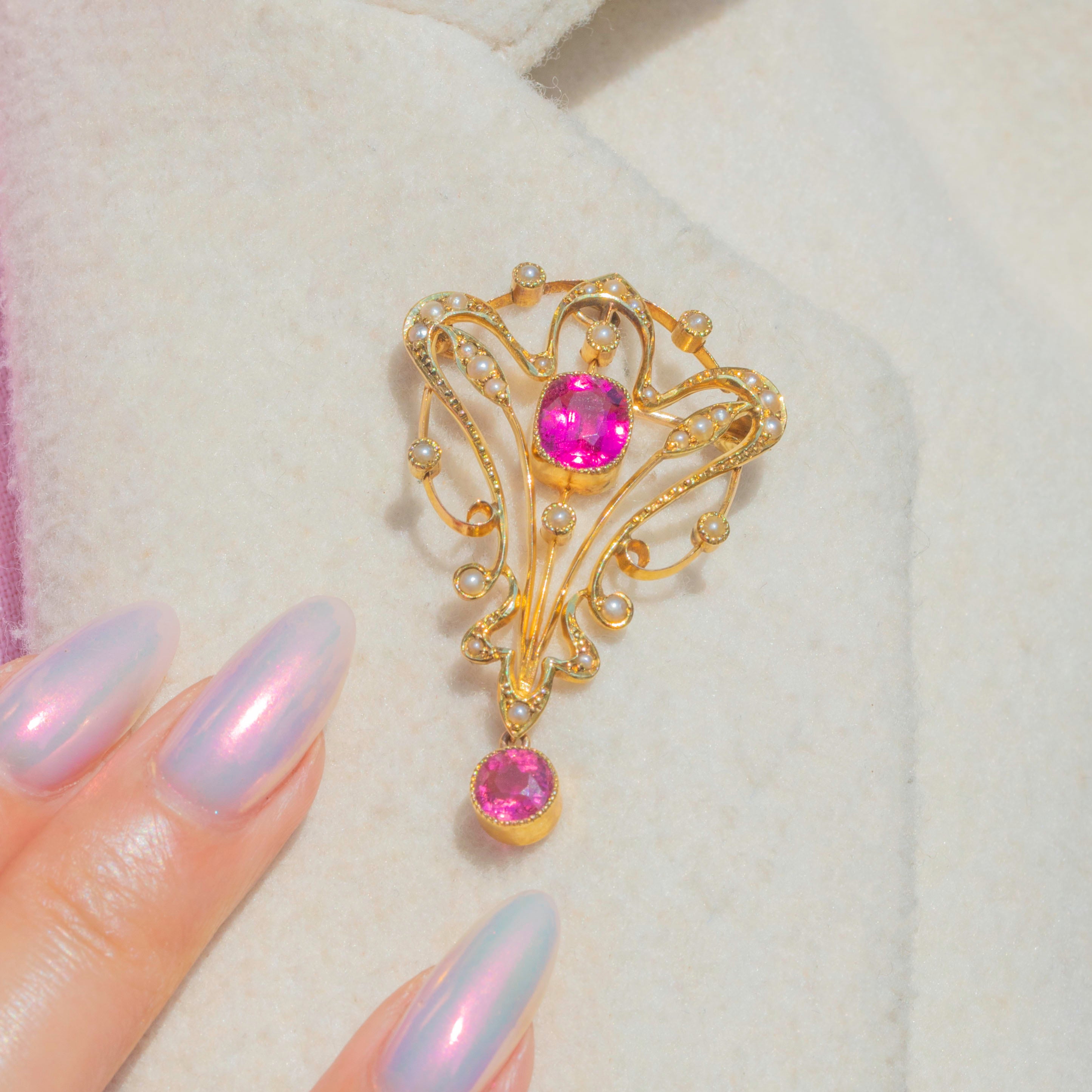 Art Nouveau 15ct Gold Pink Tourmaline Pearl Lavalier Pendant, 1.25ct