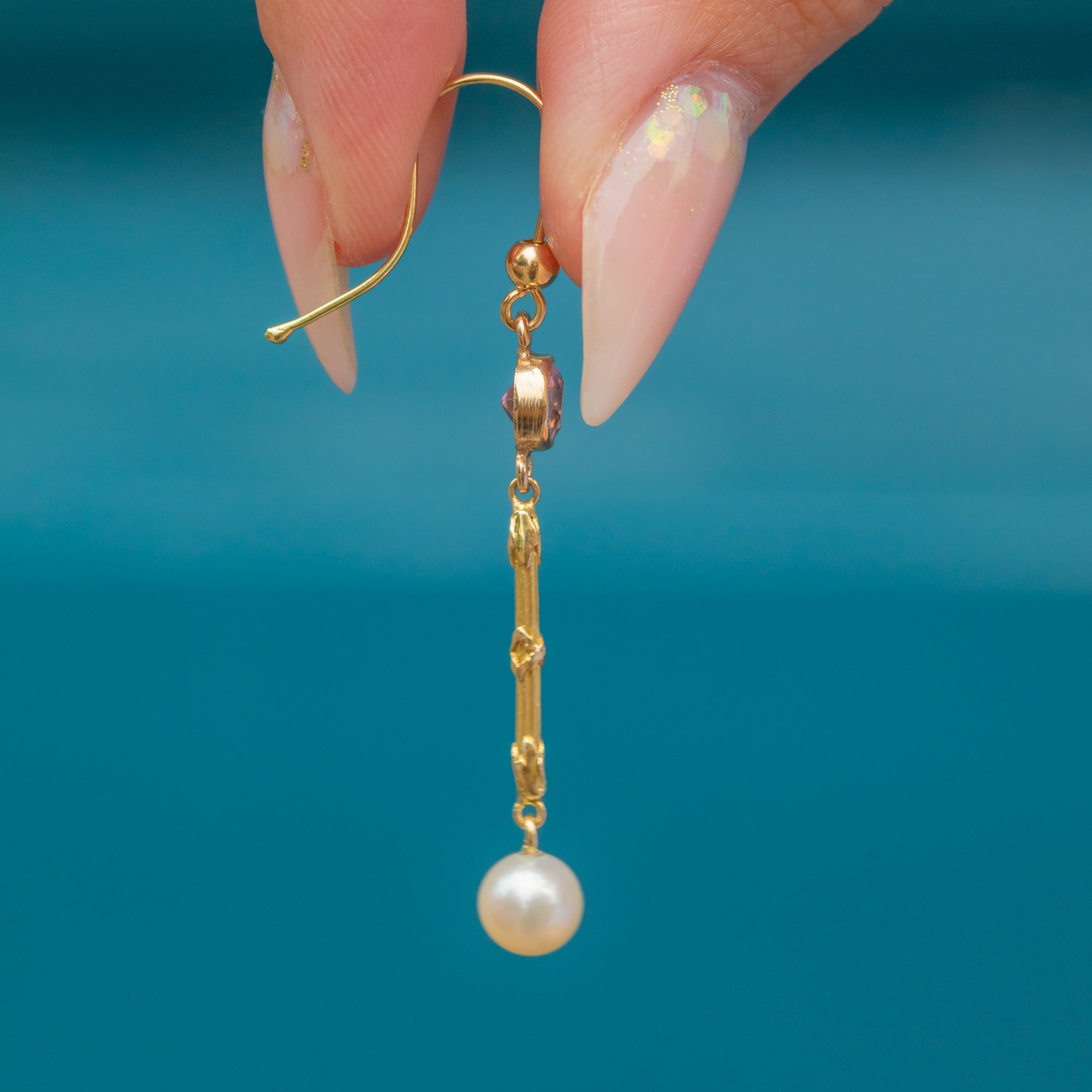 These graceful Art Nouveau earrings are crafted in rich 18ct Gold and set with two vivid pink Tourmalines and luminous Pearls. The long, flowing design captures the elegance and femininity of the early 20th century, with soft curves and naturalistic inspiration typical of the Art Nouveau movement.