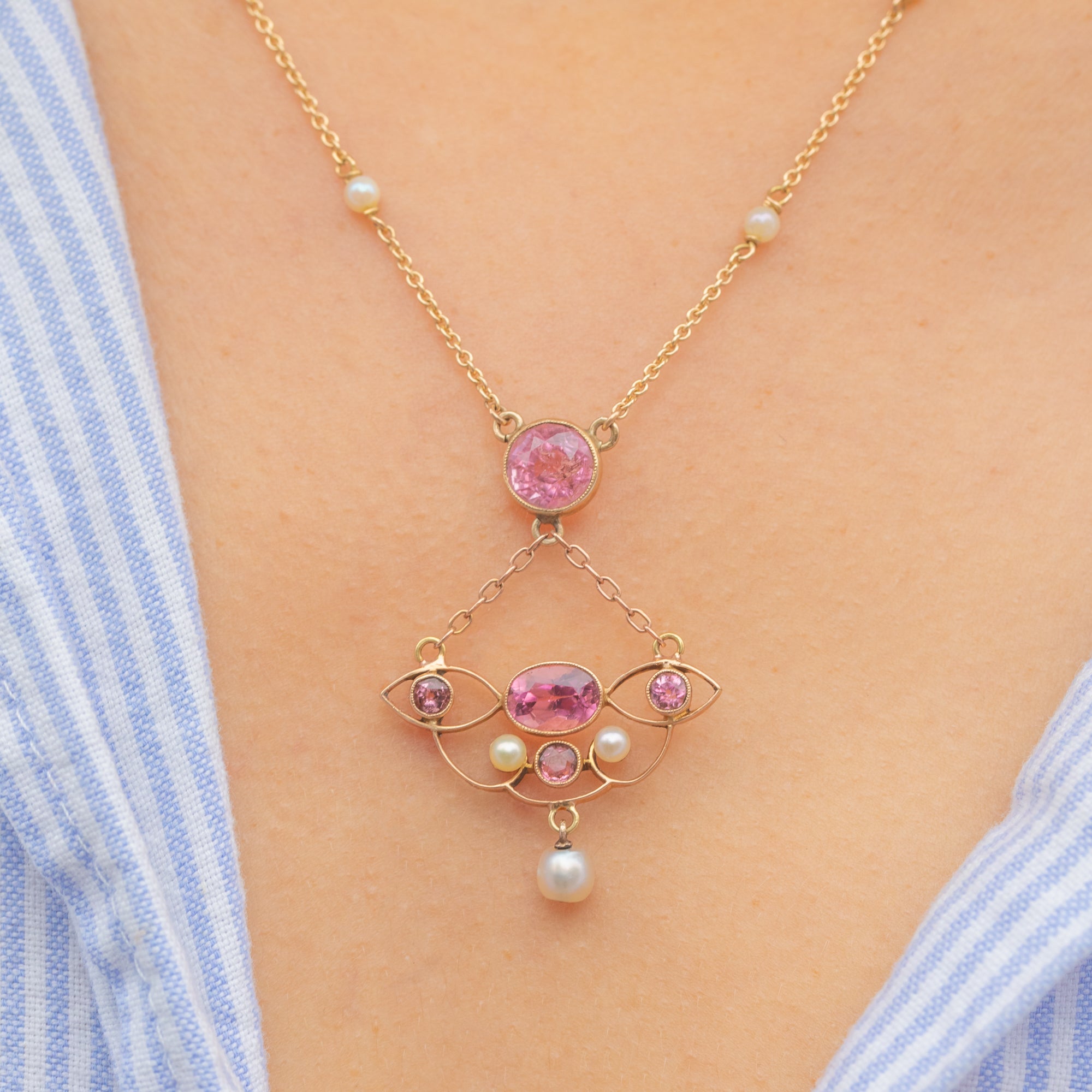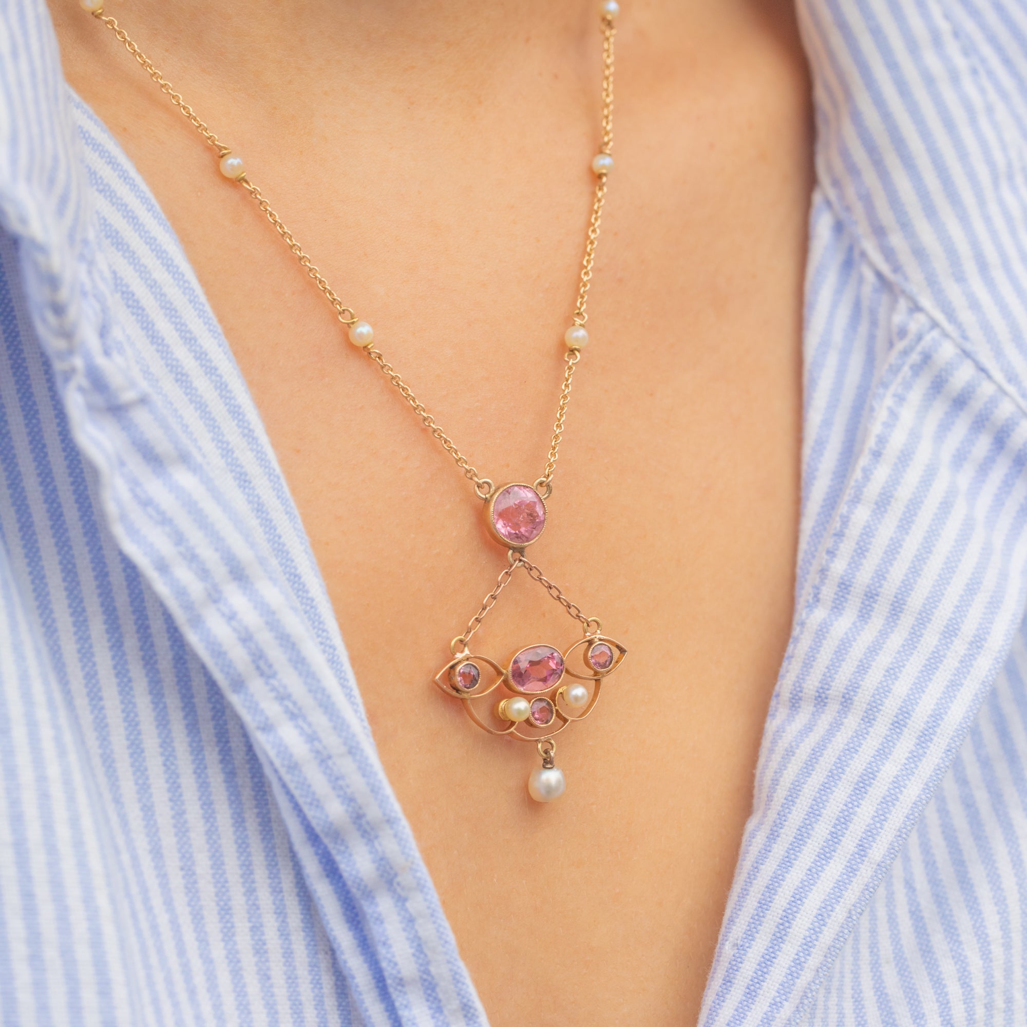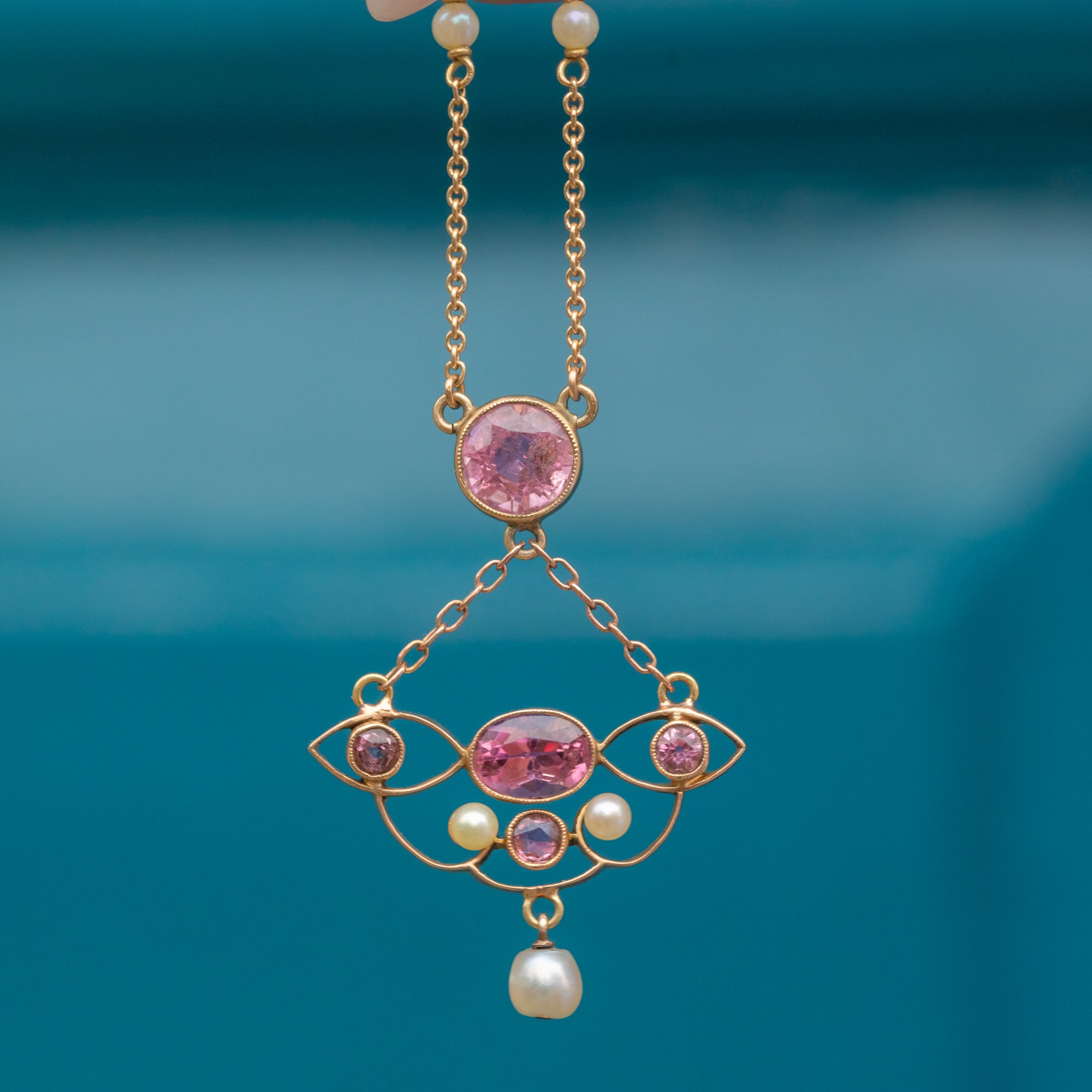 Art Nouveau 18ct Gold Pink Tourmaline Pearl Necklace