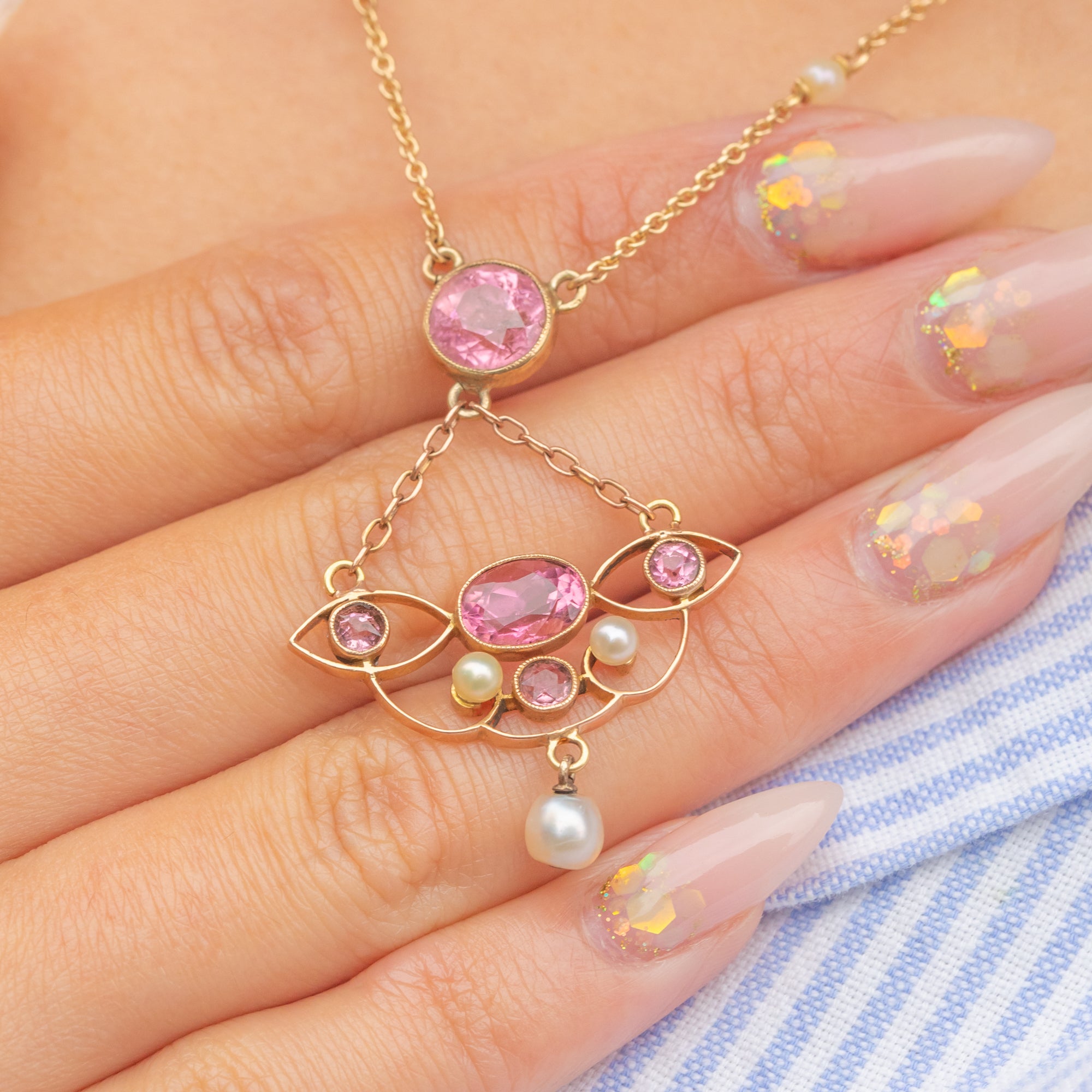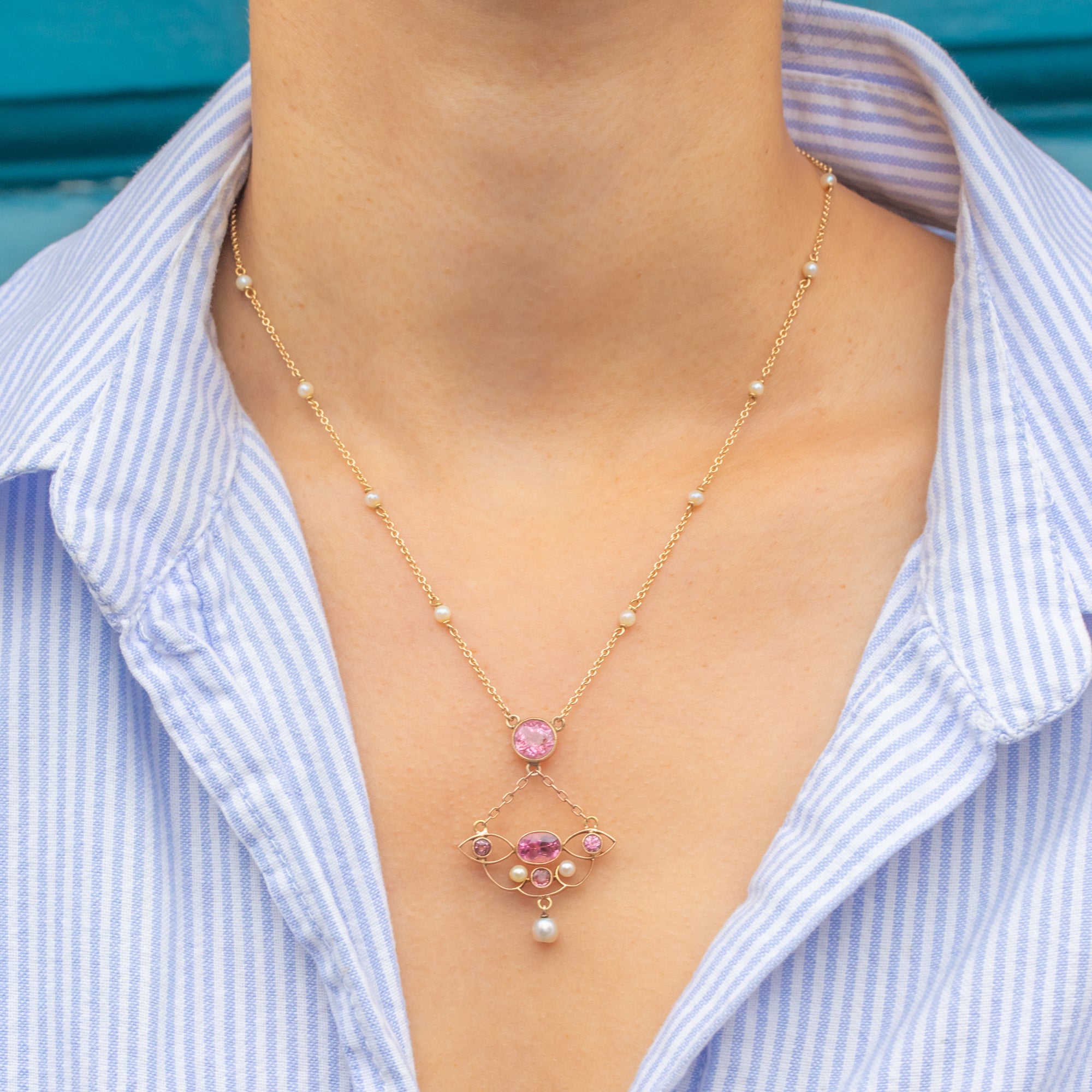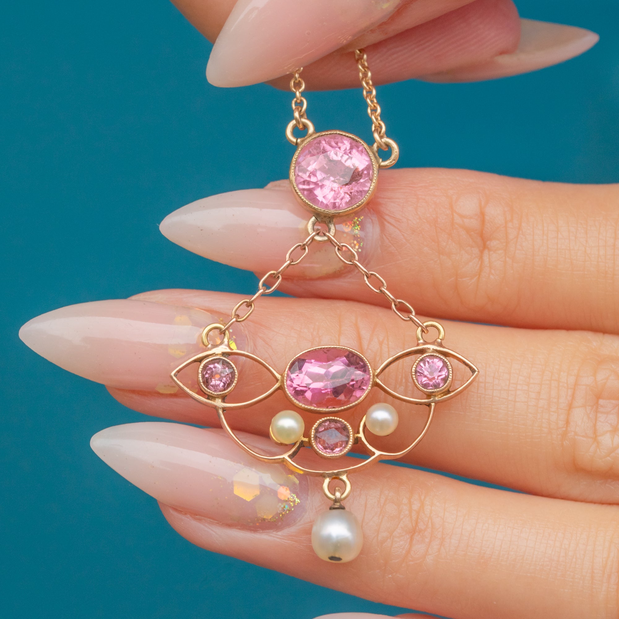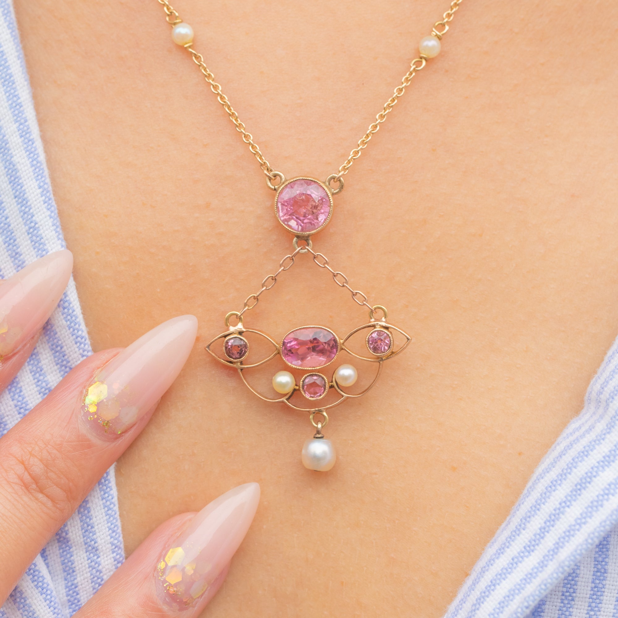 Art Nouveau 18ct Gold Pink Tourmaline Pearl Necklace