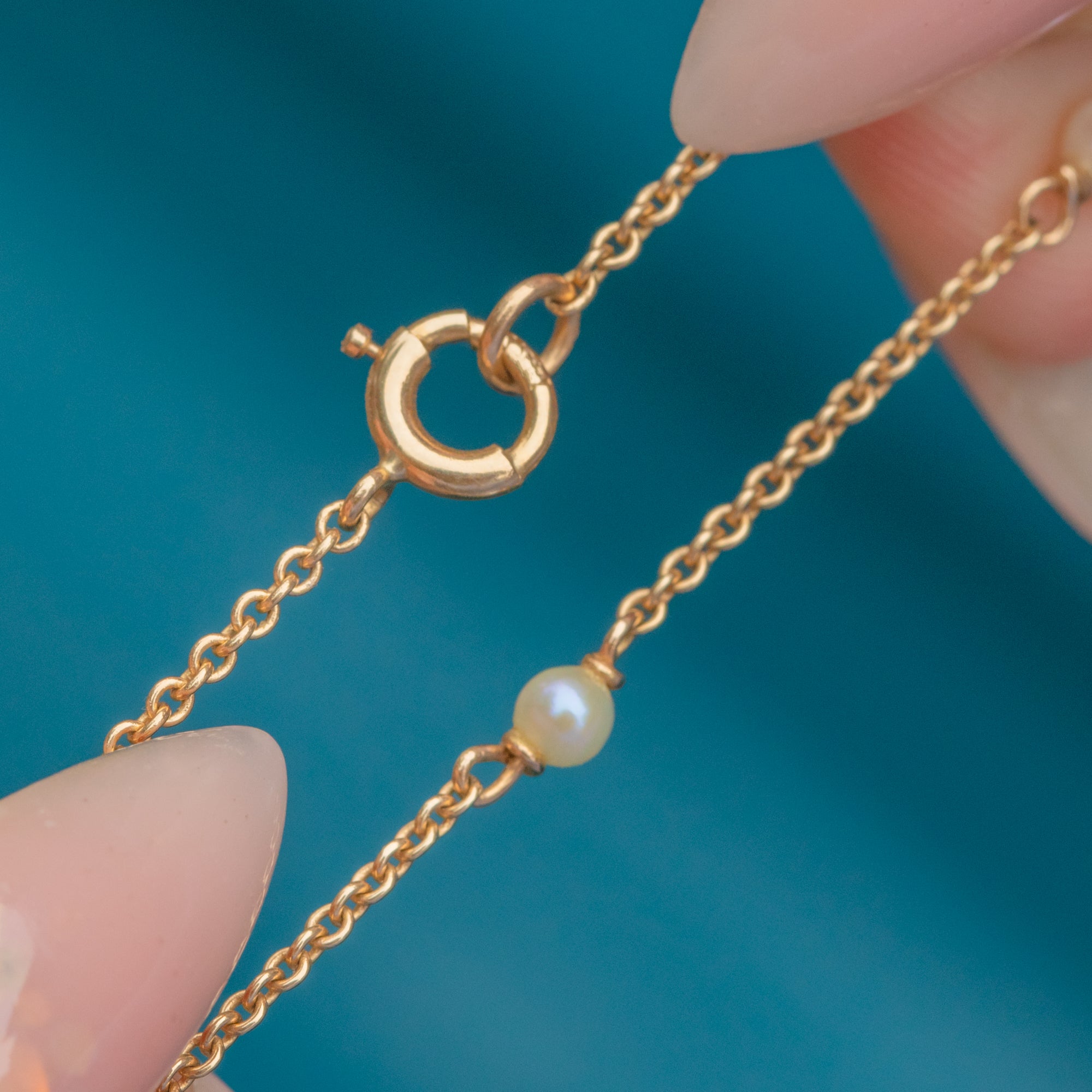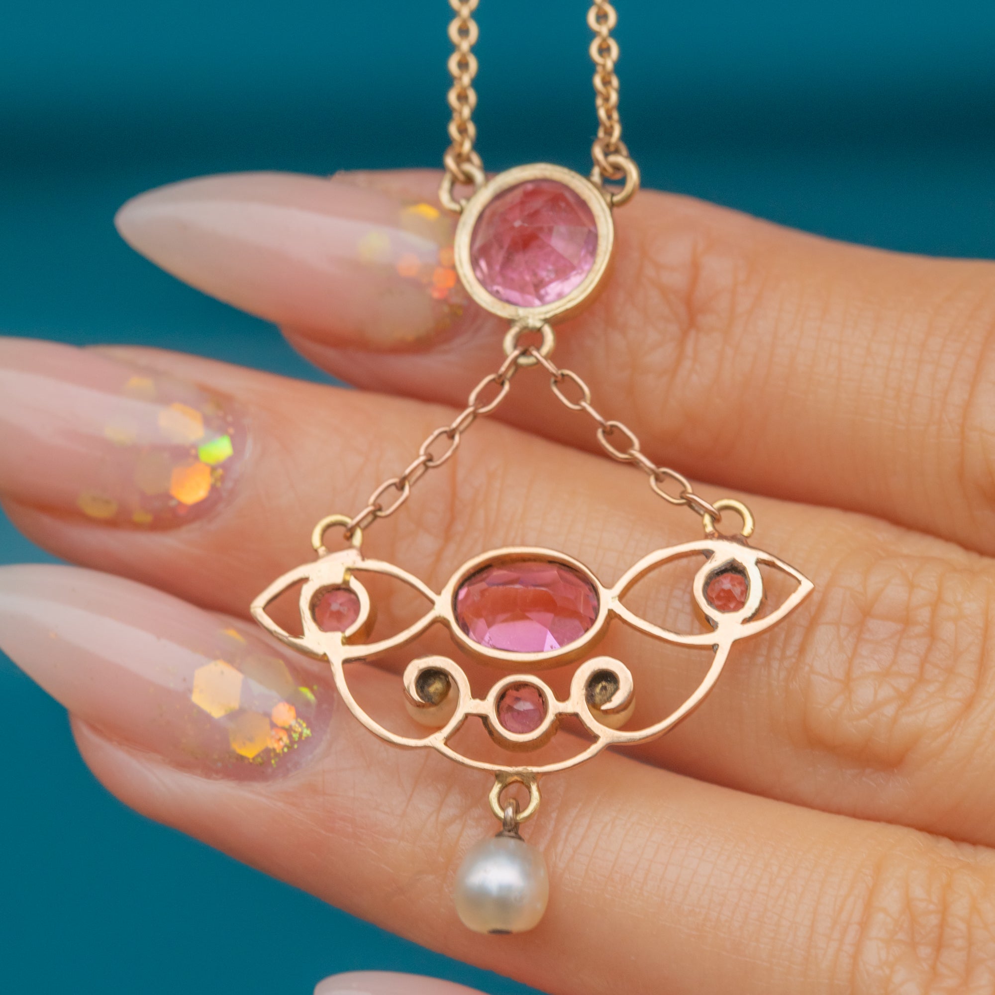 A graceful Art Nouveau necklace crafted with flowing lines and feminine detail. The openwork pendant glows with Pink Tourmalines and luminous Pearls, all set in rich 18ct Gold for a romantic, turn-of-the-century look.