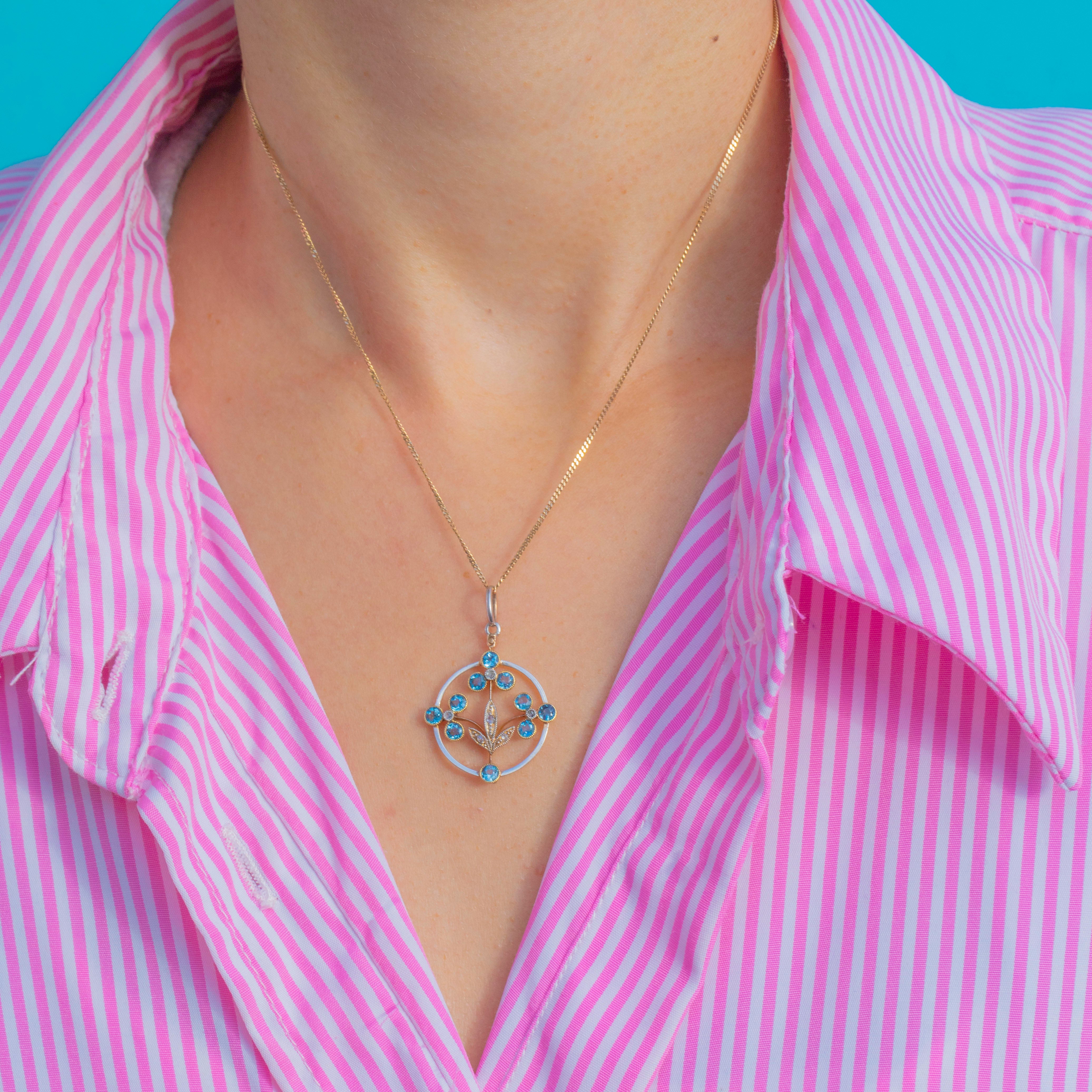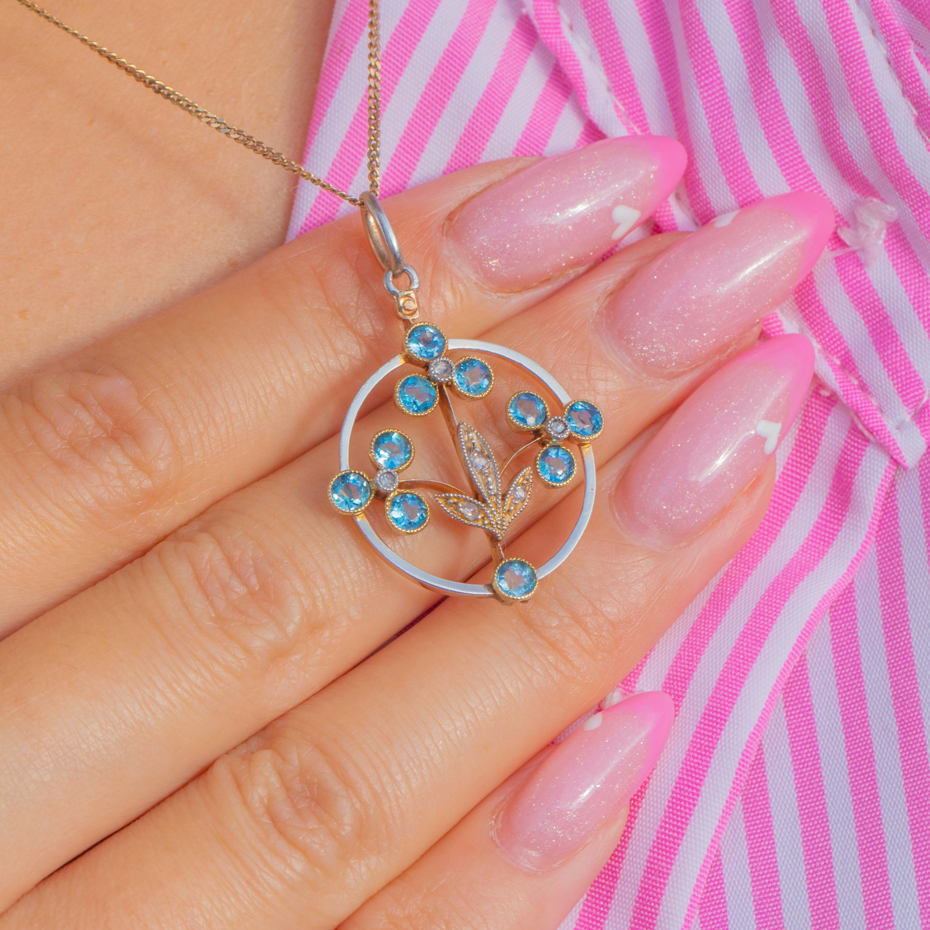 EXCELLENT: The Aquamarine is bright and clear with a delicate pastel hue, complemented by twinkling Diamonds. The Gold and Platinum settings are crisp and secure with a fine antique finish and minimal wear. A beautiful Art Nouveau pendant in outstanding condition.