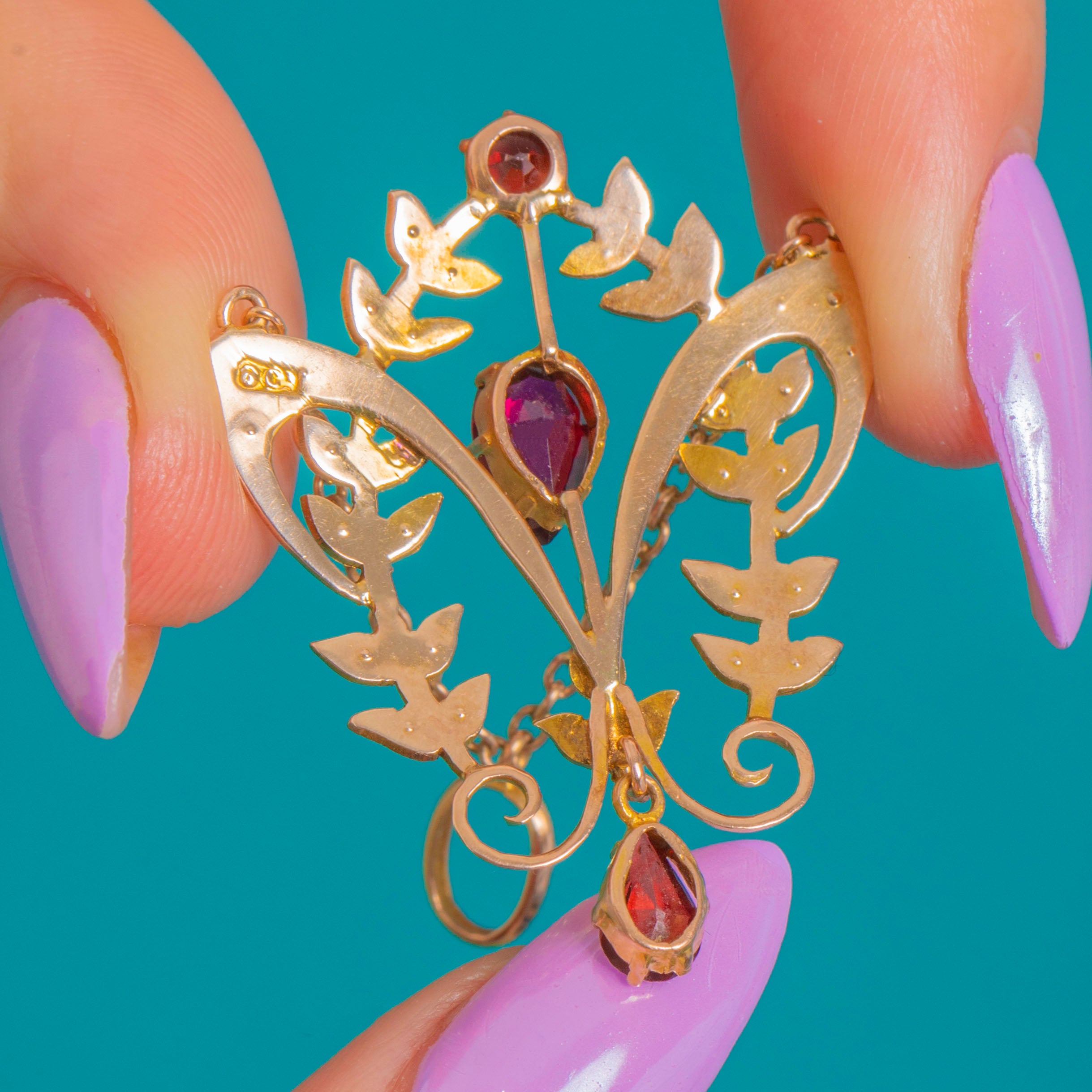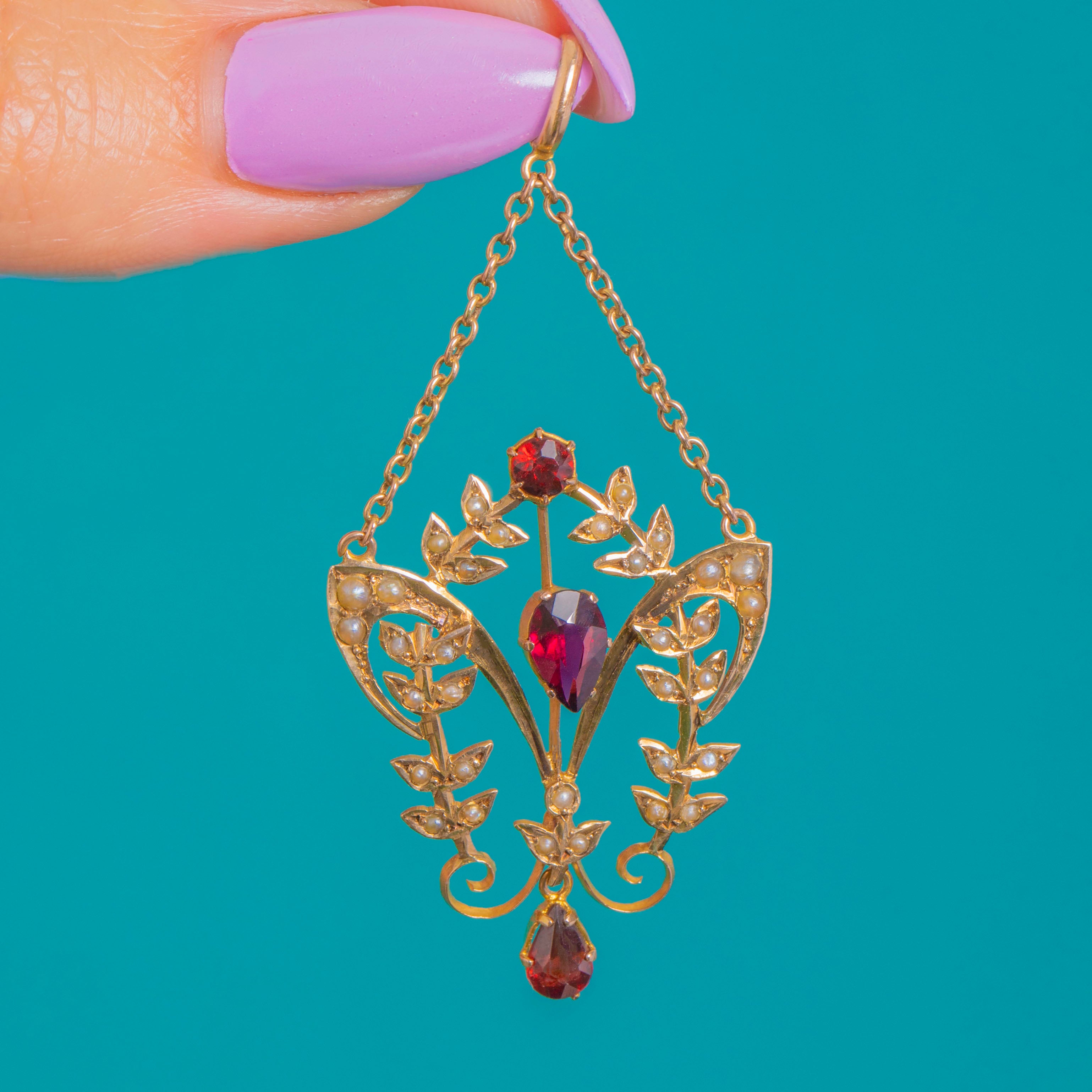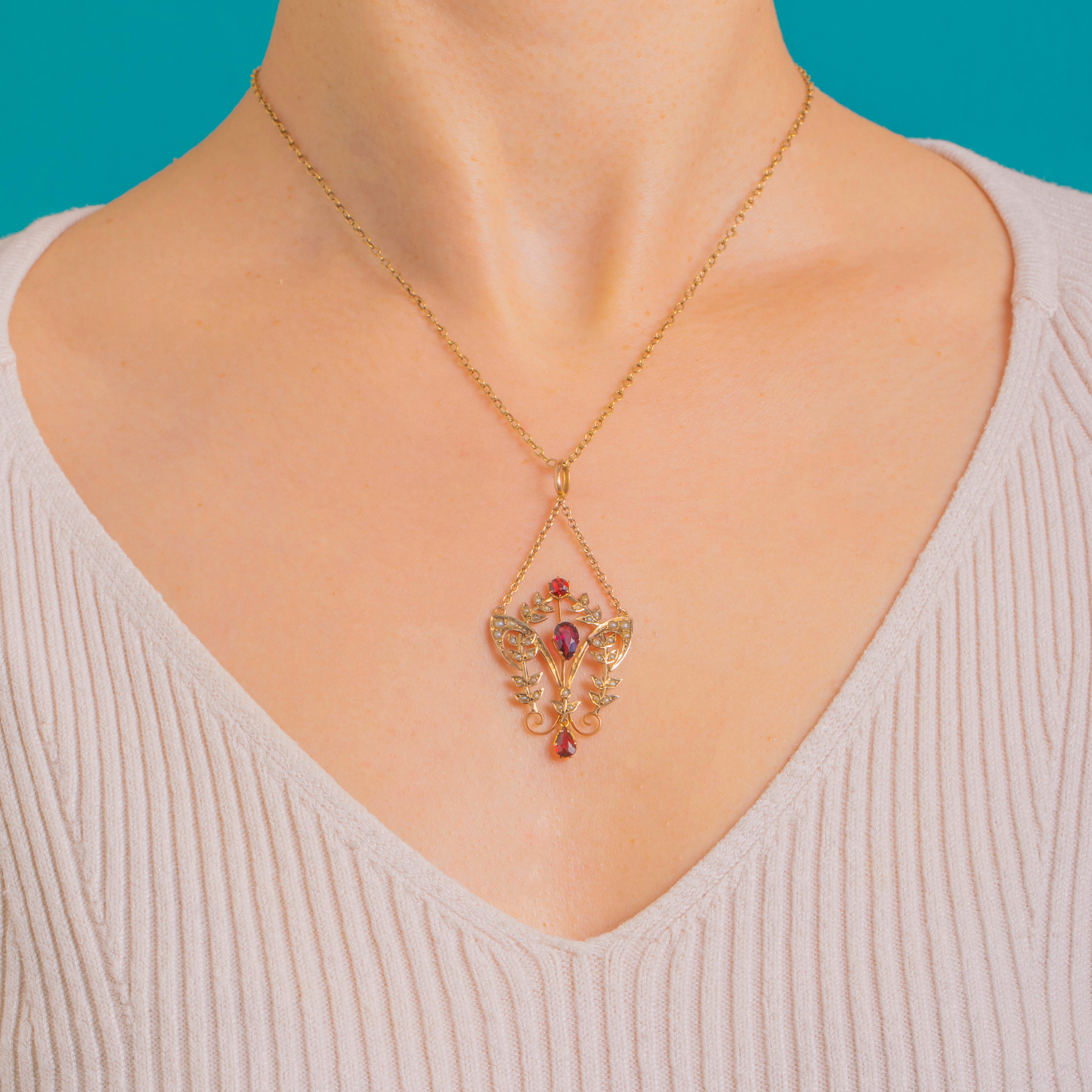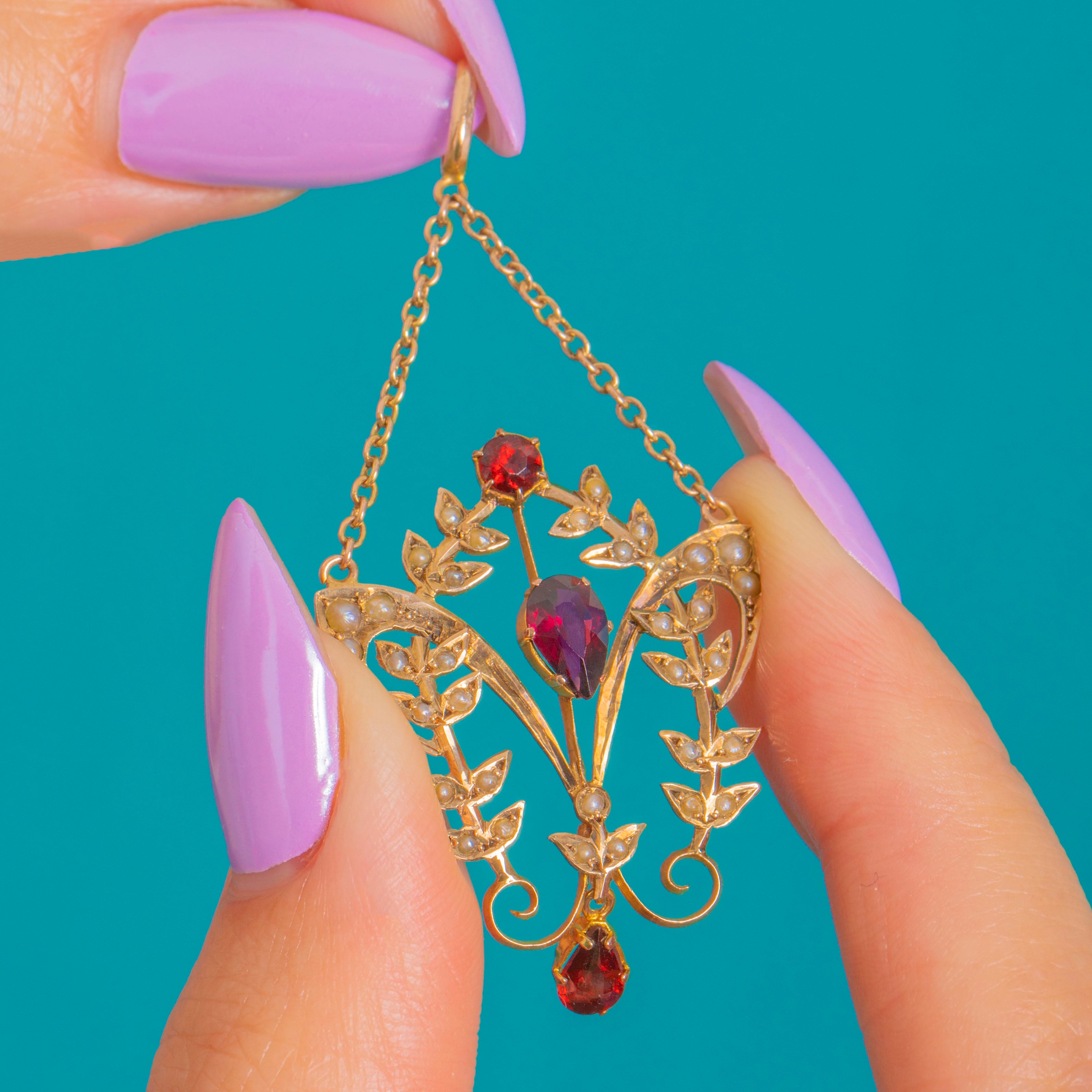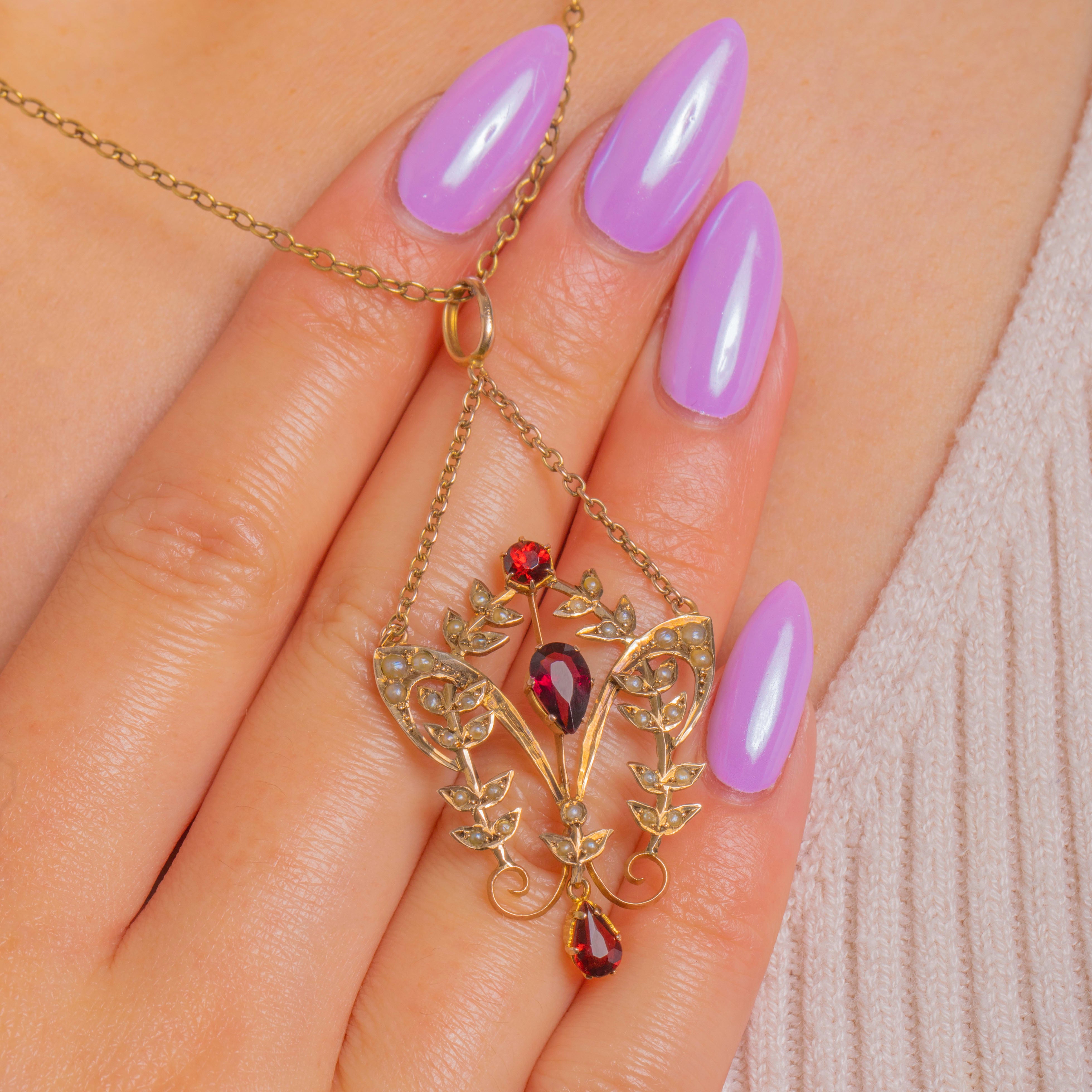 A graceful Art Nouveau lavalier pendant in warm 9ct Gold, alive with flowing foliate scrolls and dotted with luminous Seed Pearls. At its heart glow three richly hued Garnets: a round accent above, a pear-cut gem set point-up to the centre, and an articulated pear drop that sways softly with every movement, together totalling approximately 1.65ct. The openwork silhouette feels airy and romantic, with the Seed Pearls lending a soft, celestial sheen against the Gold framework.