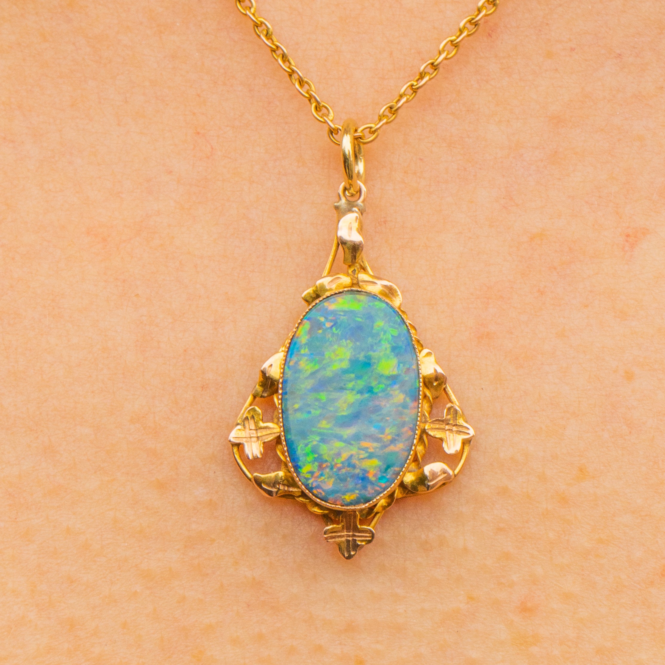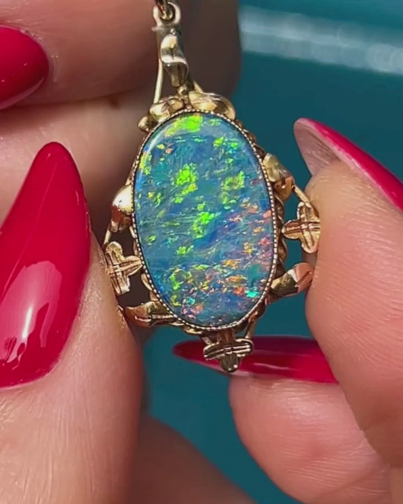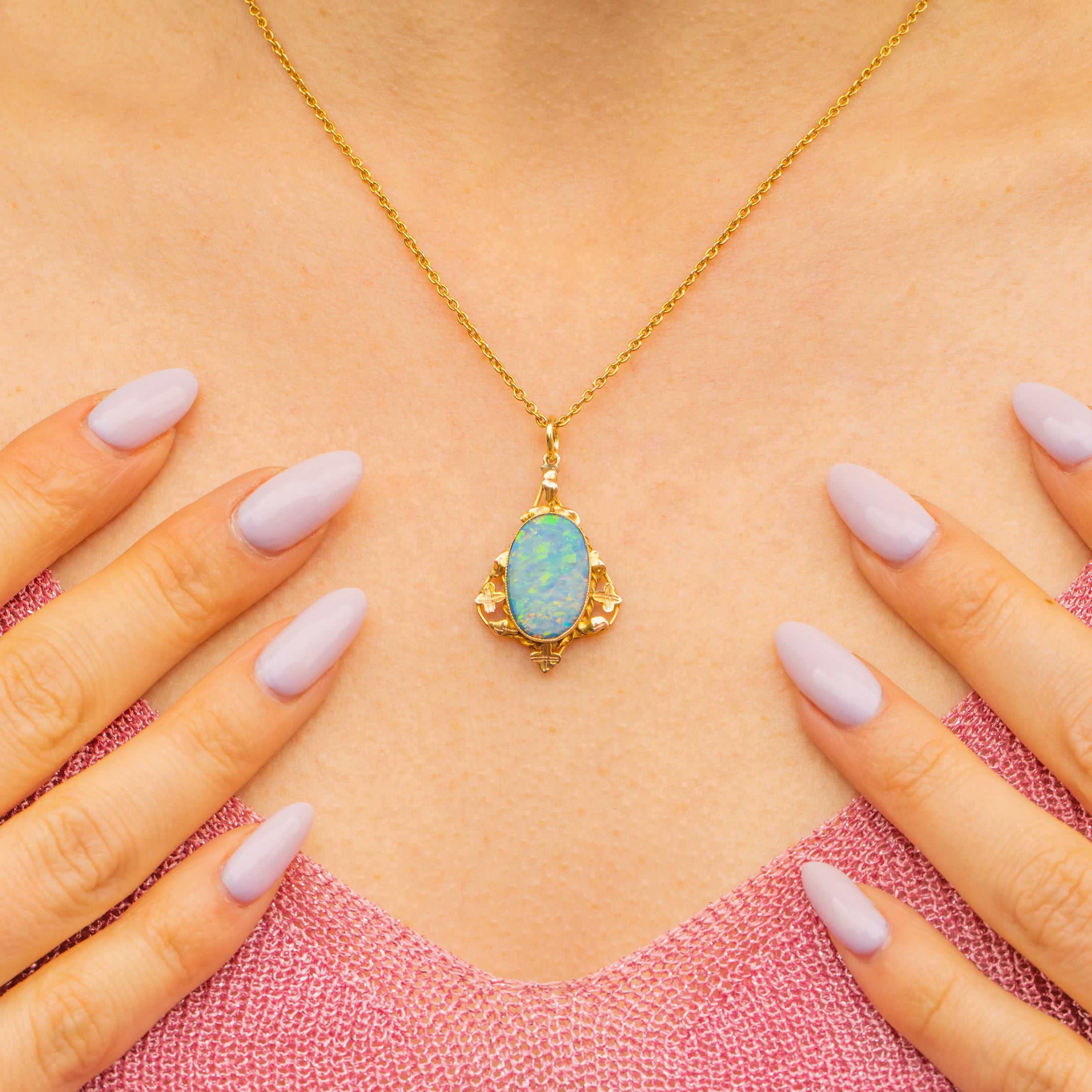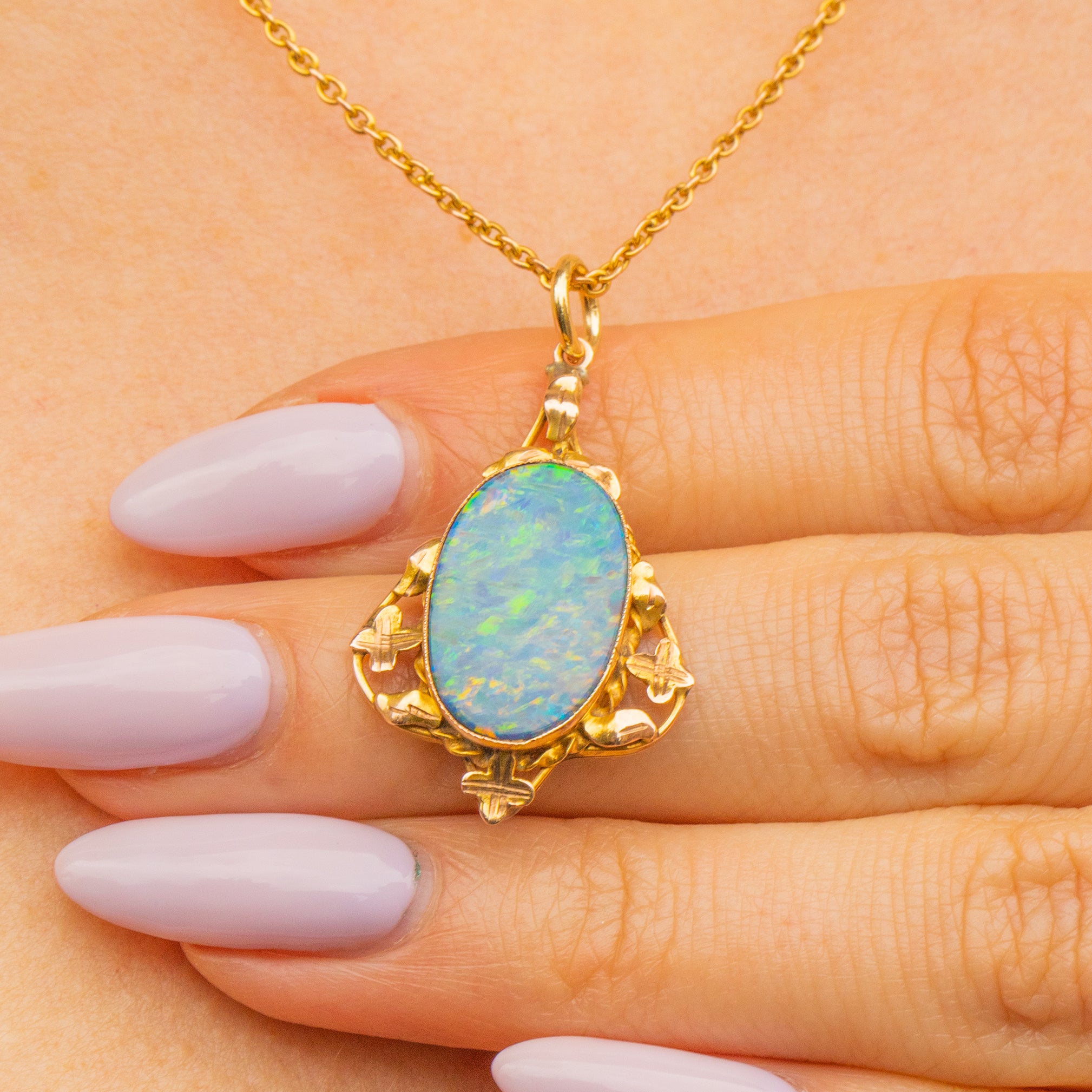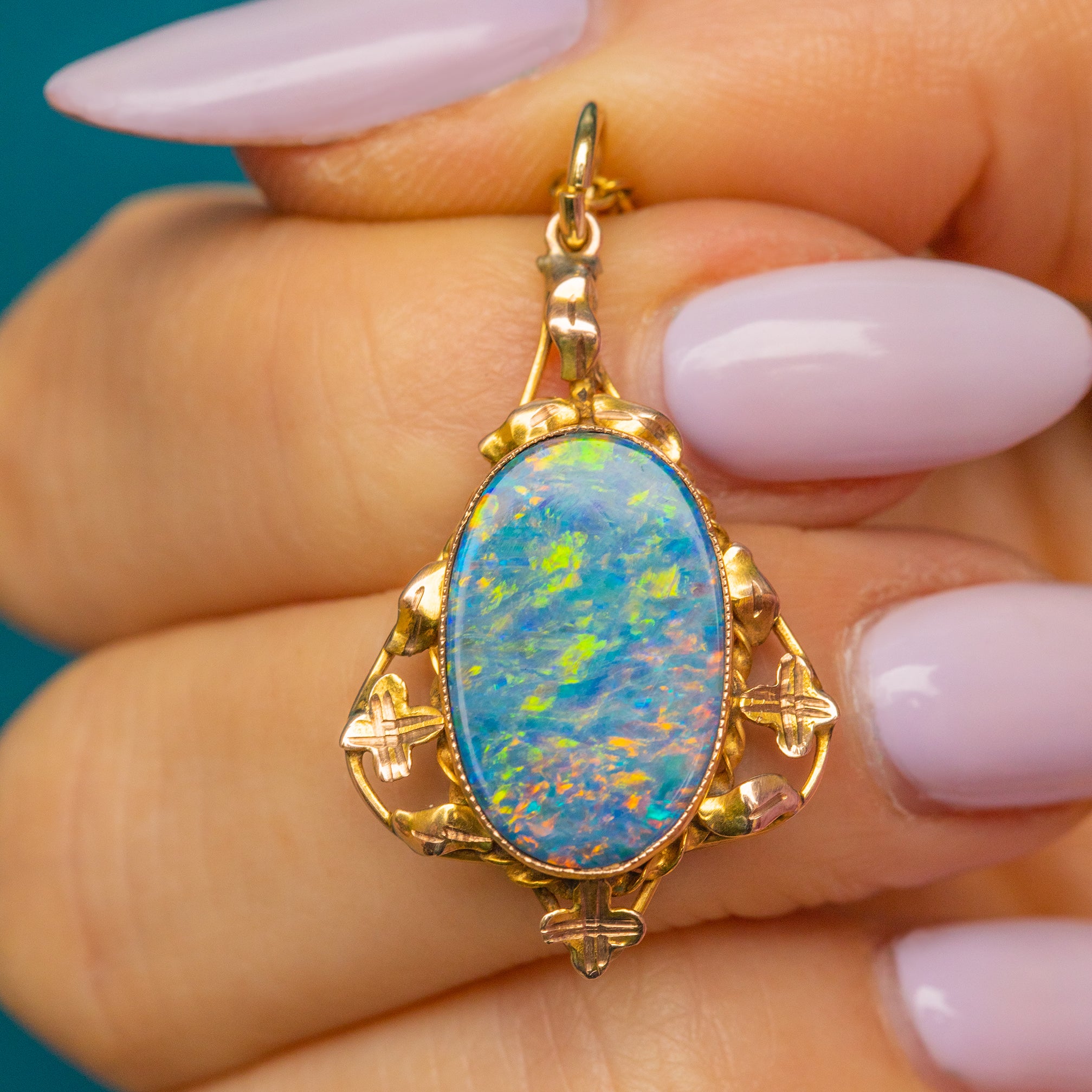 EXCELLENT. This Art Nouveau 9ct Gold Opal pendant is in fantastic condition! The Opal is smoothly cut and boasts an eye-catching combination of hues. There is some surface wear on the black backing of Opal but this cannot be seen while the pendant is worn. The Gold is buttery and the details are all firmly affixed. The solder line on the bezel setting is visible and has parted slightly, but the Opal is securely set. The generously sized jump ring will allow you to suspend this phenomenal antique Opal pendant from a chain of your choice with ease!