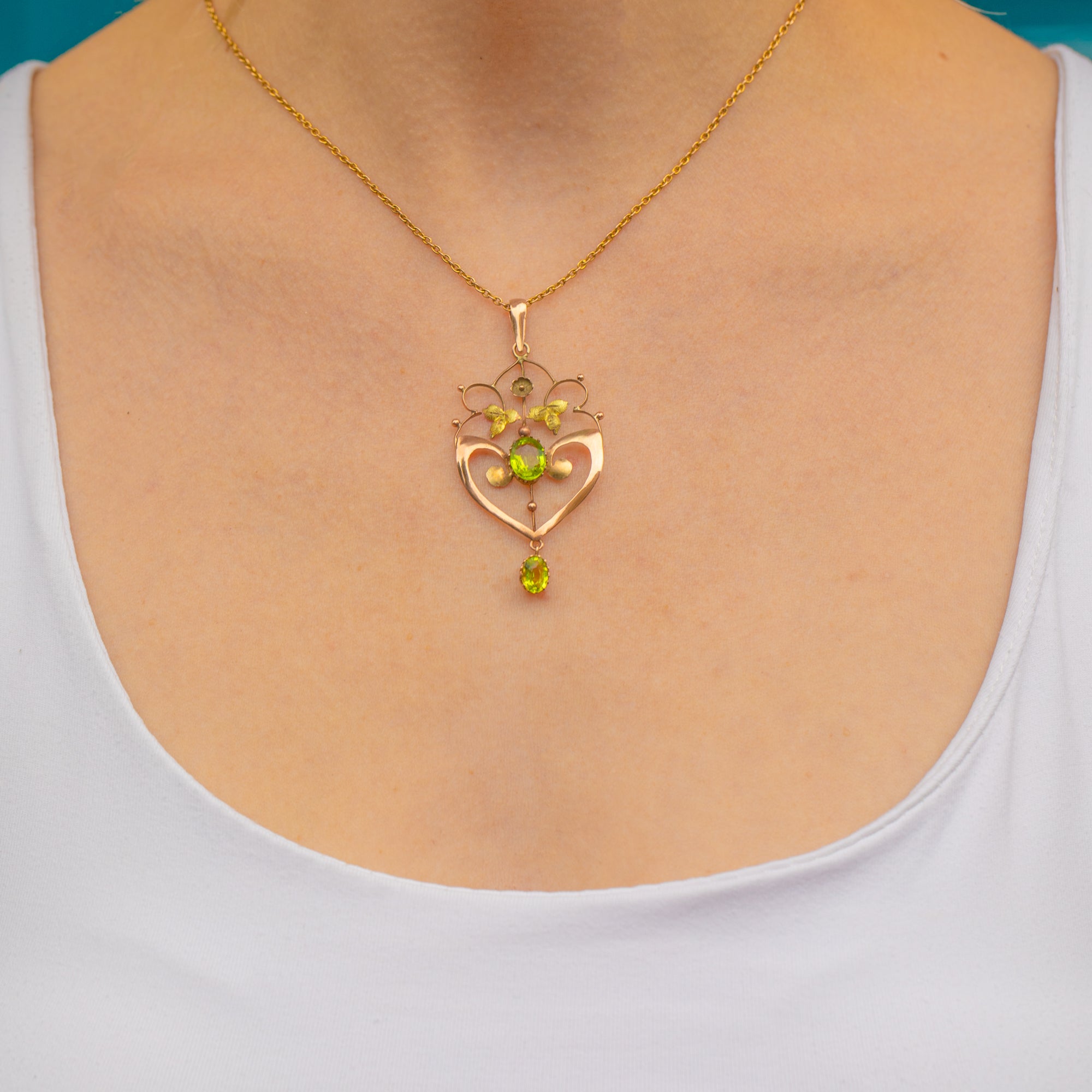 EXCELLENT. This Art Nouveau 9ct Gold Peridot lavalier pendant is in excellent condition! Each Peridot are secure within their settings, with not damage to note. The Gold is perfectly formed and possesses wonderful reflective qualities. With a modestly sized jump-ring, you can suspend this Art Nouveau pendant from a variety of chains!