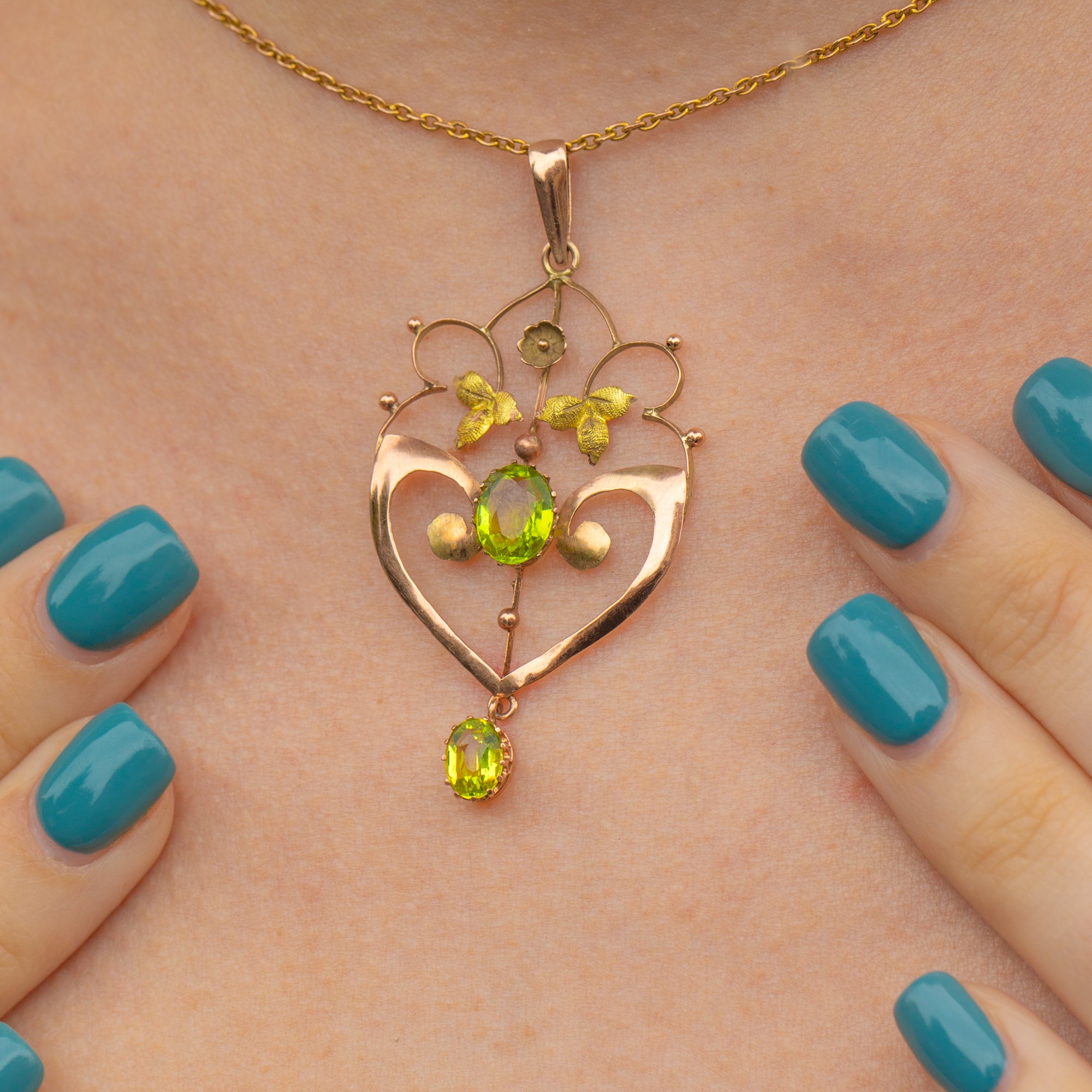 A whimsical Art Nouveau 9ct Gold Peridot Lavalier pendant! Her buttery 9ct Gold framework flaunting ivy motifs and elegant designs homes an apple green Peridot at the centre.