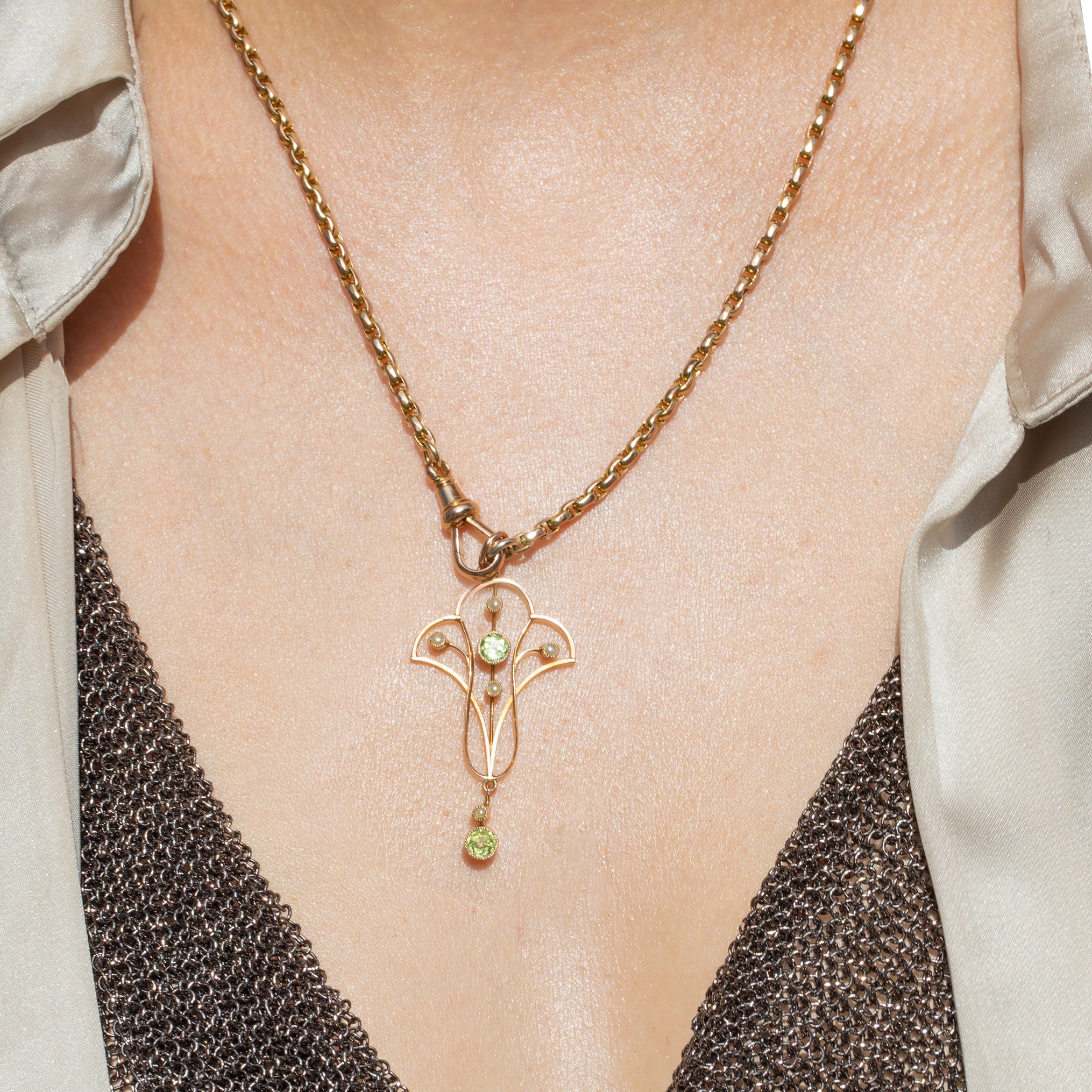 EXCELLENT. This Art Nouveau 9ct Gold Peridot Pearl lavalier pendant is in excellent condition! Each Peridot and Pearl are secure within their settings, with not damage to note. The Gold is perfectly formed and possesses wonderful reflective qualities. With a modestly sized jump-ring, you can suspend this Art Nouveau pendant from a variety of chains!