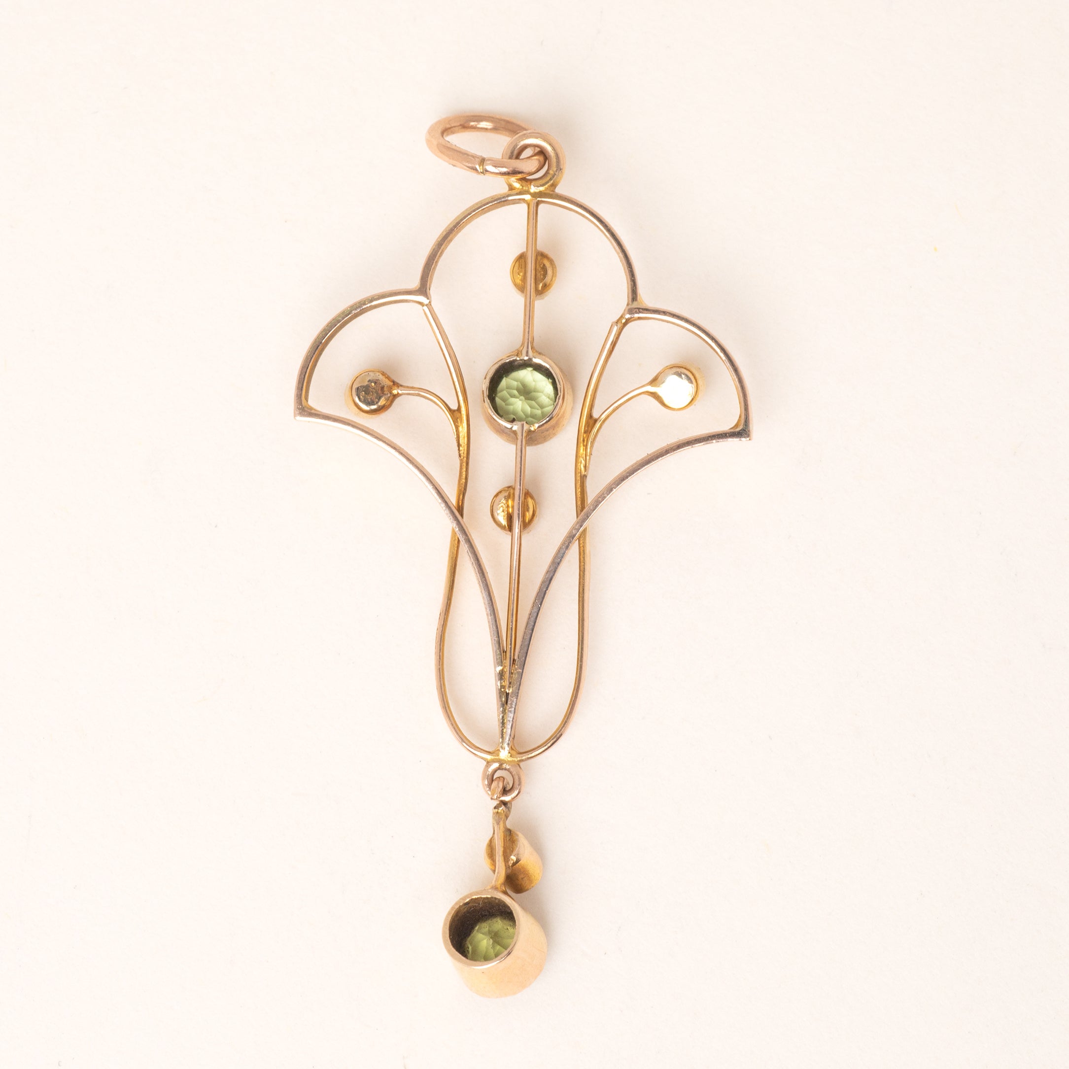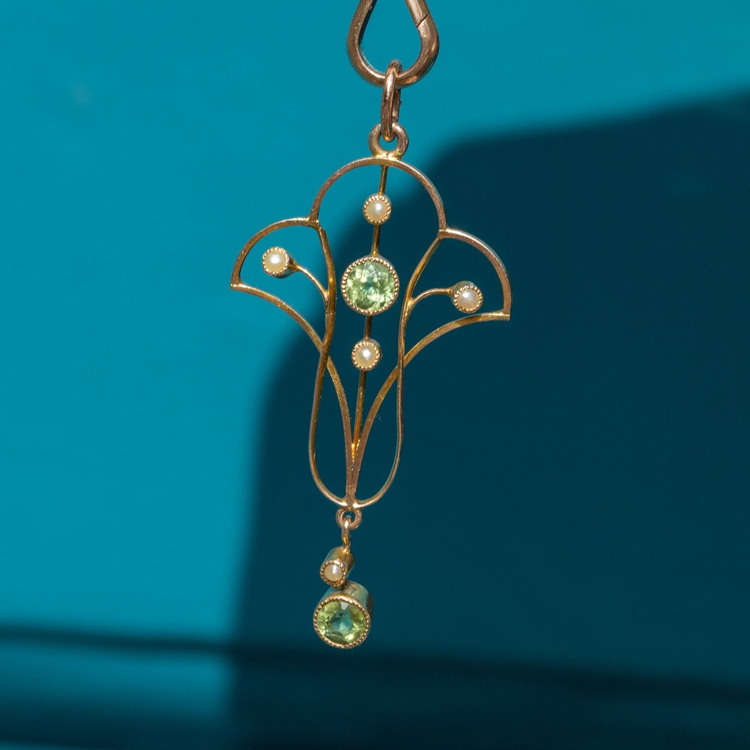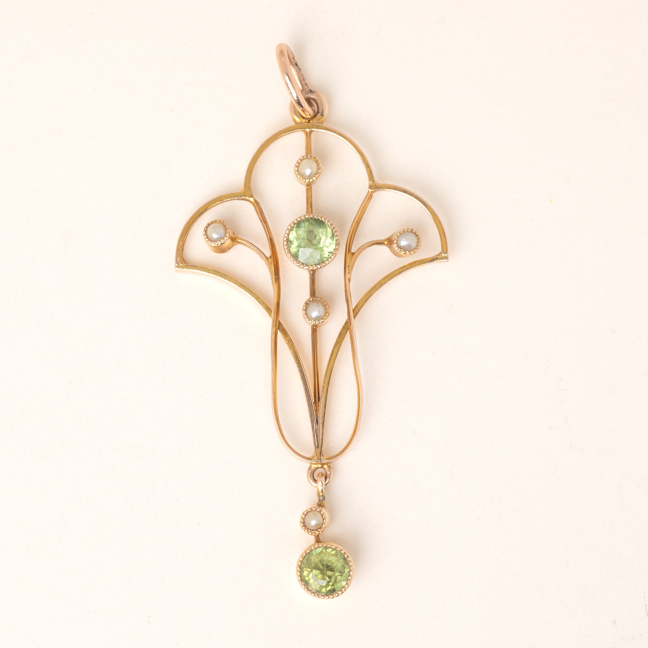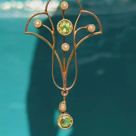 Art Nouveau 9ct Gold Peridot Pearl Lavalier Pendant