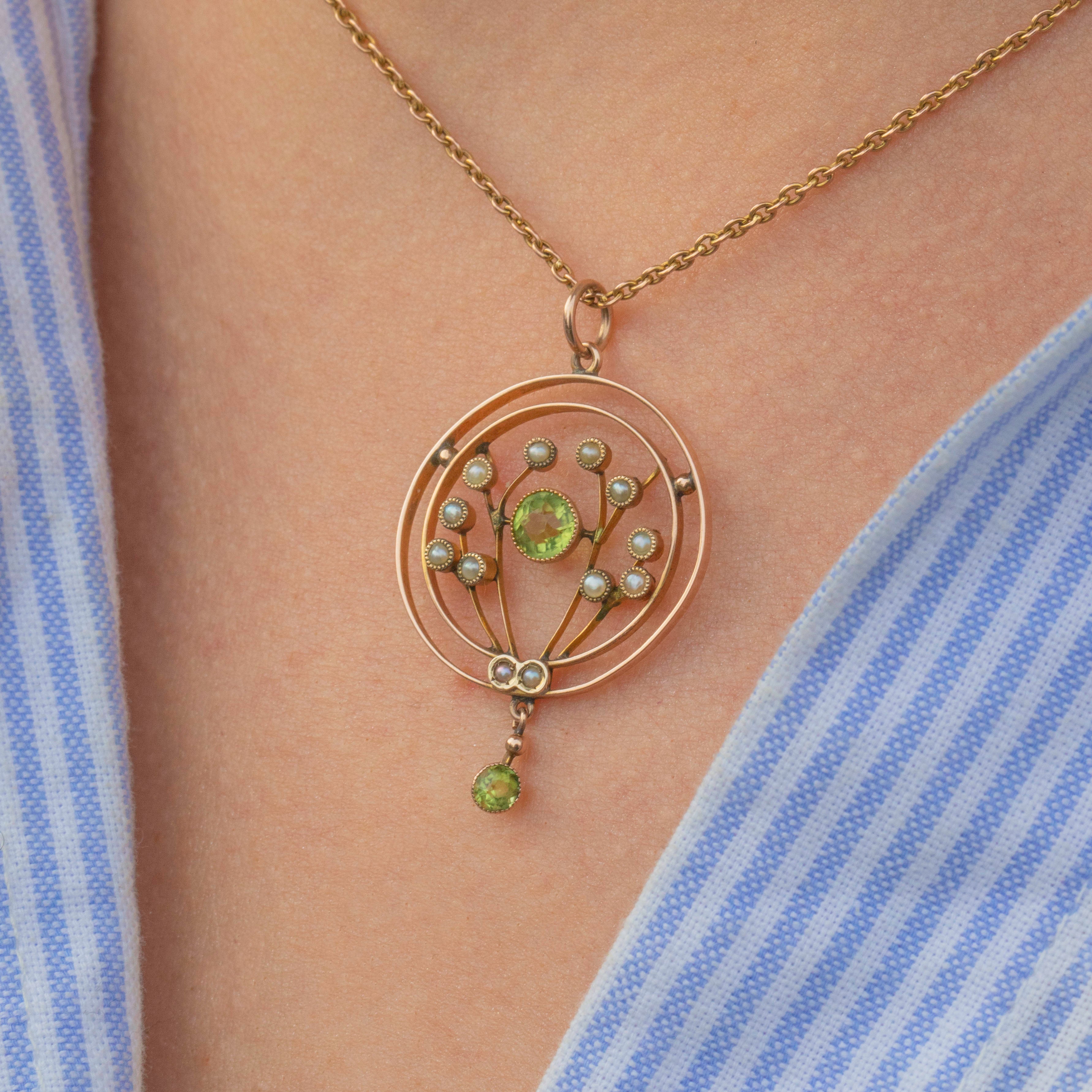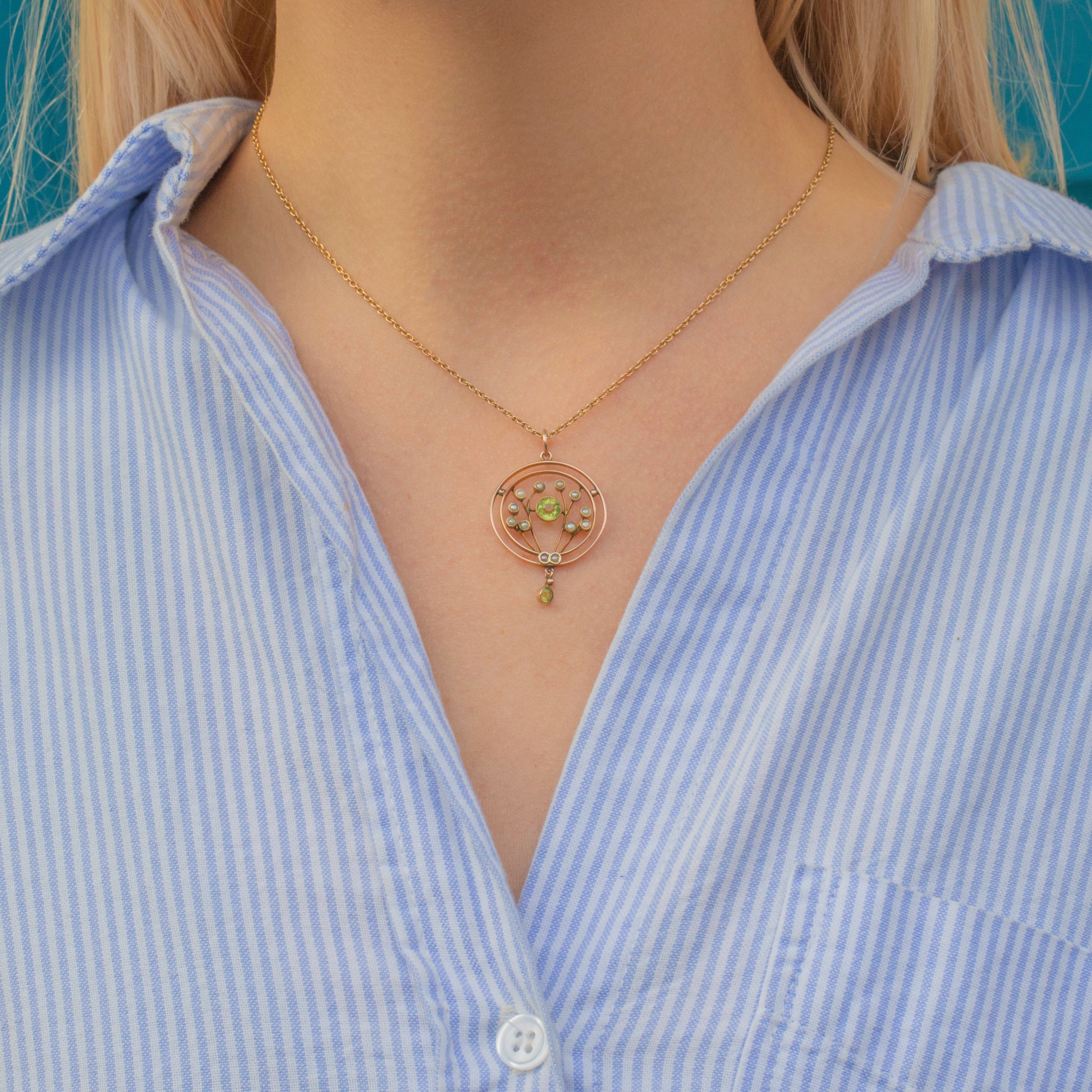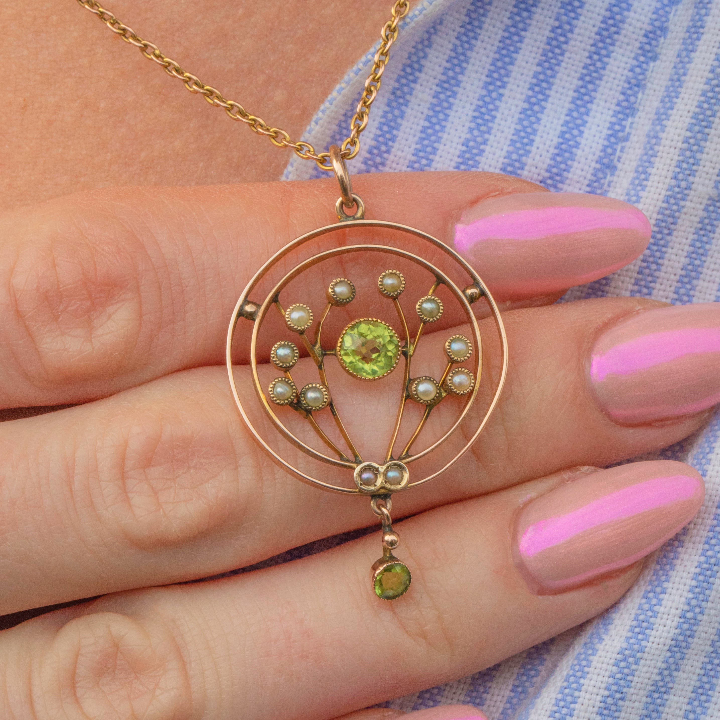 This pretty Art Nouveau 9ct Gold Peridot Pearl pendant will bring a decorative flourish to your outfit! Crafted from solid 9ct Gold, this antique pendant is set with two zesty Peridot gems and a sprinkling of lustrous Pearls in a classic roundel design.