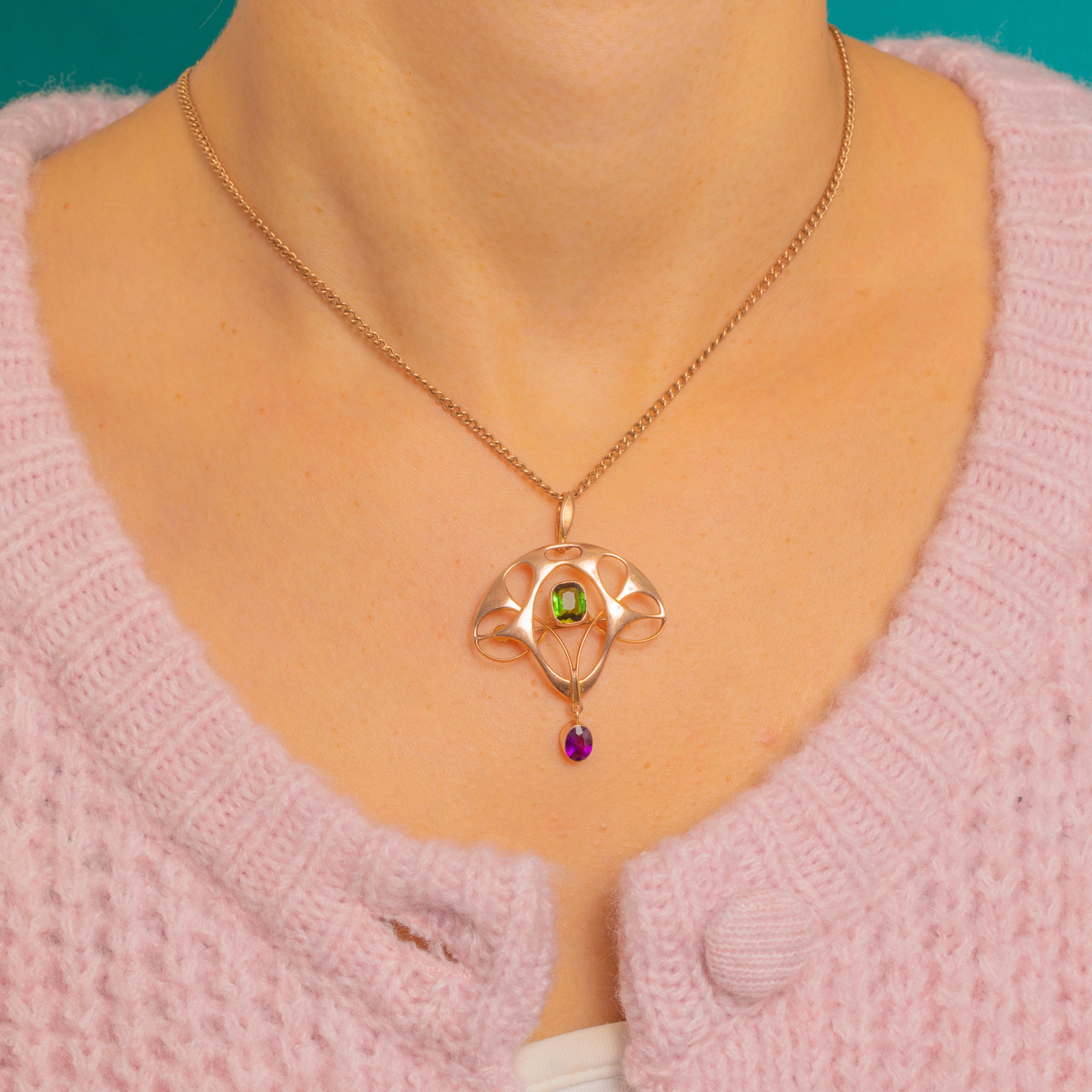 Sinuous and elegant, this Art Nouveau convertible brooch-pendant is crafted in 9ct Gold with beautifully airy openwork and flowing “whiplash” curves. A bright green Tourmaline sits at the heart in a neat bezel, while an articulated oval Amethyst drop lends a graceful movement and a final kiss of colour.