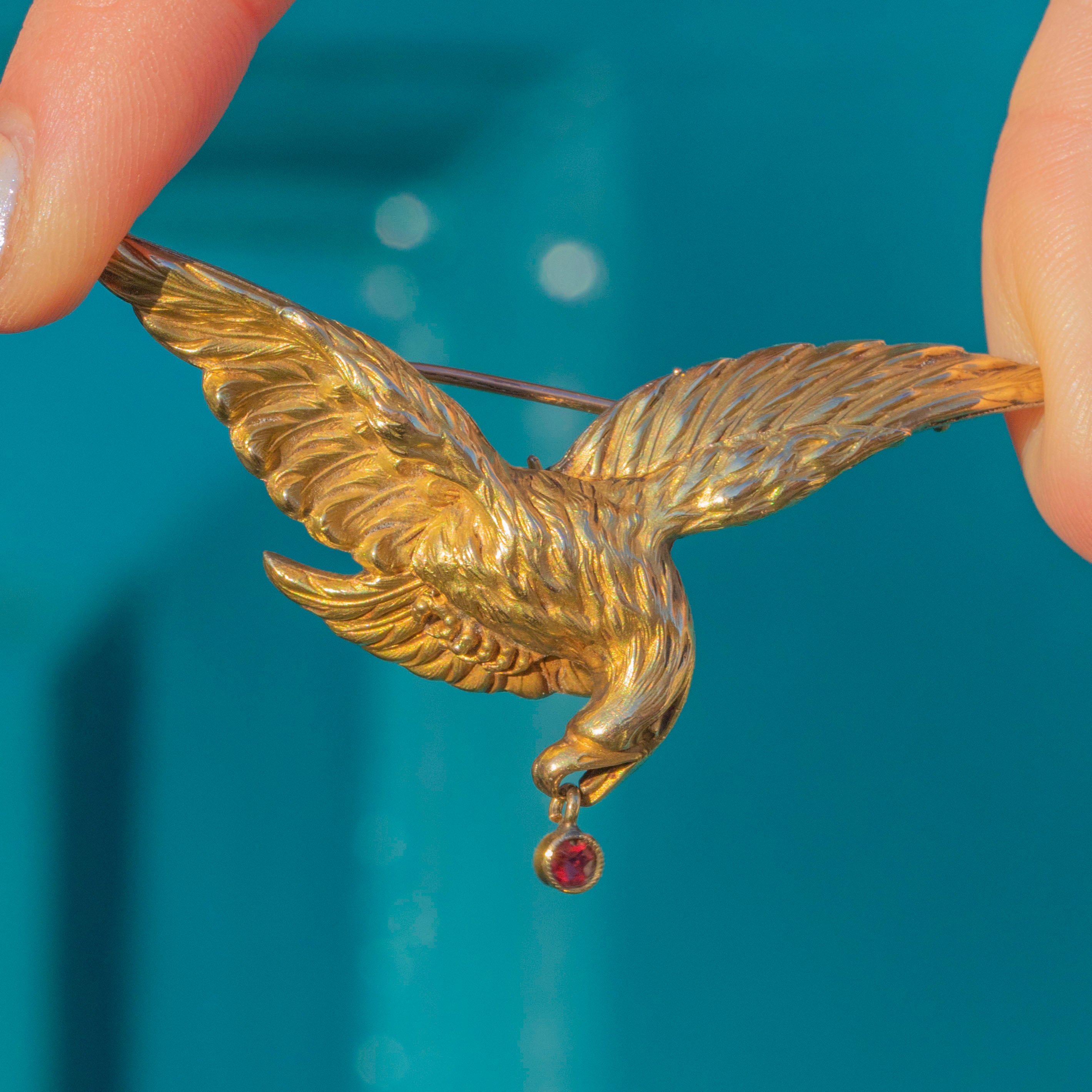 EXCELLENT. An excellently presented Art Nouveau French Gold fix eagle brooch with Garnet drop. This brooch is incredibly alluring, and has very little sign of wear. The brooch has been beautifully formed, and its c-clasp and pin work perfectly in harmony together. The dainty Garnet makes for a classy pop of colour.
